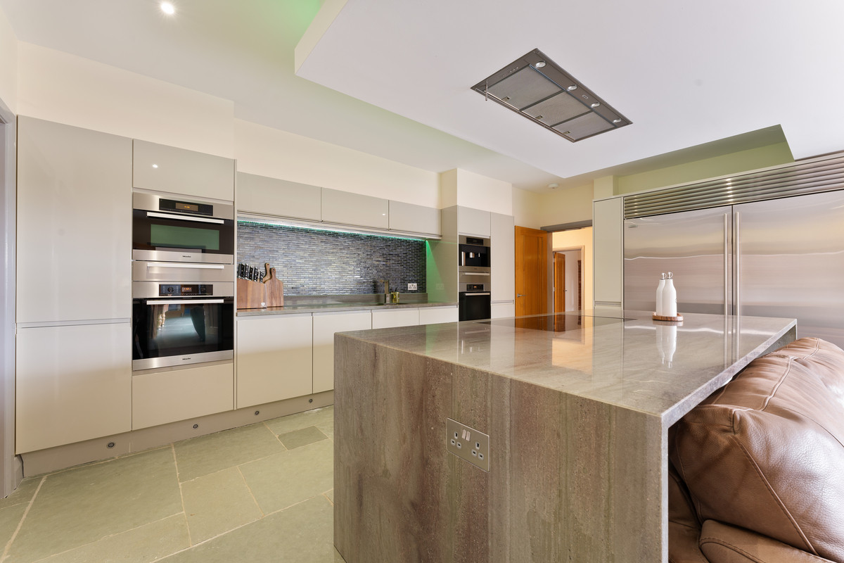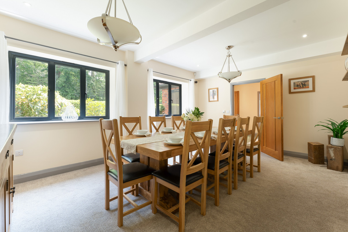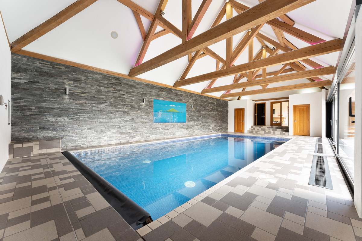 The expansive interior is both versatile and beautifully finished, comprising a welcoming entrance hall, a separate study, a formal dining room, and an elegant sitting room with an inglenook fireplace and wood burner. At the heart of the home lies a striking open-plan kitchen and dining space, complete with bi-fold doors to the garden, a central island, premium appliances, and adjoining utility and larder rooms. The ground floor further impresses with a large indoor heated swimming pool (10m x 5m) housed beneath a vaulted ceiling, flanked by a pool lobby/games room, and supported by shower facilities, WC, and plant room.