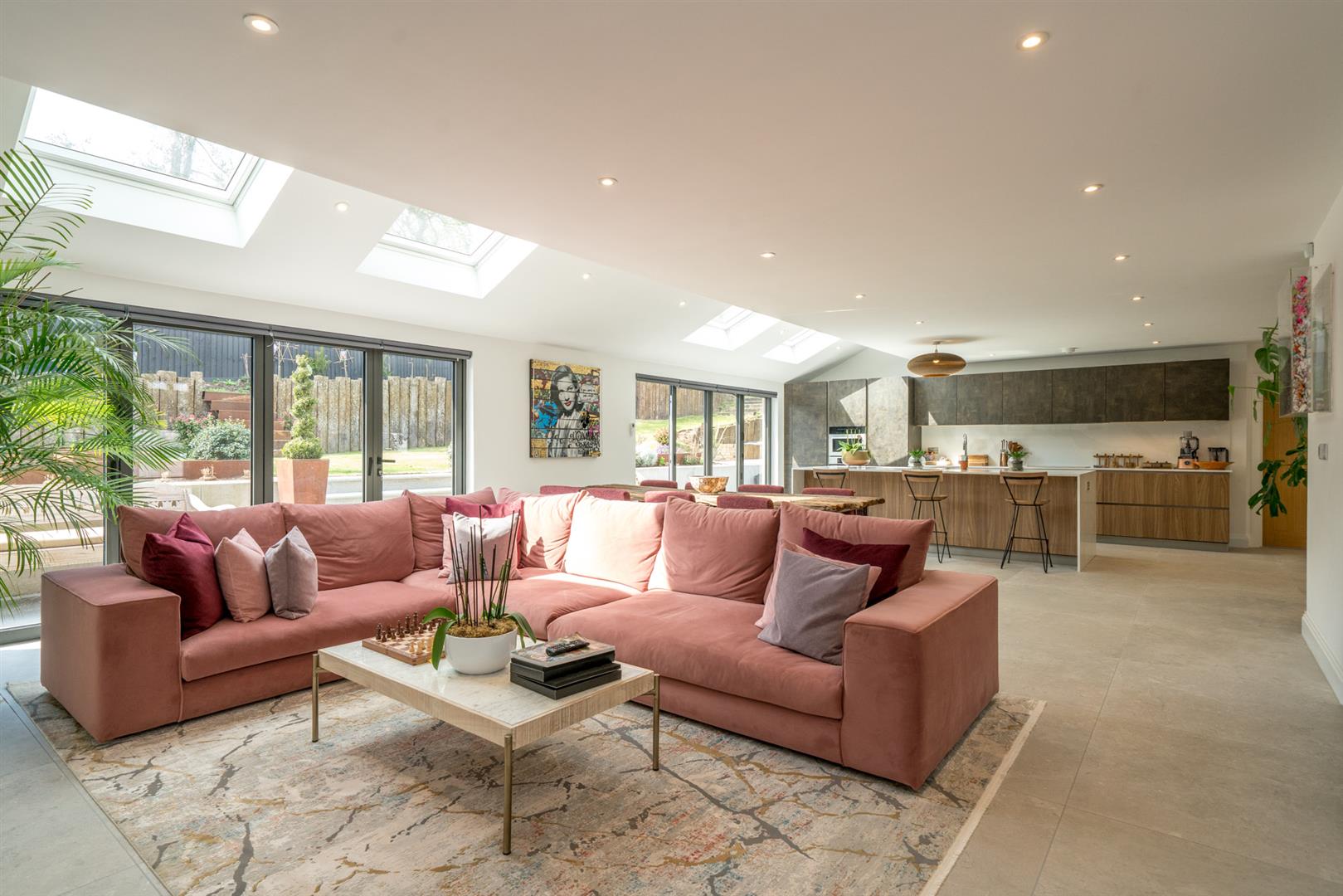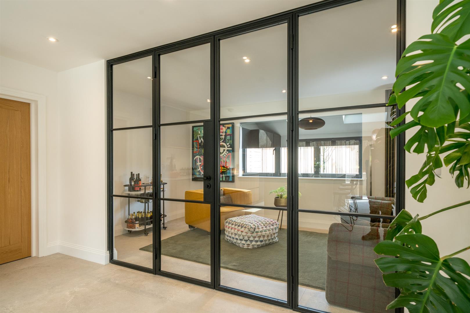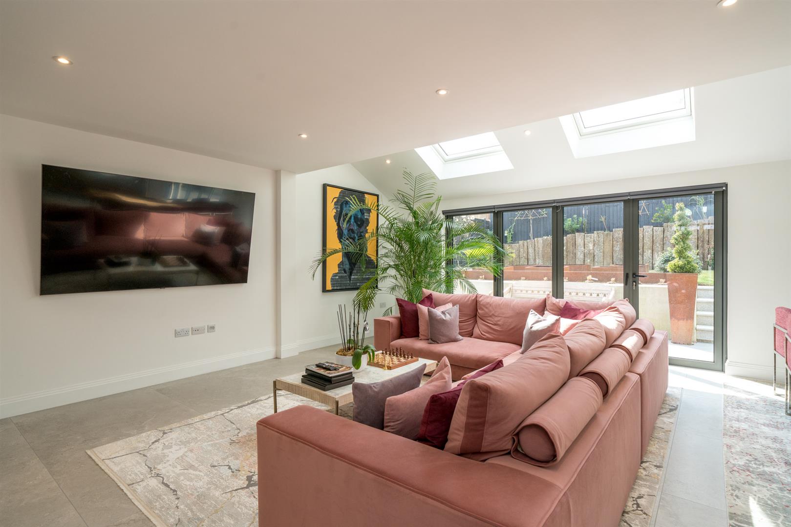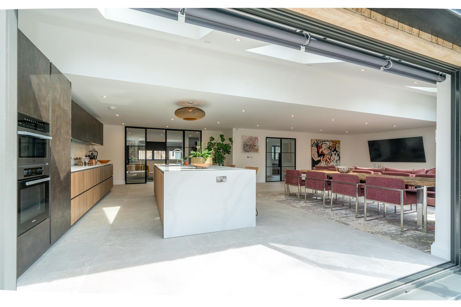 On the ground floor, there is a spacious reception hall with black Crittall entrance doors leading to a substantial open plan kitchen, fitted with electric Velux skylights and Miele appliances in both the kitchen and utility room. The family room opens onto a tiled patio and individually landscaped gardens through bi-fold doors, while additional rooms offer flexibility for a playroom, study, or library.