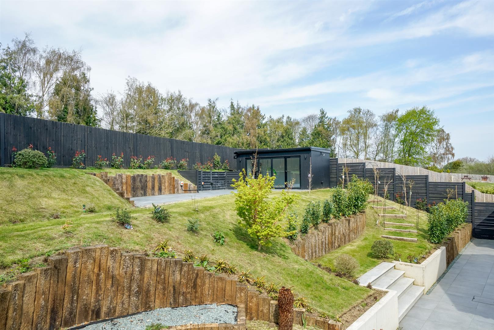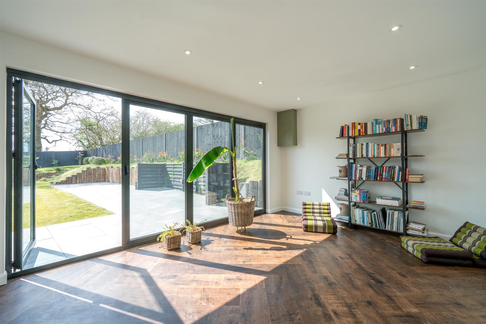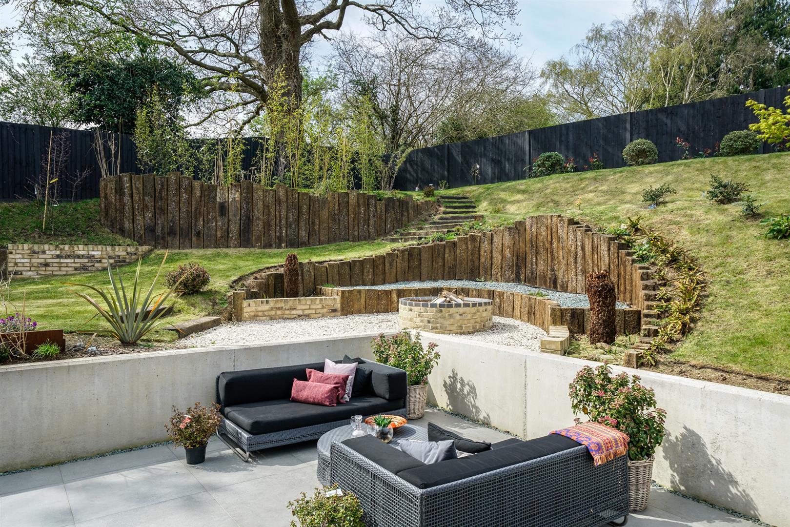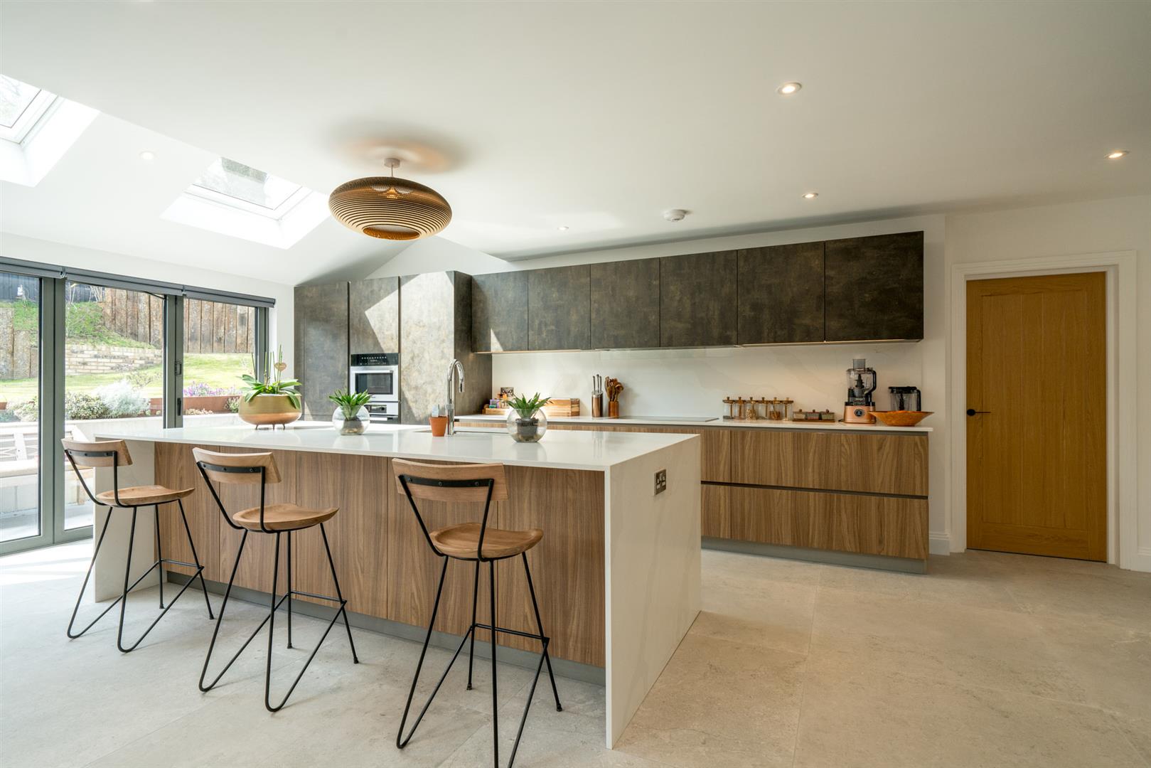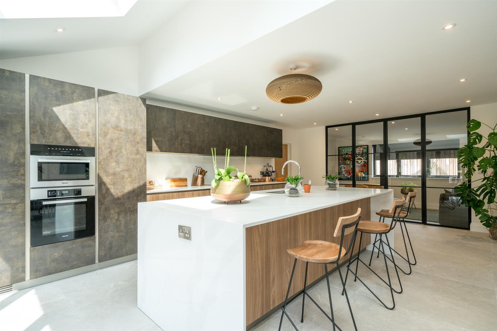 On the ground floor, there is a spacious reception hall with black Crittall entrance doors leading to a substantial open plan kitchen, fitted with electric Velux skylights and Miele appliances in both the kitchen and utility room. The family room opens onto a tiled patio and individually landscaped gardens through bi-fold doors, while additional rooms offer flexibility for a playroom, study, or library.