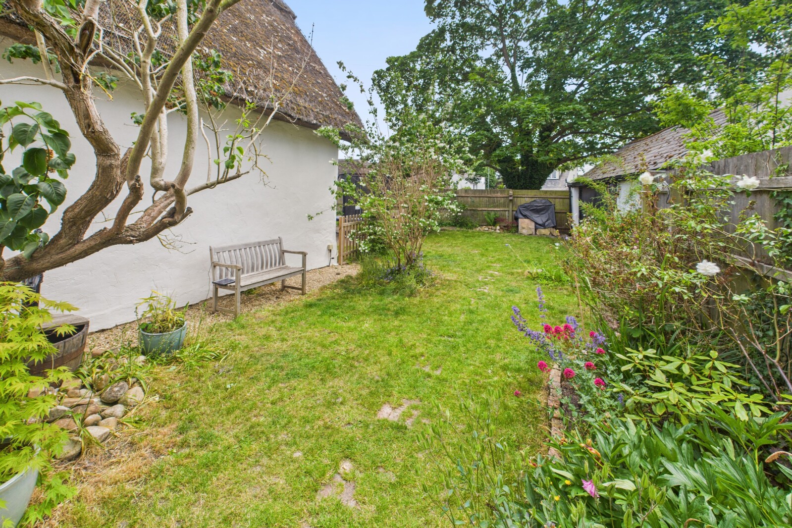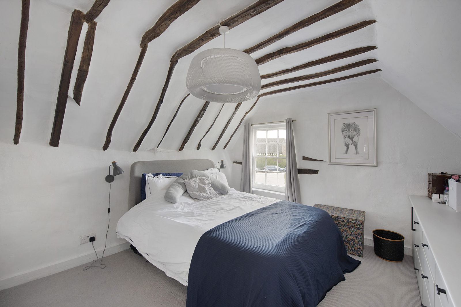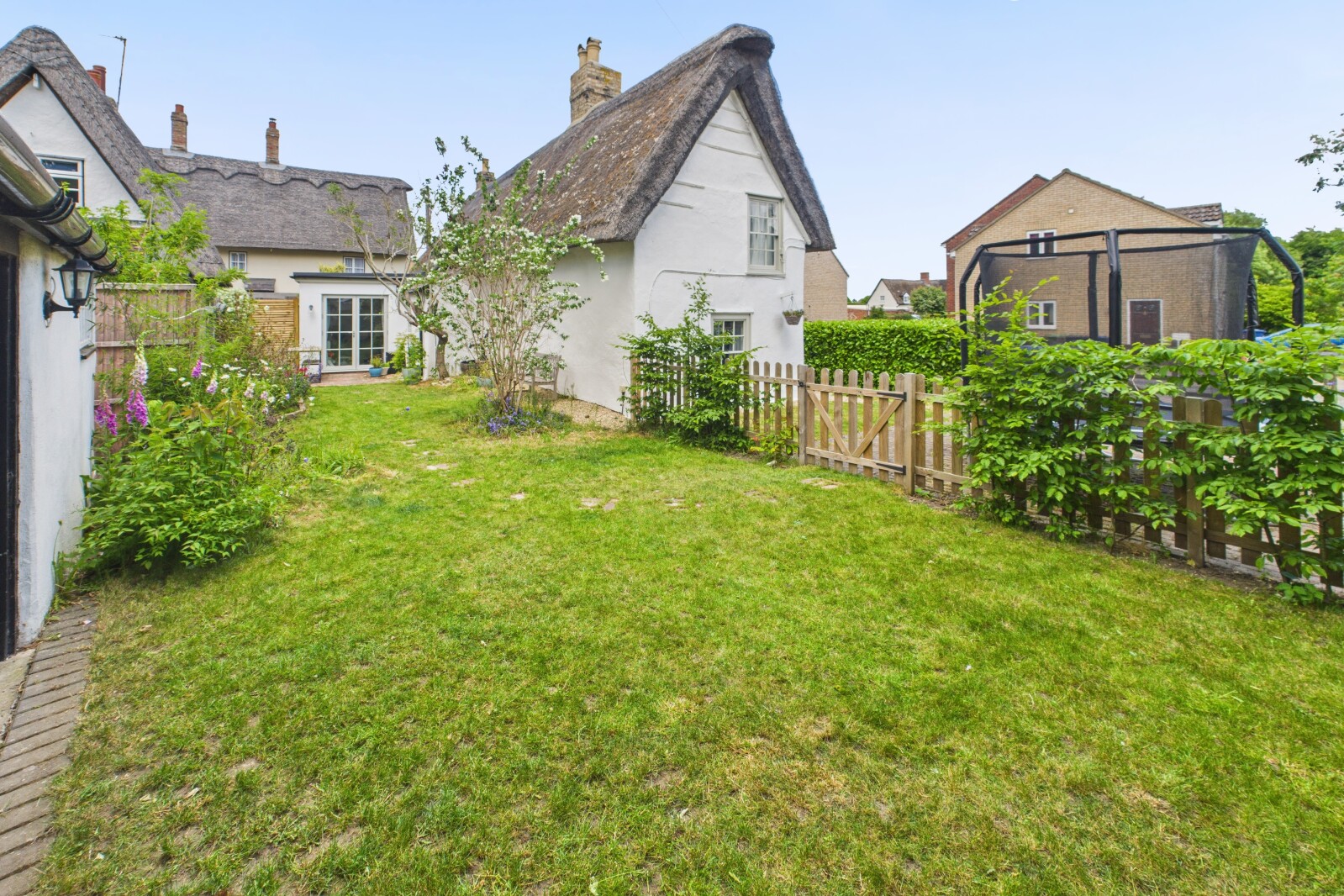 One of the things I love most about Long Thatch is the balance between old and new. The original beams and fireplaces blend beautifully with the modern updates. Our main bedroom is a peaceful retreat, decorated in soft white and grey tones, with newly fitted wardrobes and drawers and a large window overlooking the picturesque thatched cottages of the village. The kitchen maintains a modern cottage feel and opens into our new garden room extension, creating a bright and airy space while still retaining the cosy charm of cottage living. The garden has been thoughtfully extended, with a new patio built using rustic old bricks. Sitting outside in the summer, surrounded by other thatched roofs and listening to the historic planes from Duxford flying overhead, feels truly special.