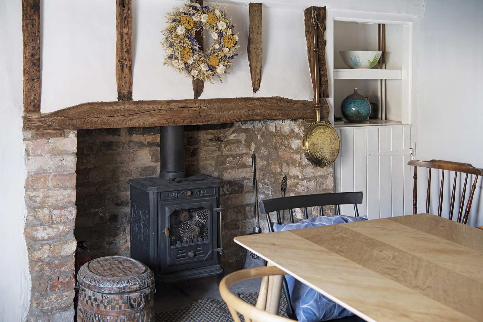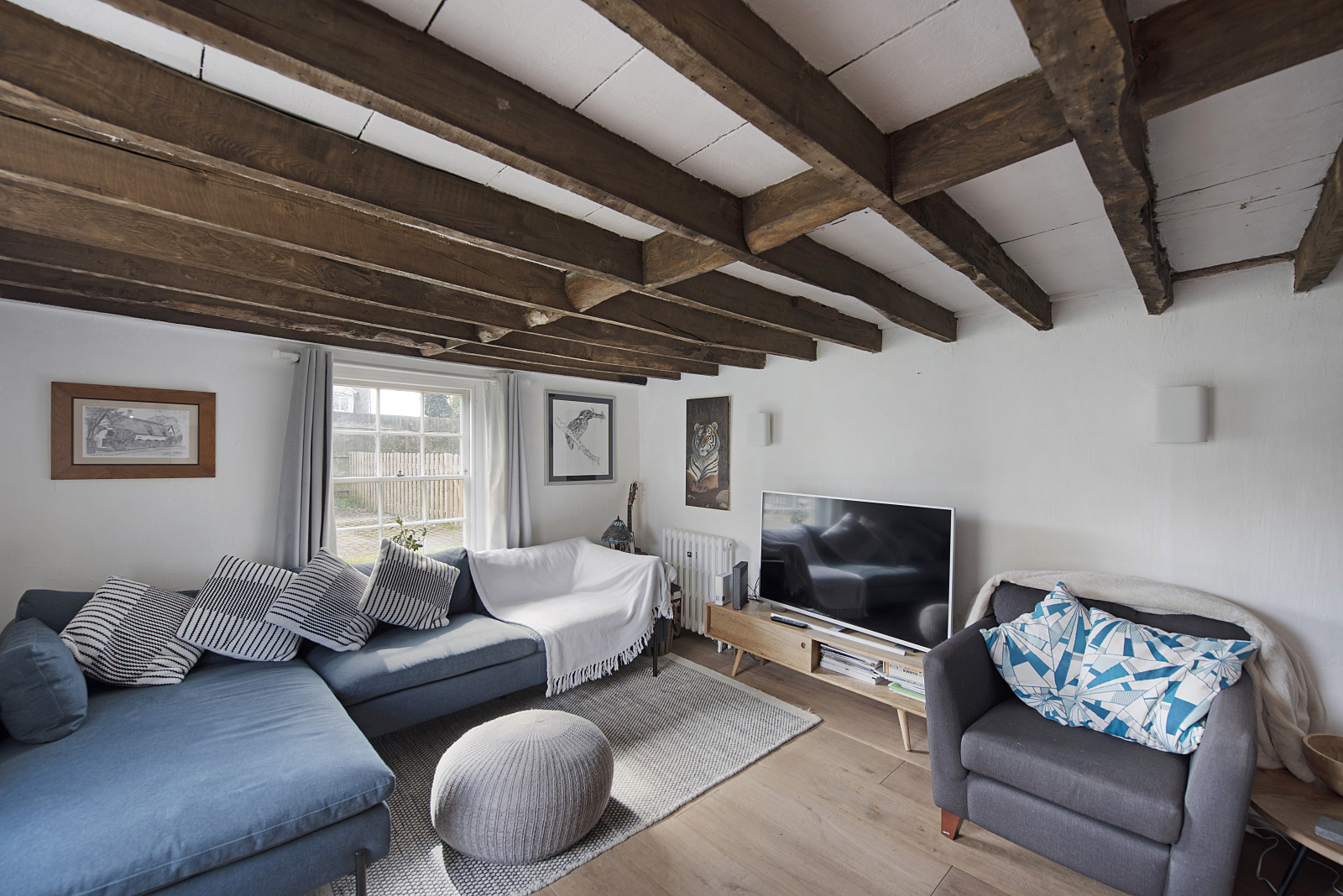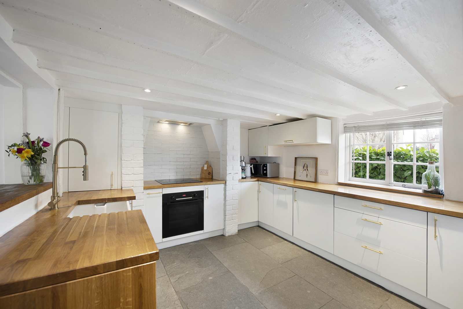 One of the things I love most about Long Thatch is the balance between old and new. The original beams and fireplaces blend beautifully with the modern updates. Our main bedroom is a peaceful retreat, decorated in soft white and grey tones, with newly fitted wardrobes and drawers and a large window overlooking the picturesque thatched cottages of the village. The kitchen maintains a modern cottage feel and opens into our new garden room extension, creating a bright and airy space while still retaining the cosy charm of cottage living. The garden has been thoughtfully extended, with a new patio built using rustic old bricks. Sitting outside in the summer, surrounded by other thatched roofs and listening to the historic planes from Duxford flying overhead, feels truly special.
