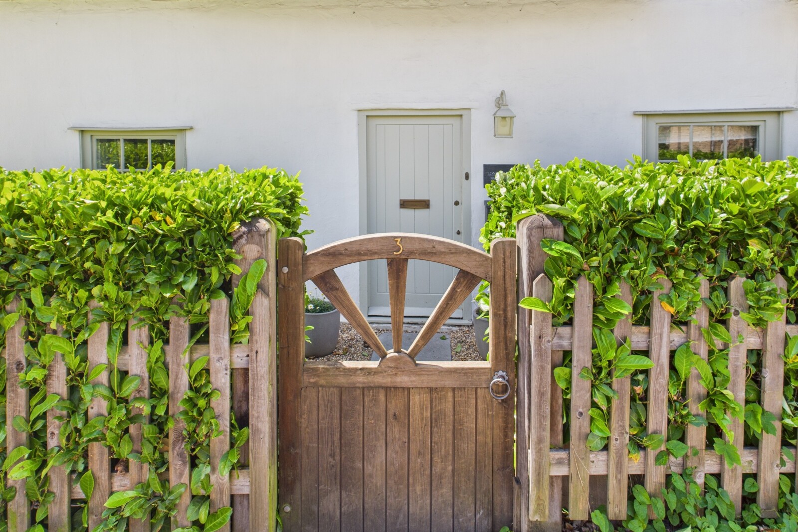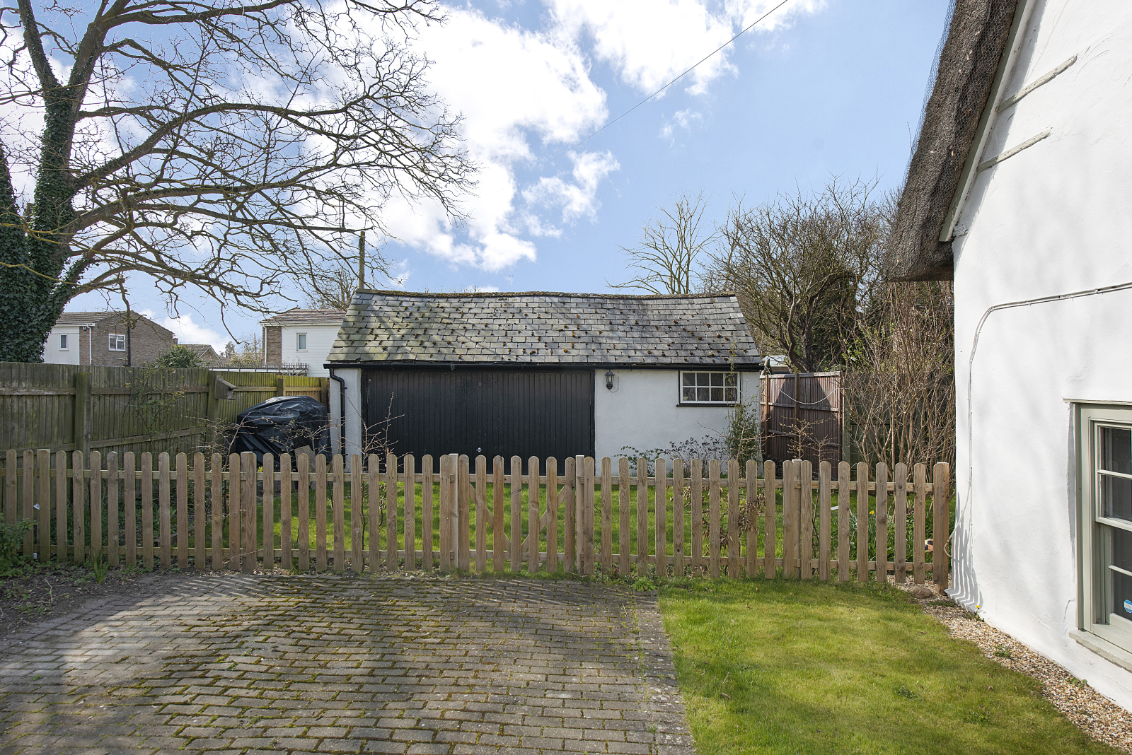 The south-facing garden is private and peaceful, with a terrace off the family room leading to a well-maintained lawn. A gated driveway provides ample parking, and there is also an oversized garage, fitted out with a workshop.