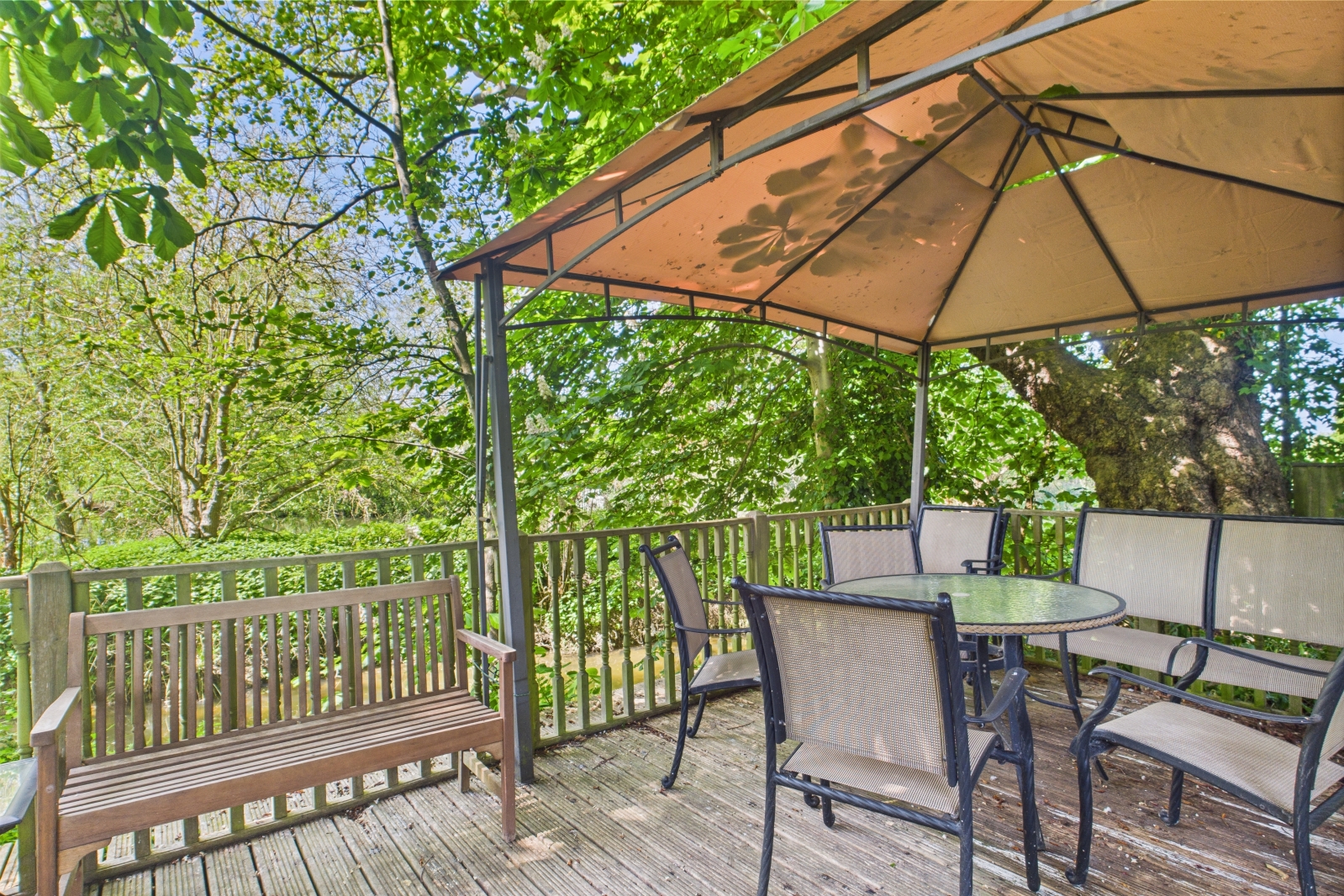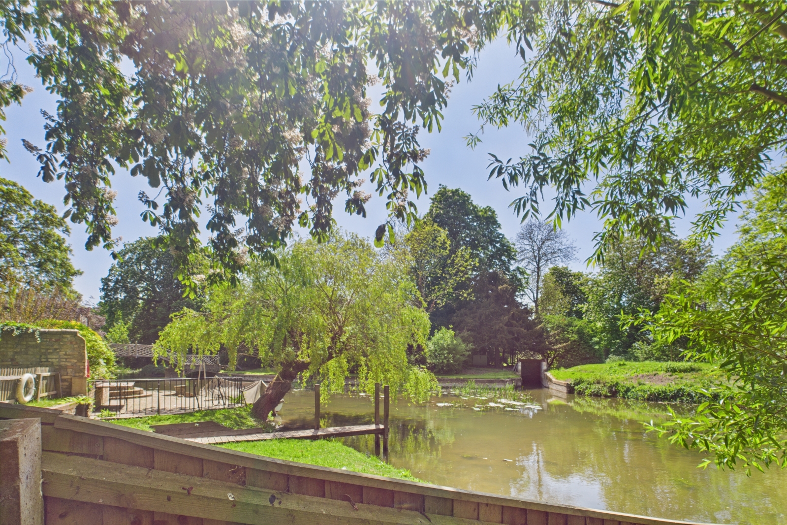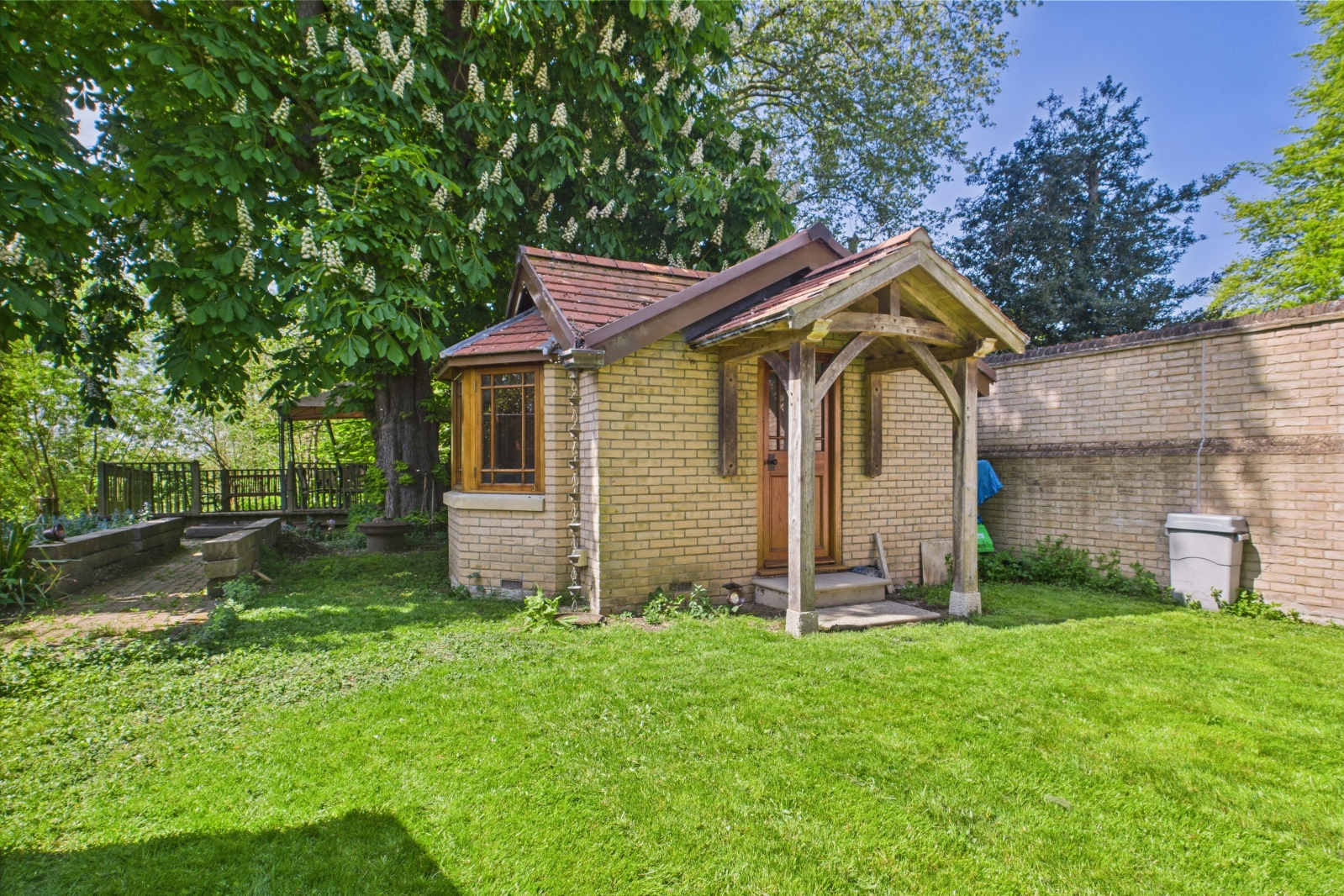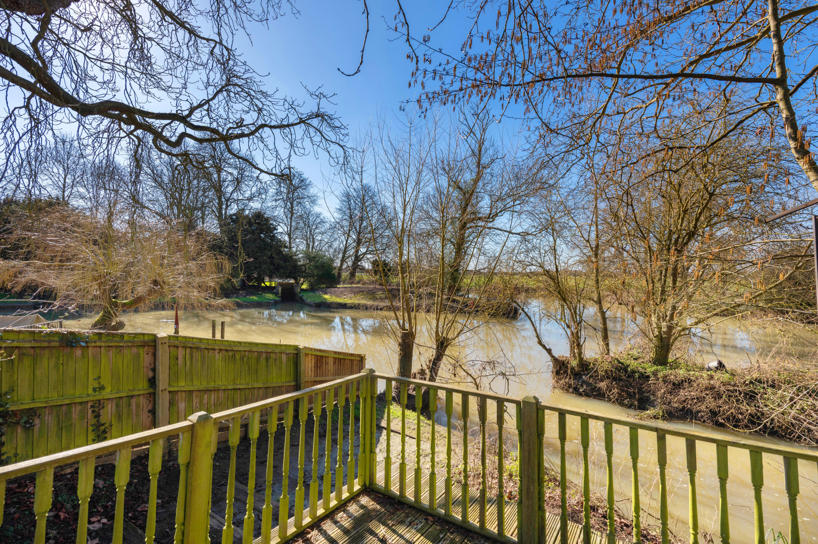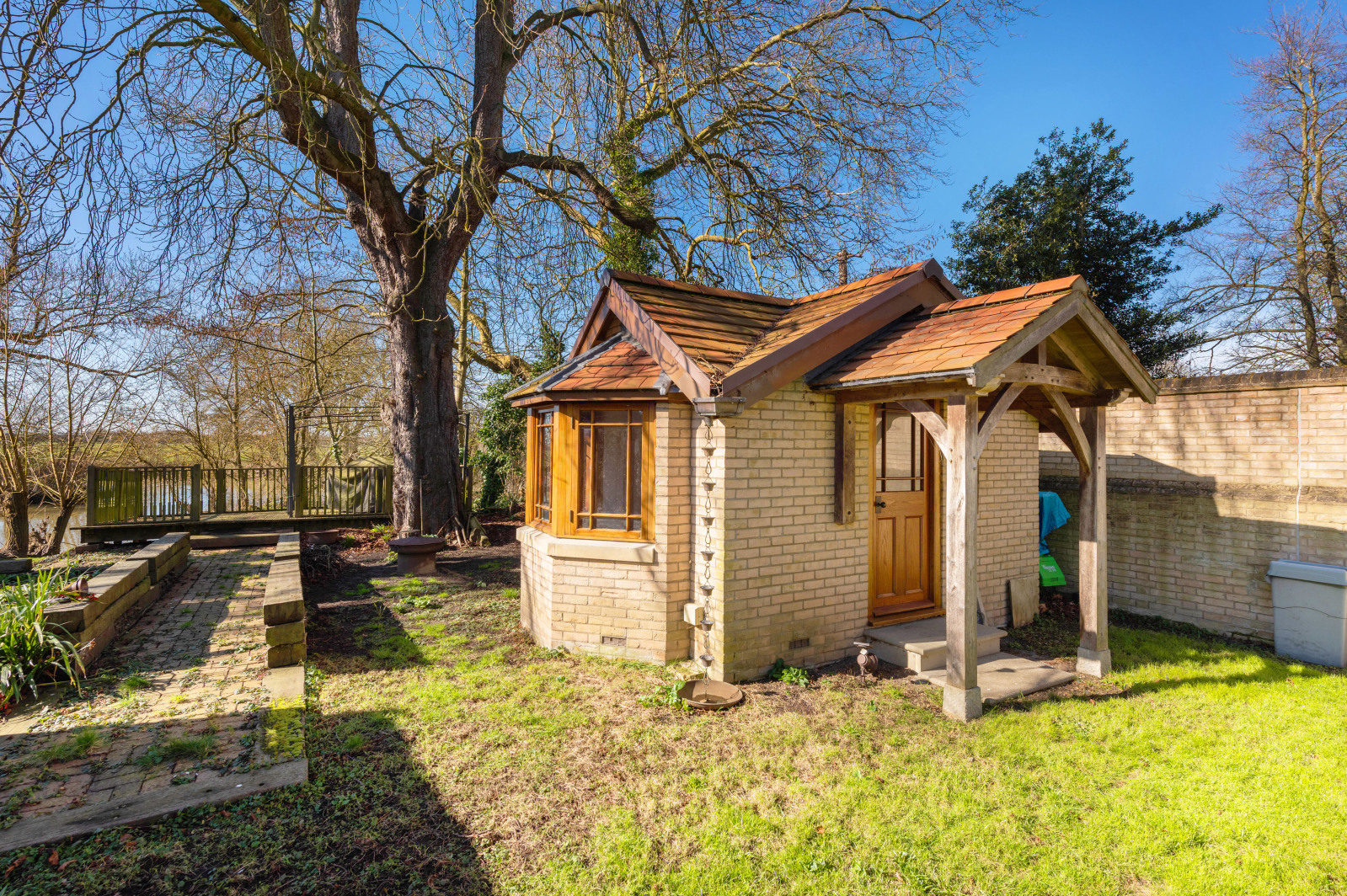 The garden is a particularly special feature of this home, extending down to the river with expansive lawns and mature specimen trees. A decked area on the riverbank provides the perfect spot to enjoy tranquil views over the water and the meadows beyond. Nestled beneath a mature tree, a brick-built bespoke garden room offers a charming retreat for hobbies or a study space. Its whimsical styling makes it an inspiring hideawaysure to spark children's imaginations.
