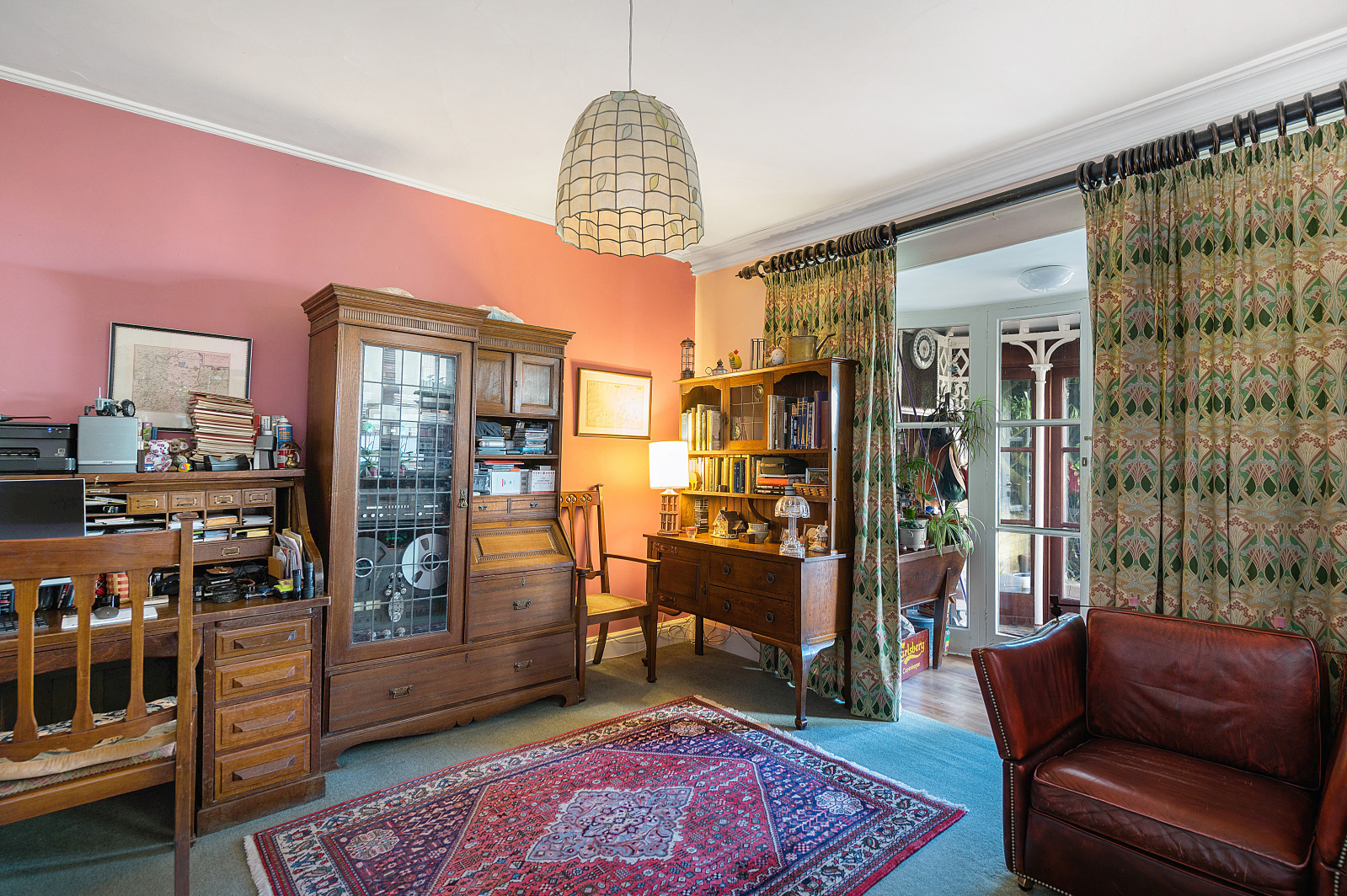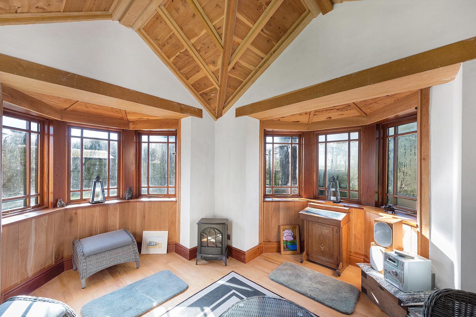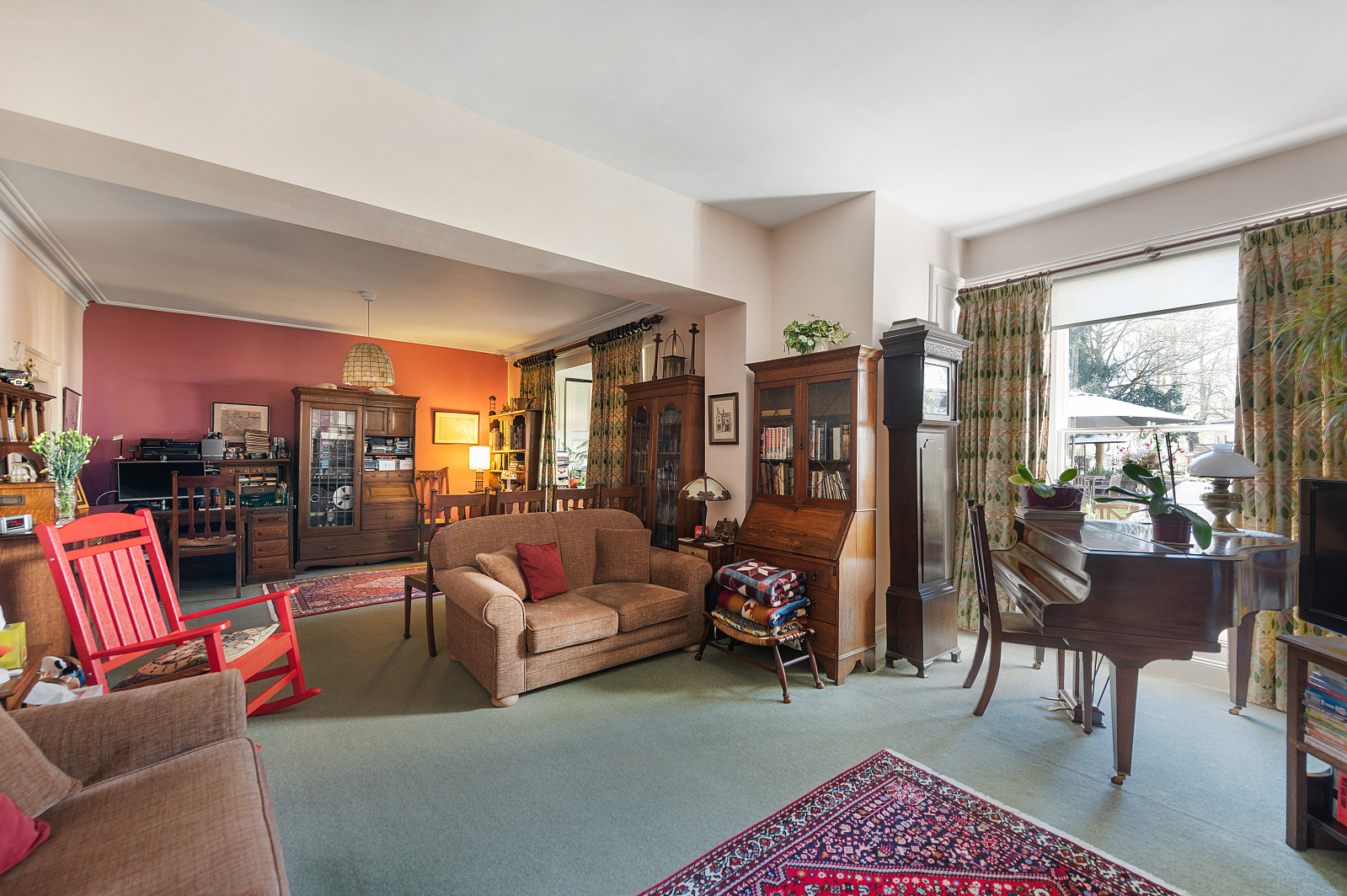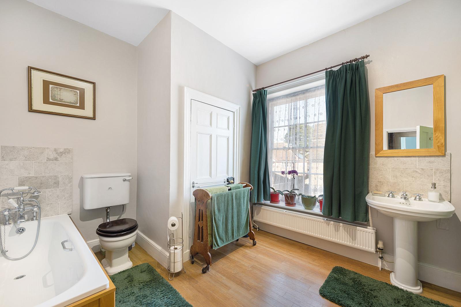 The open-plan reception space is a highlight, with full-height windows and doors that frame stunning views of the garden. A fireplace adds warmth and charm, making it an inviting space throughout the seasons. Originally two separate rooms, it now offers versatility and generous proportions, easily adaptable to suit an owner's needs.