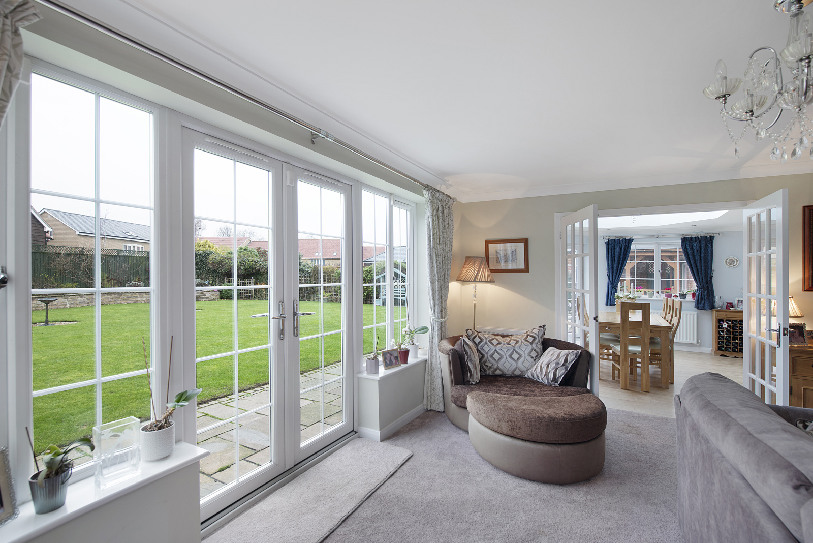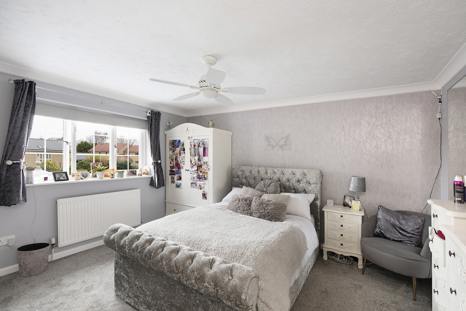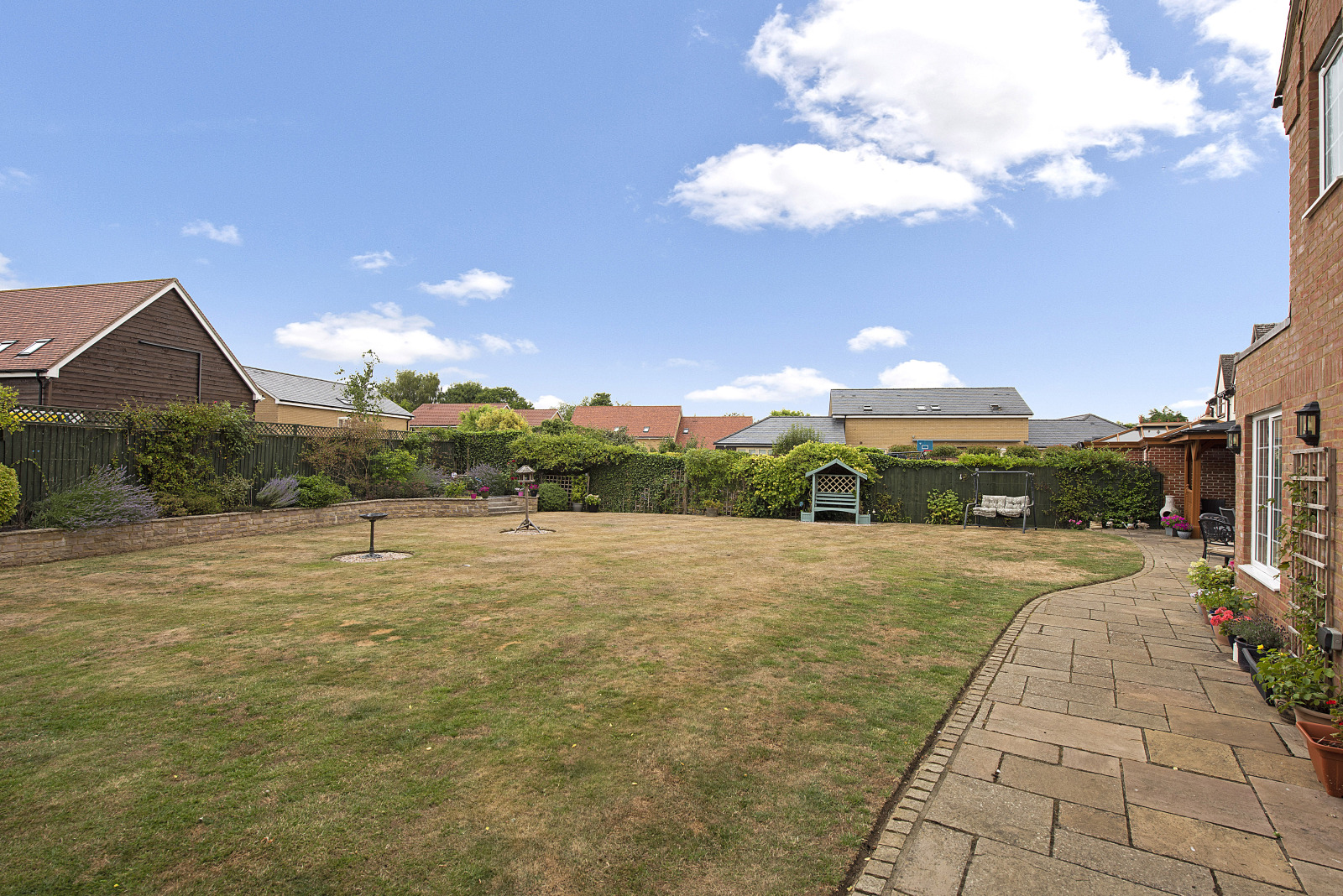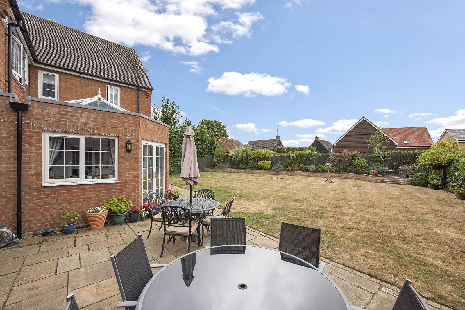 Outside, the property is set back from the road behind a hedge with a lawn and gravel driveway offering ample parking and access to the double garage. The rear garden is sunny and low-maintenance, ideal for busy families. A sandstone patio provides the perfect setting for alfresco dining, while the expansive lawn is perfect for children to play or for hosting events, such as a marquee if desired.