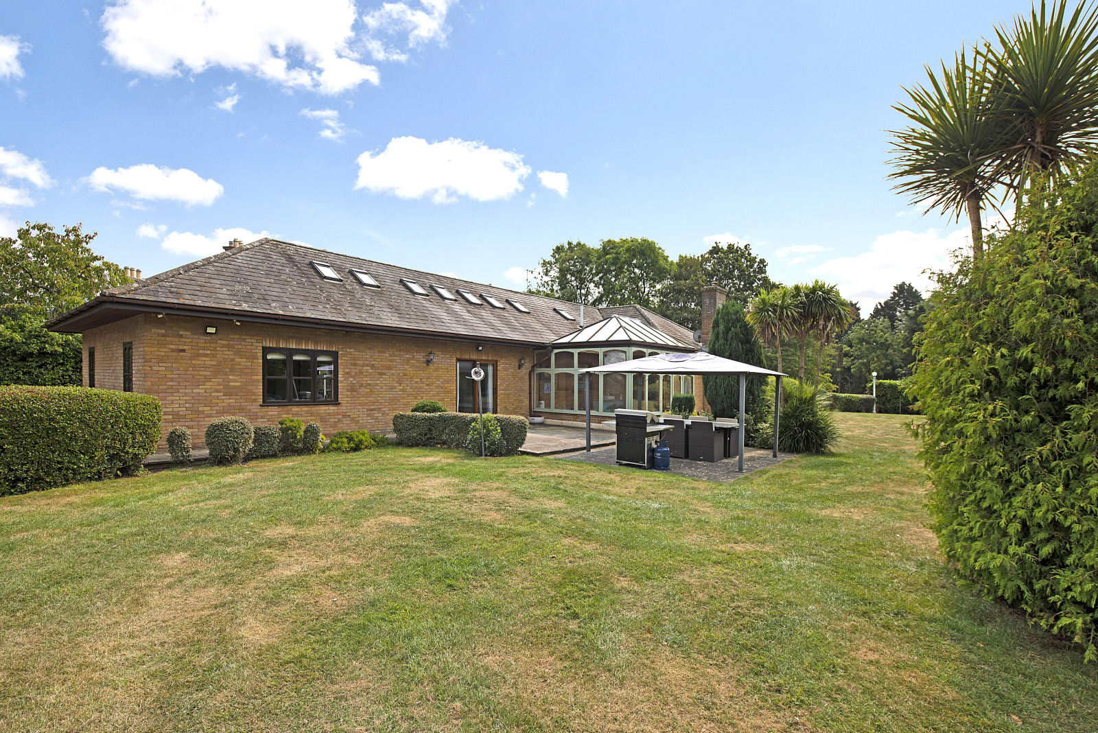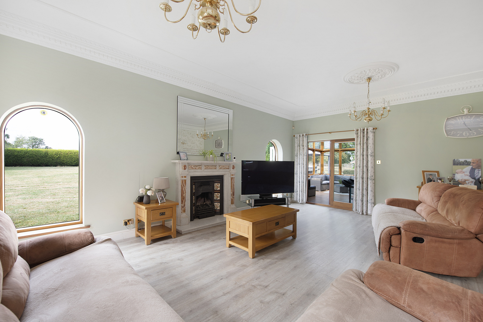 Upon entering through the grand double-fronted doors, you are welcomed into a spacious hallway that effortlessly flows into a light-filled living room, where large windows showcase views of the main garden. Adjacent to this inviting space is a generous conservatory, complete with a bar area, making it an ideal setting for entertaining guests.