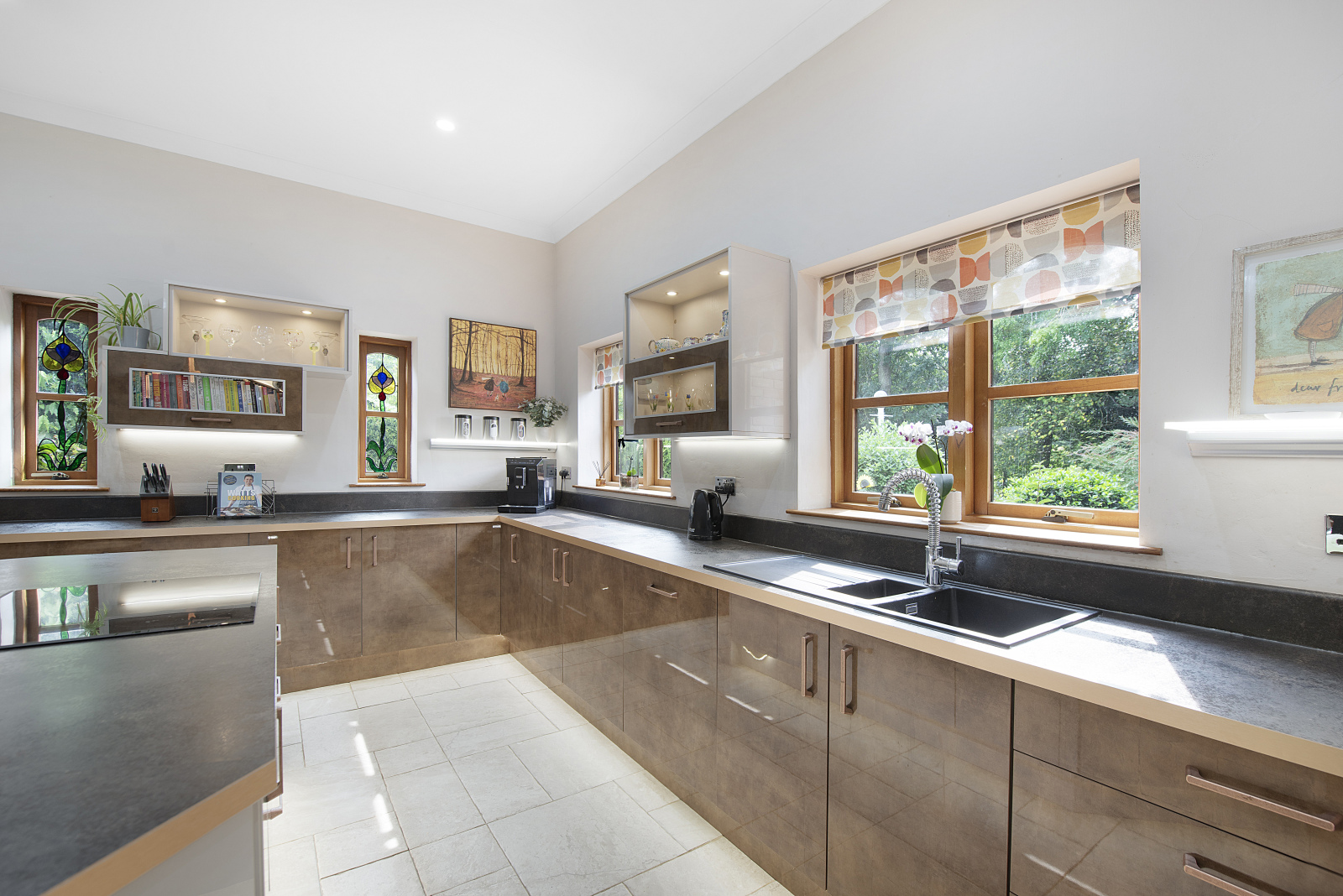 Opposite the living room, the luxurious open-plan kitchen and dining area stands out with its sophisticated Roman-bronze colour palette, ample storage, and modern amenities, including a built-in fridge/freezer, wine chiller, and dishwasher. The kitchen is equipped with an electric hob and double self-cleaning ovens, while a separate utility room provides additional space for a washing machine and tumble dryer.