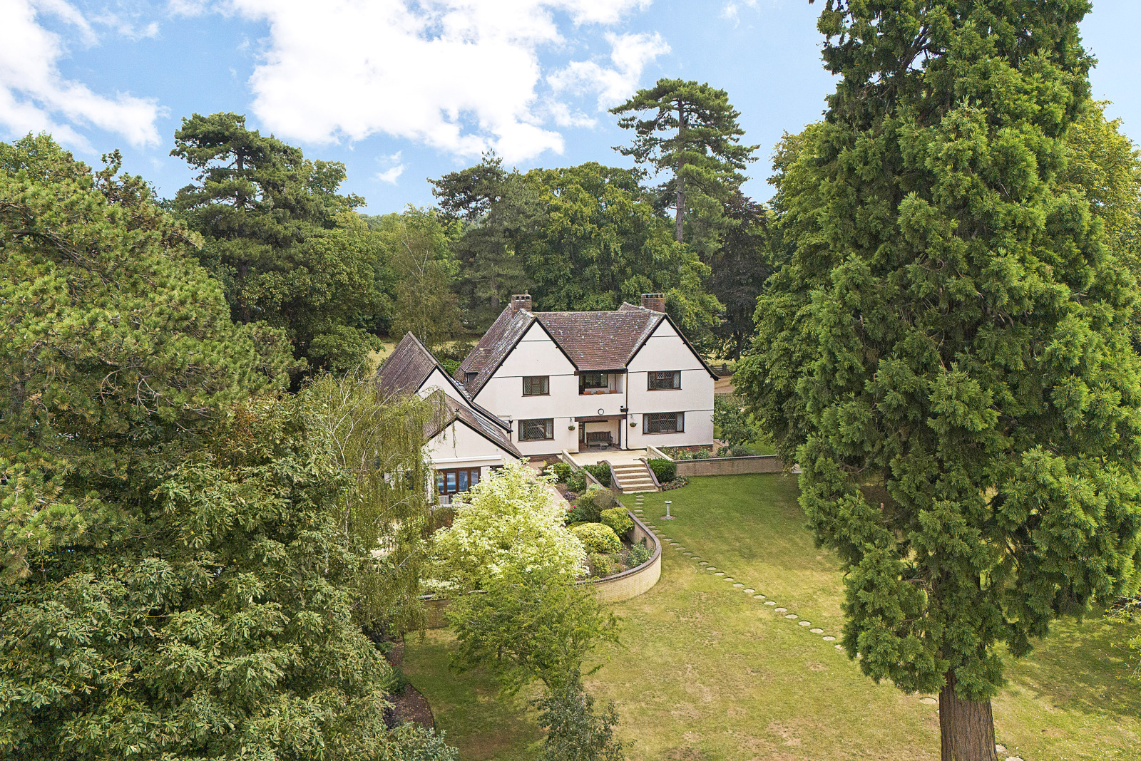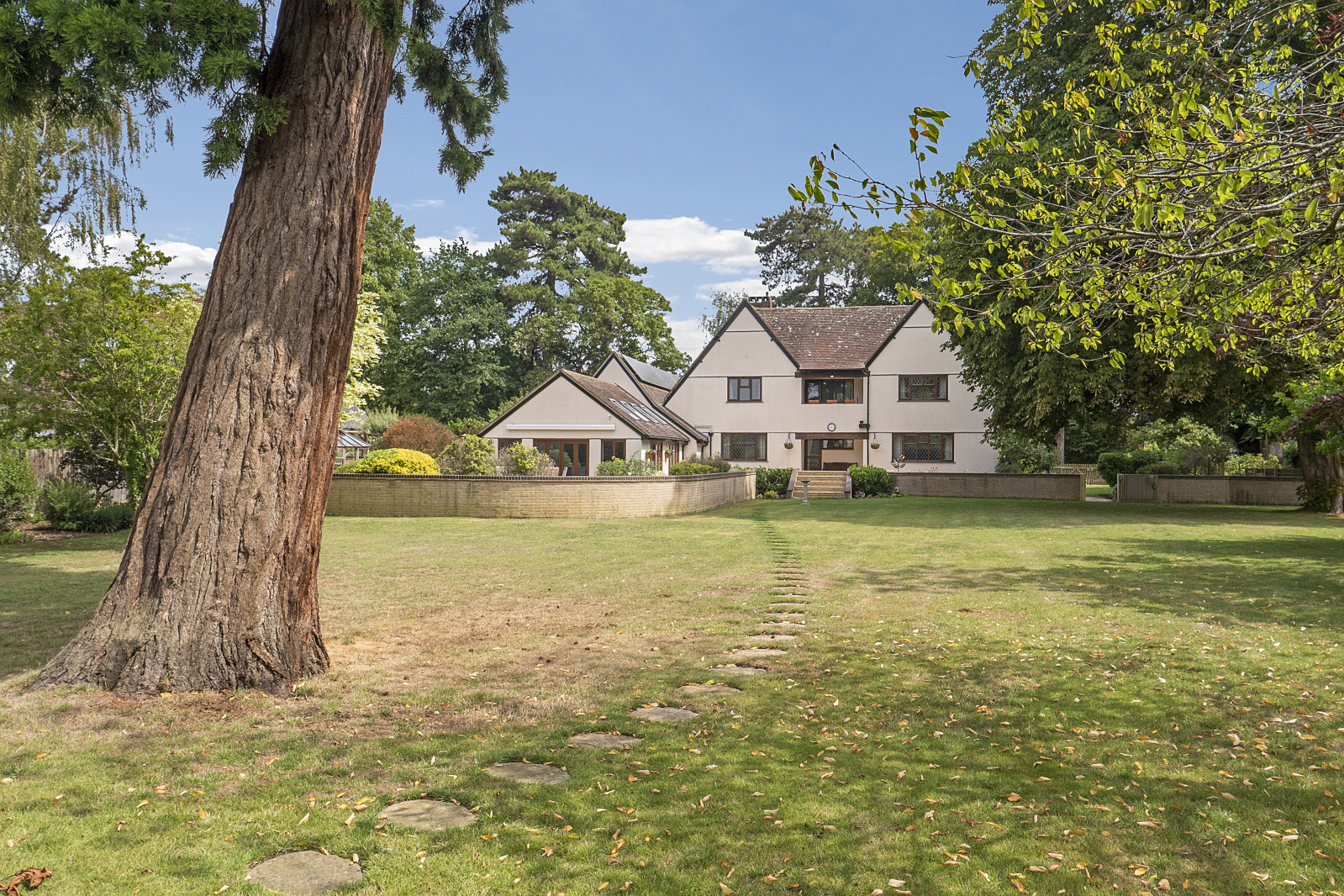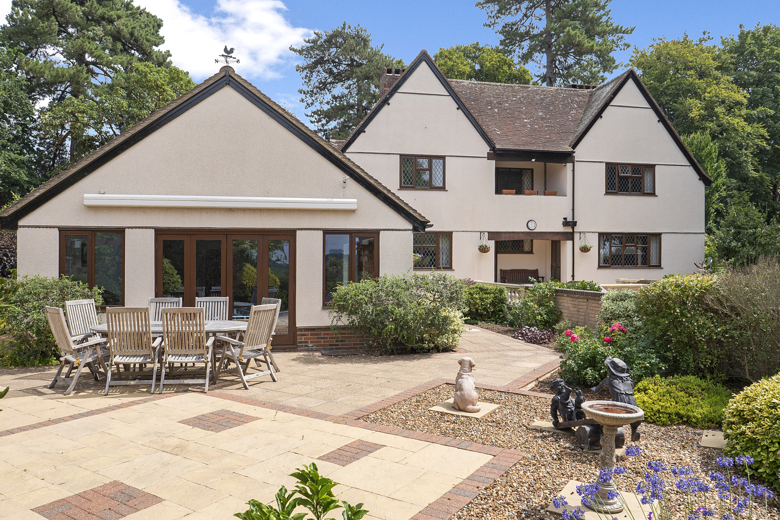 Approached via a block-paved driveway, there is ample parking in addition to a double and single garage. The home opens into a welcoming entrance hall, with doors leading to the main reception rooms and a delightful covered outdoor area. Both formal reception rooms enjoy peaceful garden views, ideal for entertaining or relaxing, while a generously sized study offers versatility as a family room or playroom.