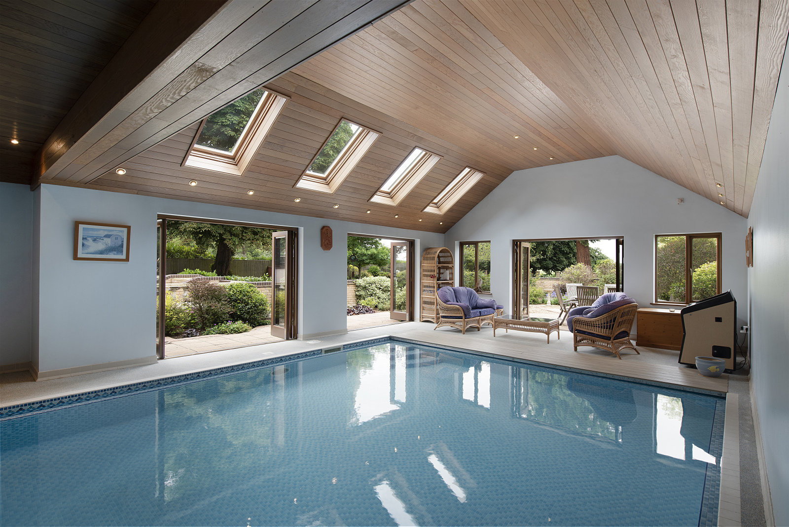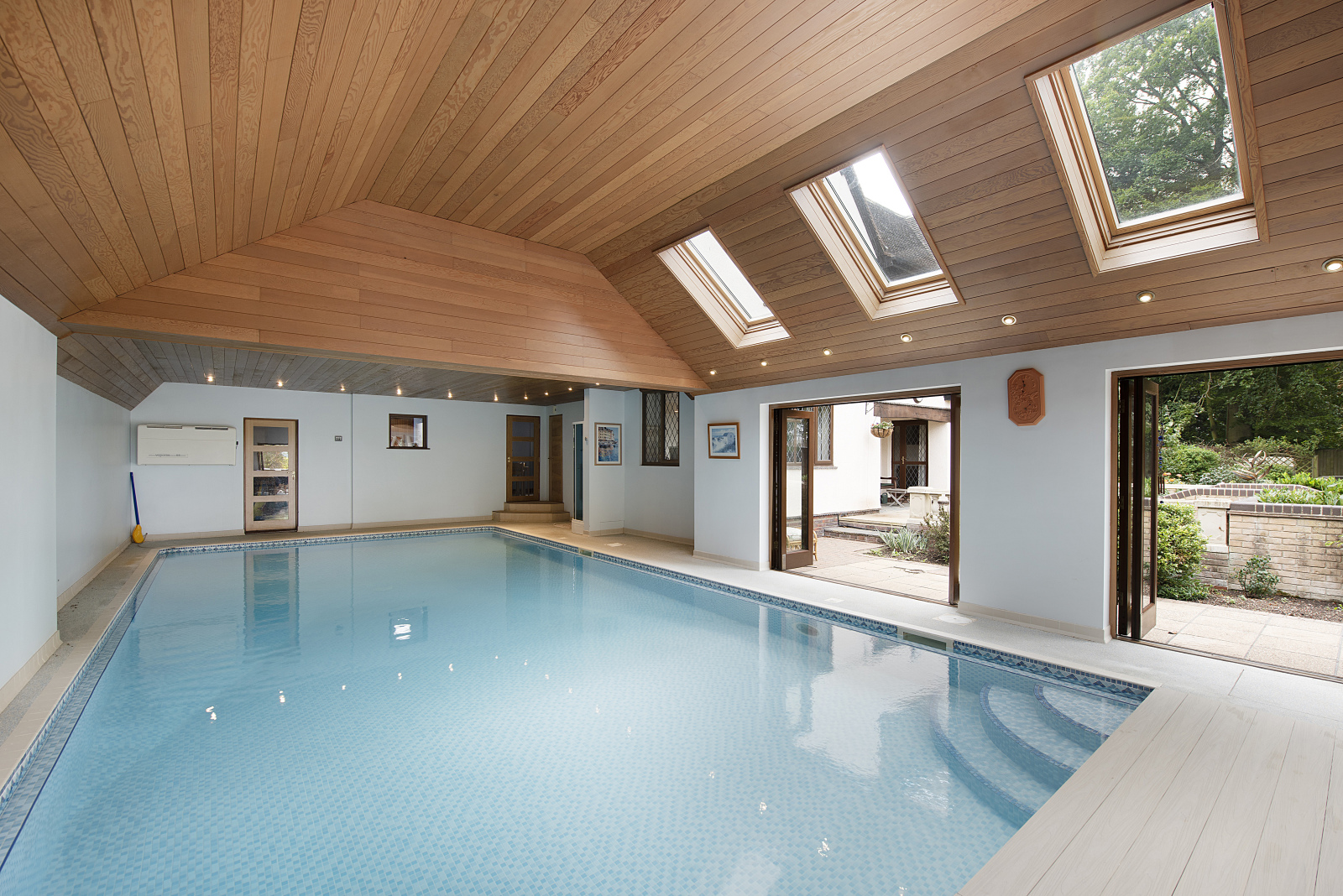 At the heart of the home, the kitchen is complemented by a separate utility room with direct garden access. The showpiece addition by the current owners is the indoor pool room, a stunning space with vaulted ceiling, Velux windows, and bifold doors that open to the rear terrace. Whether hosting summer celebrations or enjoying a quiet morning swim, its a year-round retreat for wellness and leisure.