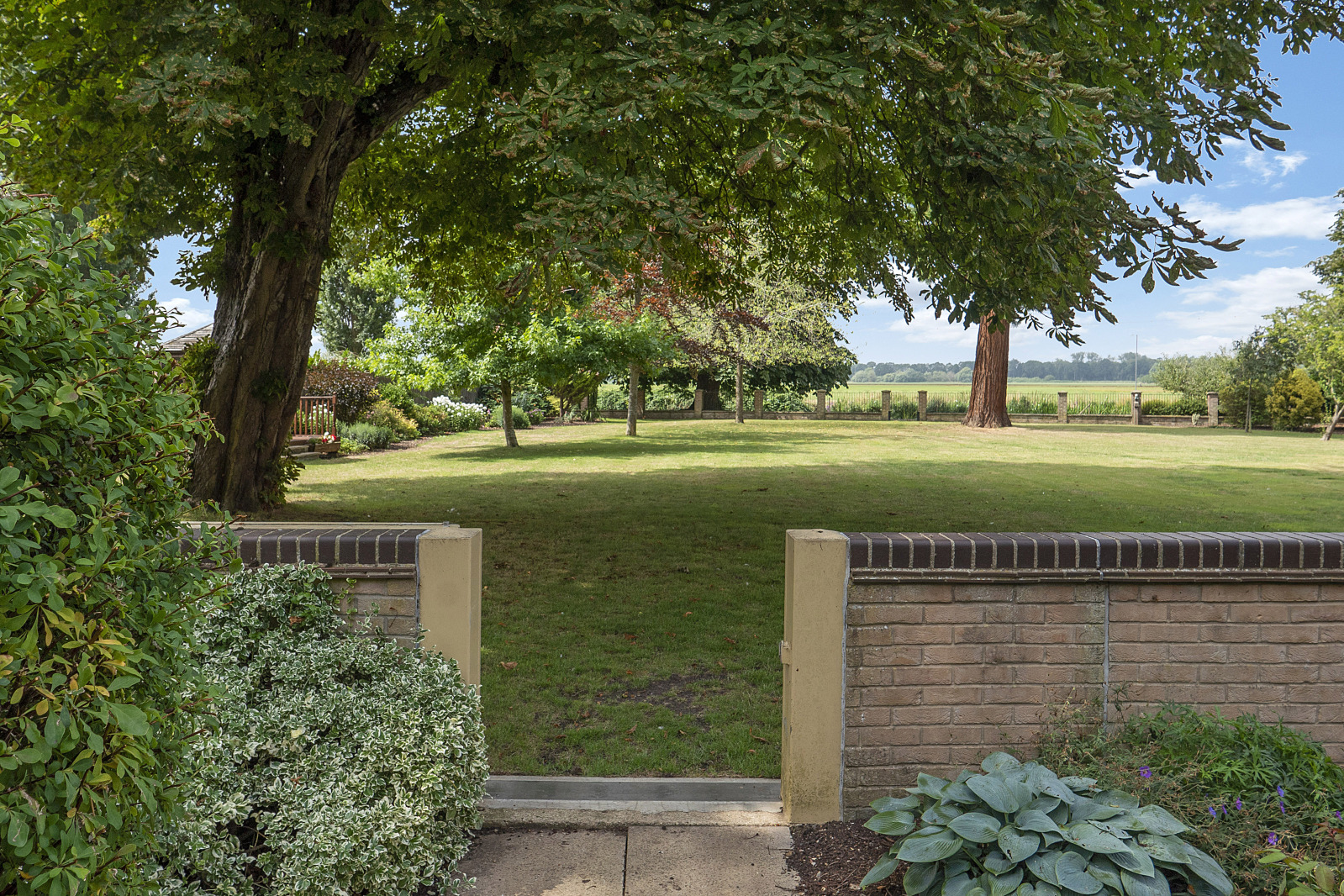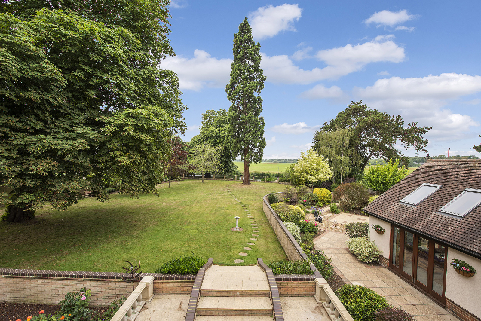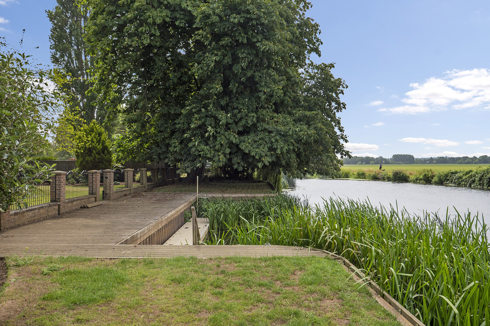 Outside, the gardens have been thoughtfully landscaped to complement the natural surroundings. An expansive patio wraps around the rear of the property, perfect for alfresco dining, while sweeping lawns and mature trees create a private parkland feel. The plot leads down to the rivers edge, where a mooring sits securely behind elegant wrought iron fencing and brick pillars, a rare privilege for boating enthusiasts or those simply seeking serenity by the water.