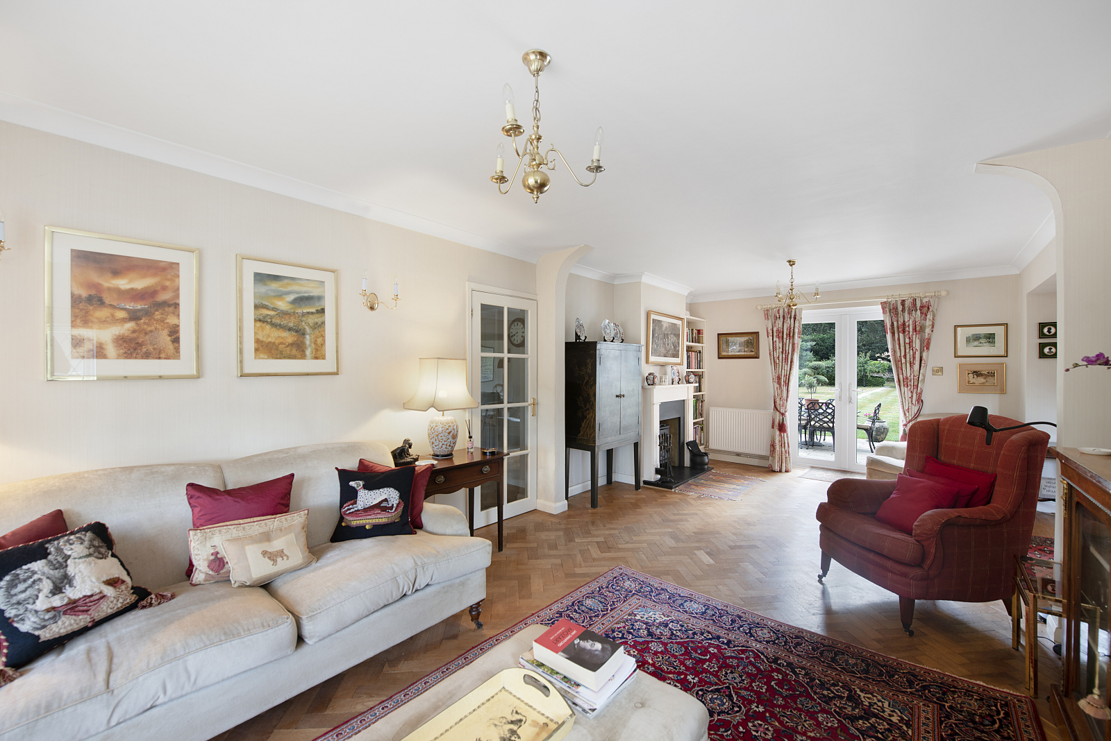 The house has been tastefully updated throughout and offers light-filled, versatile living space. A bespoke kitchen forms the heart of the home, complemented by oak parquet flooring throughout much of the ground floor. The main reception space is a welcoming sitting room with a log-burning stove and fitted bookshelves, flowing into a snug and a separate dining room, both with access to the rear garden, offering an excellent space for everyday living and entertaining.