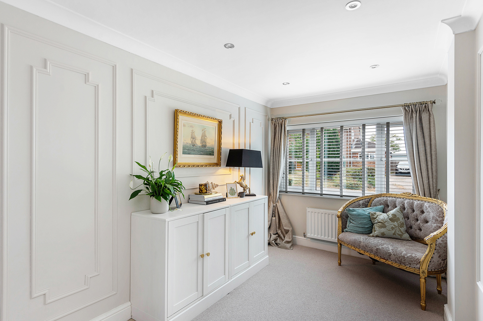 Flowing seamlessly from here, the sitting room features a welcoming fireplace, while the versatile playroom offers flexibility as a study, hobbies space, or additional family room.