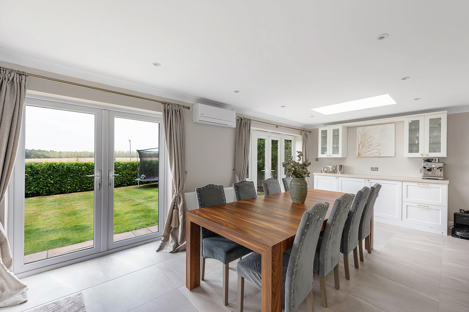 At the heart of the home lies a superb open-plan reception space, where the dining area, complete with dry bar and air conditioning, is bathed in natural light from the overhead lantern and glazed doors that frame the stunning countryside beyond.
