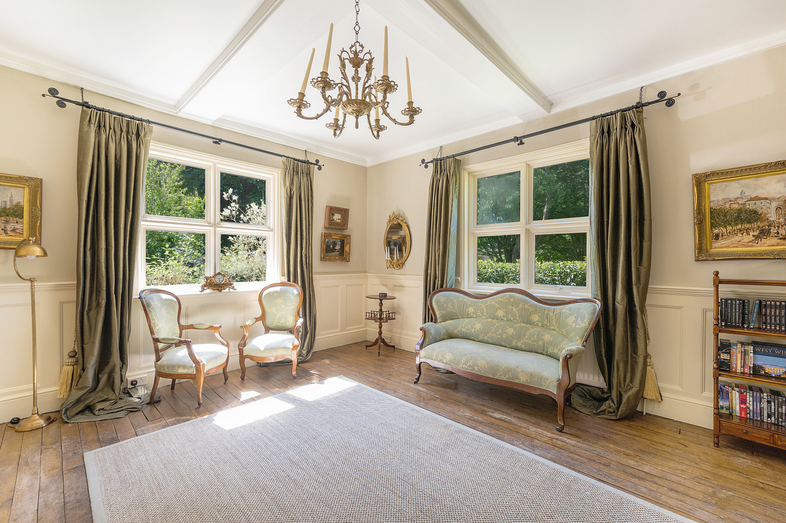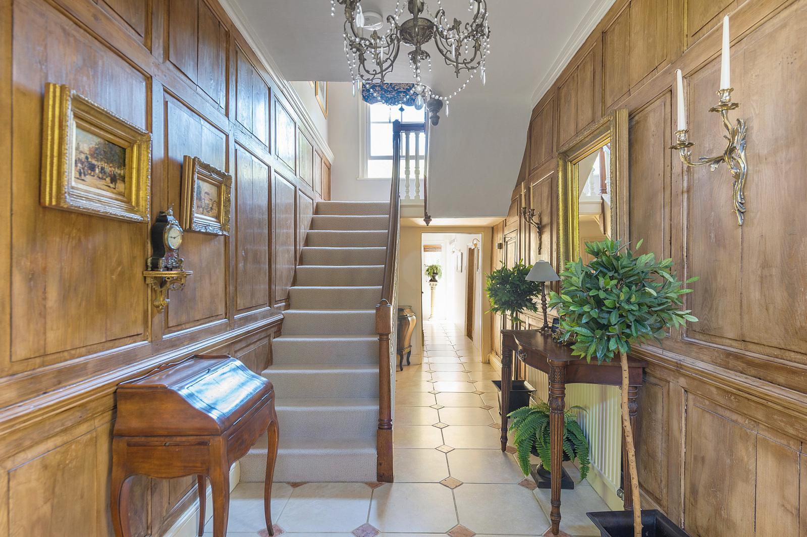 Situated opposite a greenspace with an abundance of mature trees, the handsome front façade provides a splendid welcome for both owners and guests. High ceilings and large windows, typical of the architectural era, flood the property with natural light. Classical interior design highlights elegant period features throughout, particularly evident in the panelled entrance hall opening into the reception rooms and kitchen.
