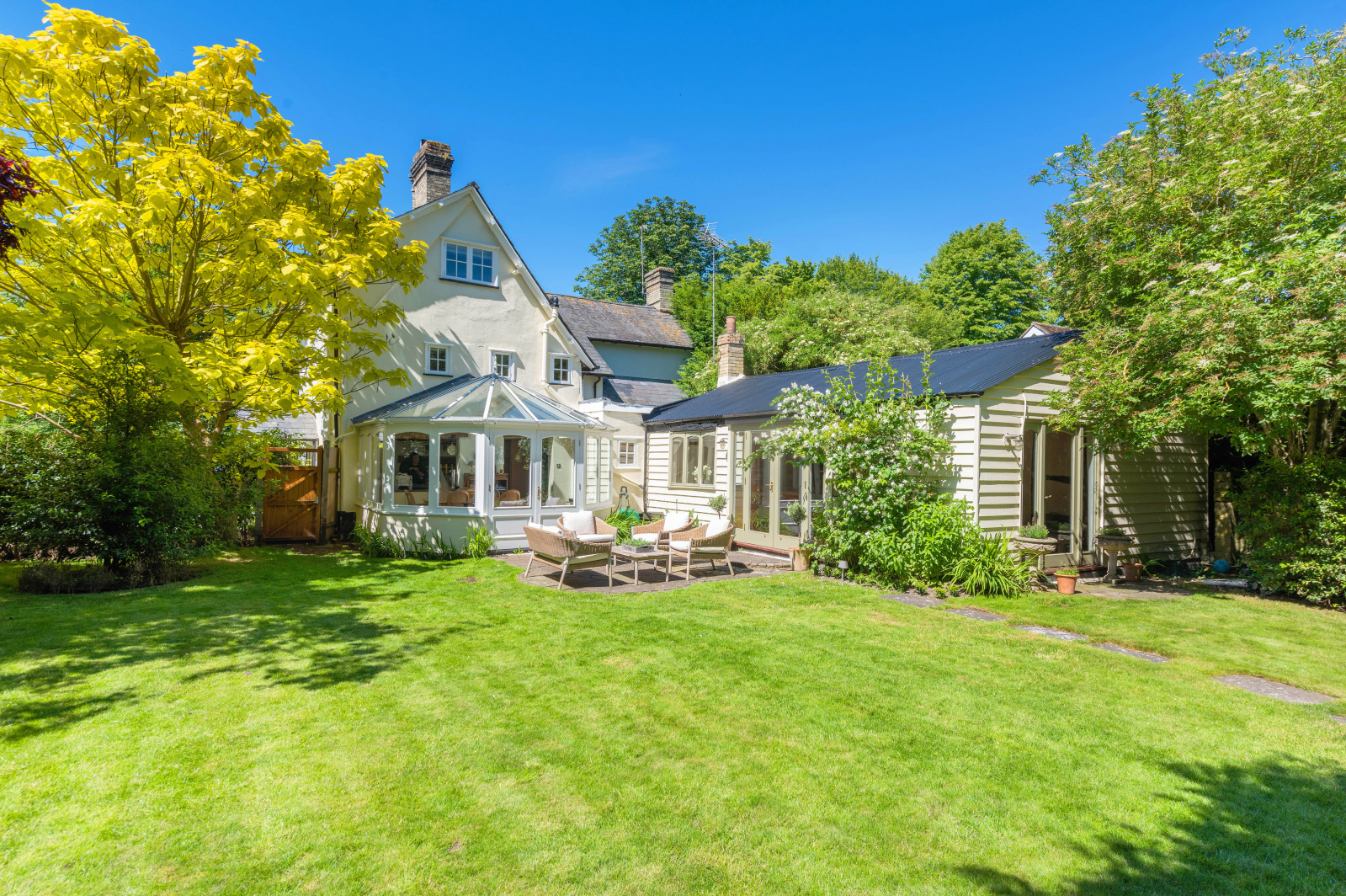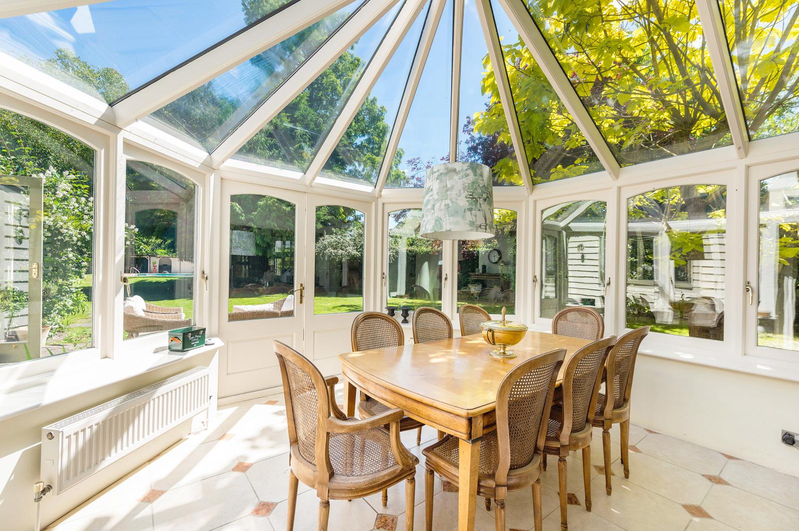 The plot, approaching a third of an acre, includes a large rear garden which is incredibly private, with an abundance of mature trees and shrubs. The terrace, accessed from the orangery and one of the reception rooms, is perfect for outdoor living and dining. A large lawn leads to the swimming pool, transporting you to a European holiday. Block paving surrounds the pool and leads to a covered seating area and outbuildings draped in climbers.