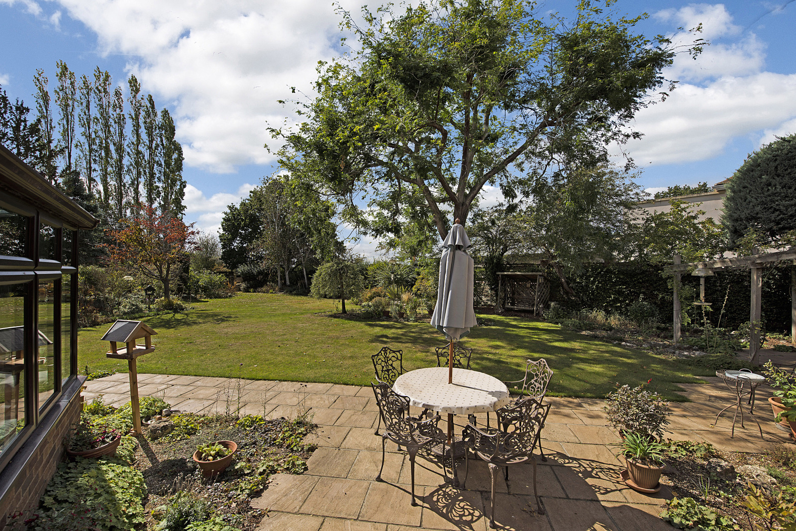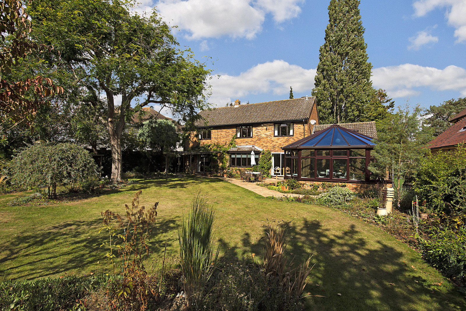 Owned by the current seller since new over 40 years ago, the property has been carefully nurtured into a peaceful haven. A large sandstone terrace opens onto sweeping lawns interspersed with mature specimen trees and well-stocked borders. Beyond the kitchen garden, a gate set within a mature hedge reveals a more natural space with a pond and open countryside beyond.