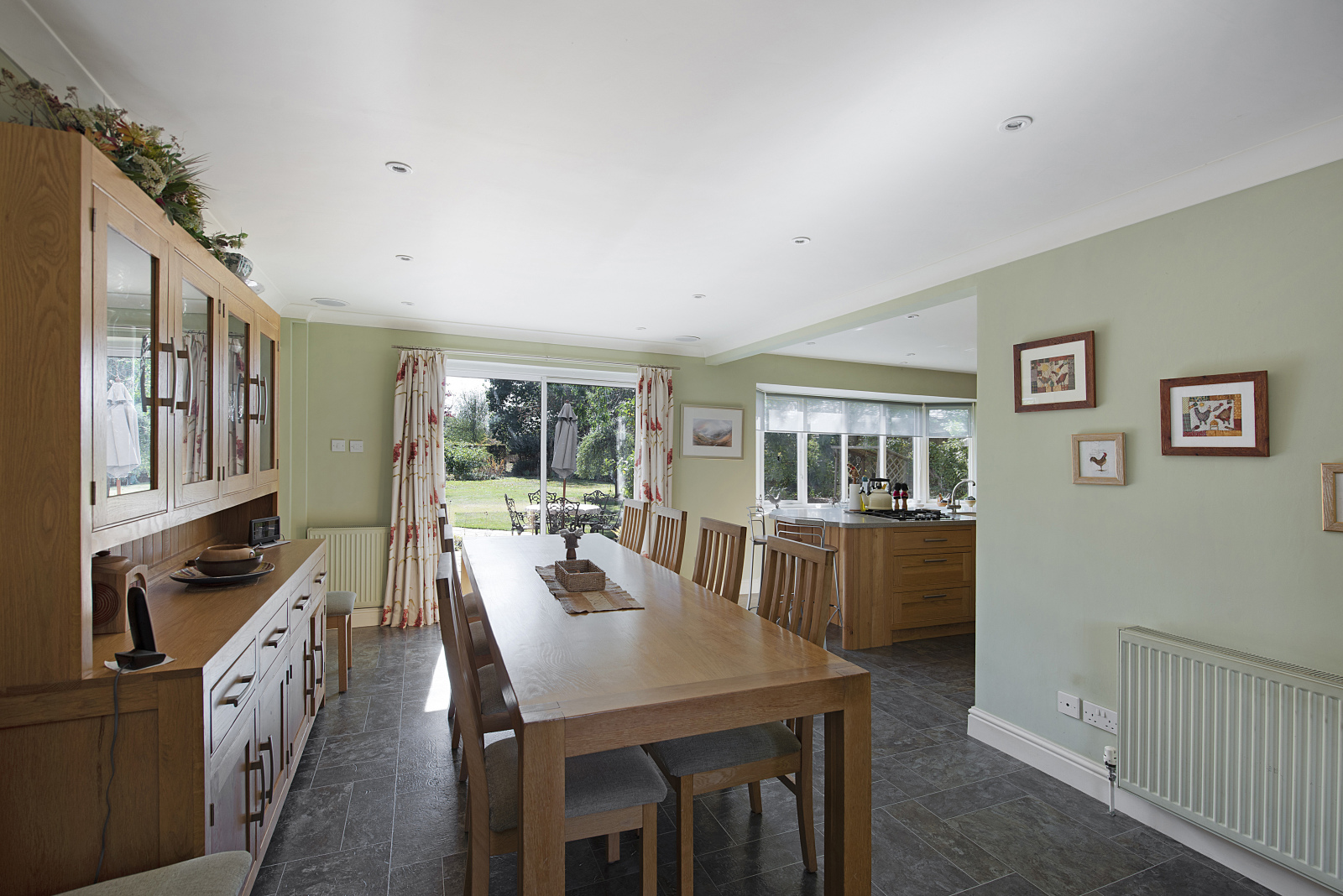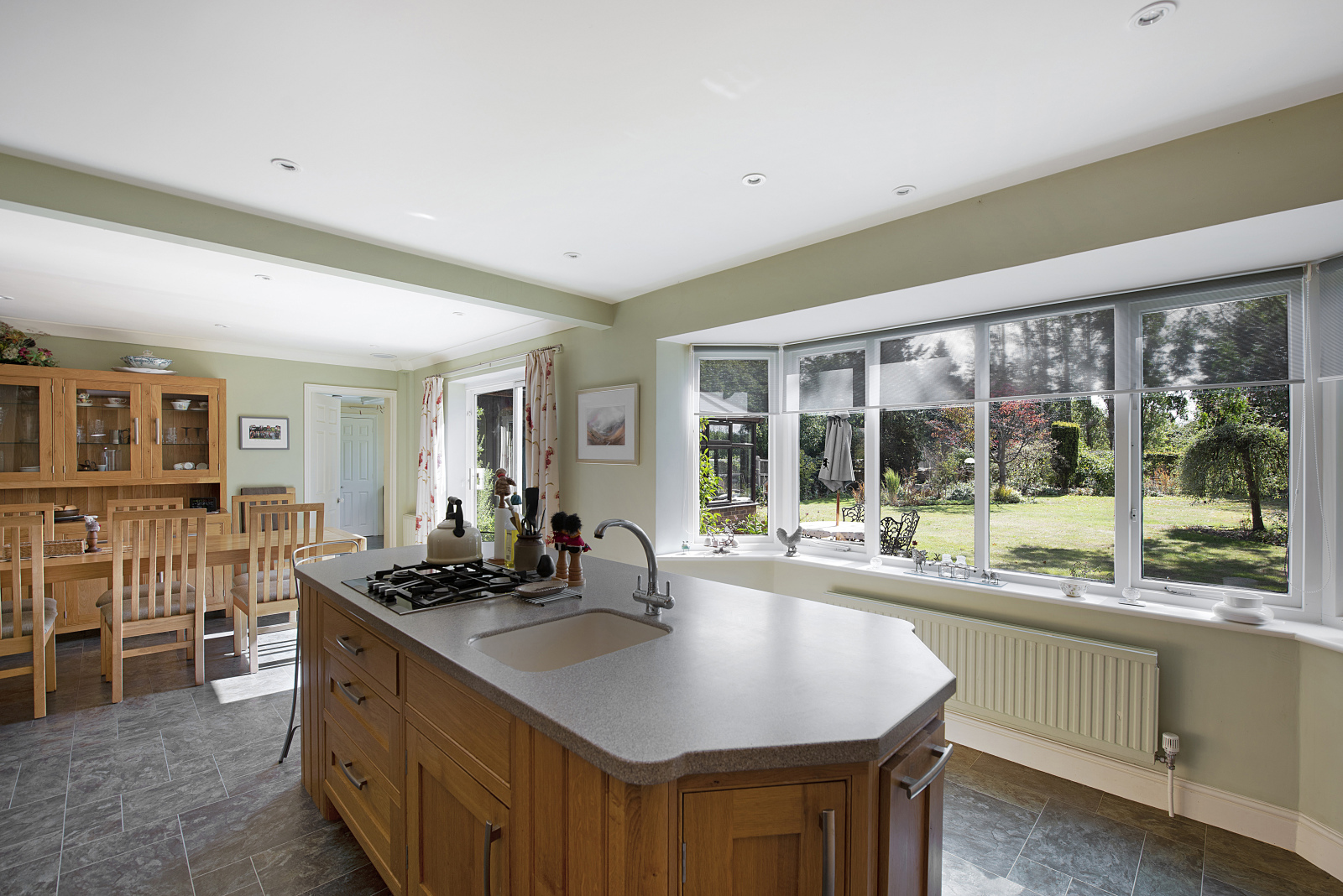 At the heart of the home lies the open-plan kitchen and dining room, a welcoming space for family living, entertaining, or cosy meals, with French doors opening directly to the garden. The generous triple-aspect sitting room, also with doors to the rear terrace, features an open fireplace, creating a wonderful room for gatherings all year round. A separate study provides a peaceful environment for homeworking but could equally serve as a snug or playroom. The large utility room ensures day-to-day practicality, while the conservatory offers a relaxing spot to enjoy views over the garden throughout the seasons.