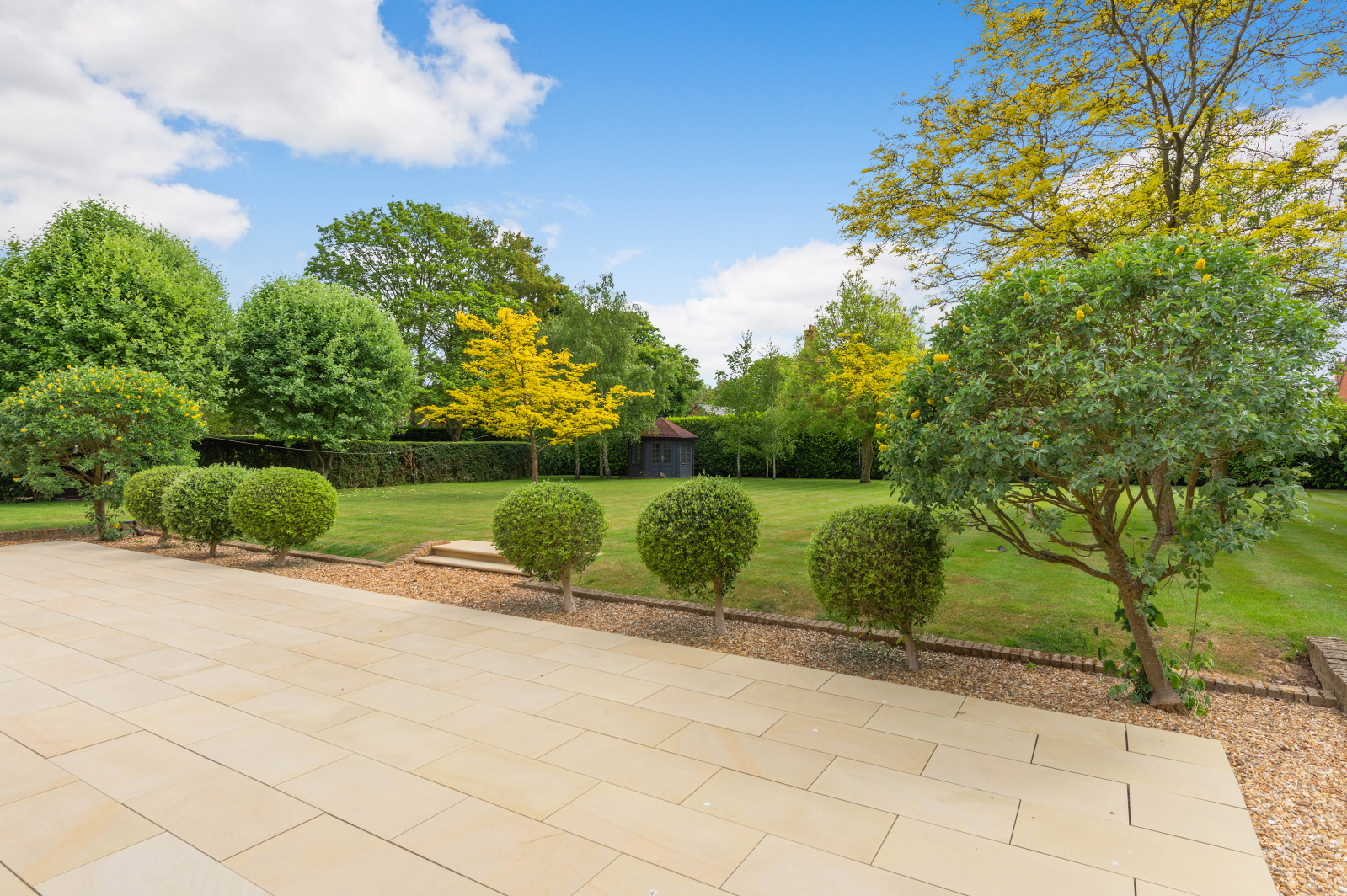 The rear garden enjoys a sunny, south-facing aspect and is bordered by mature hedging and specimen trees, offering both privacy and visual appeal. A full-width terrace and timber deck provide ideal areas for outdoor entertaining and dining.