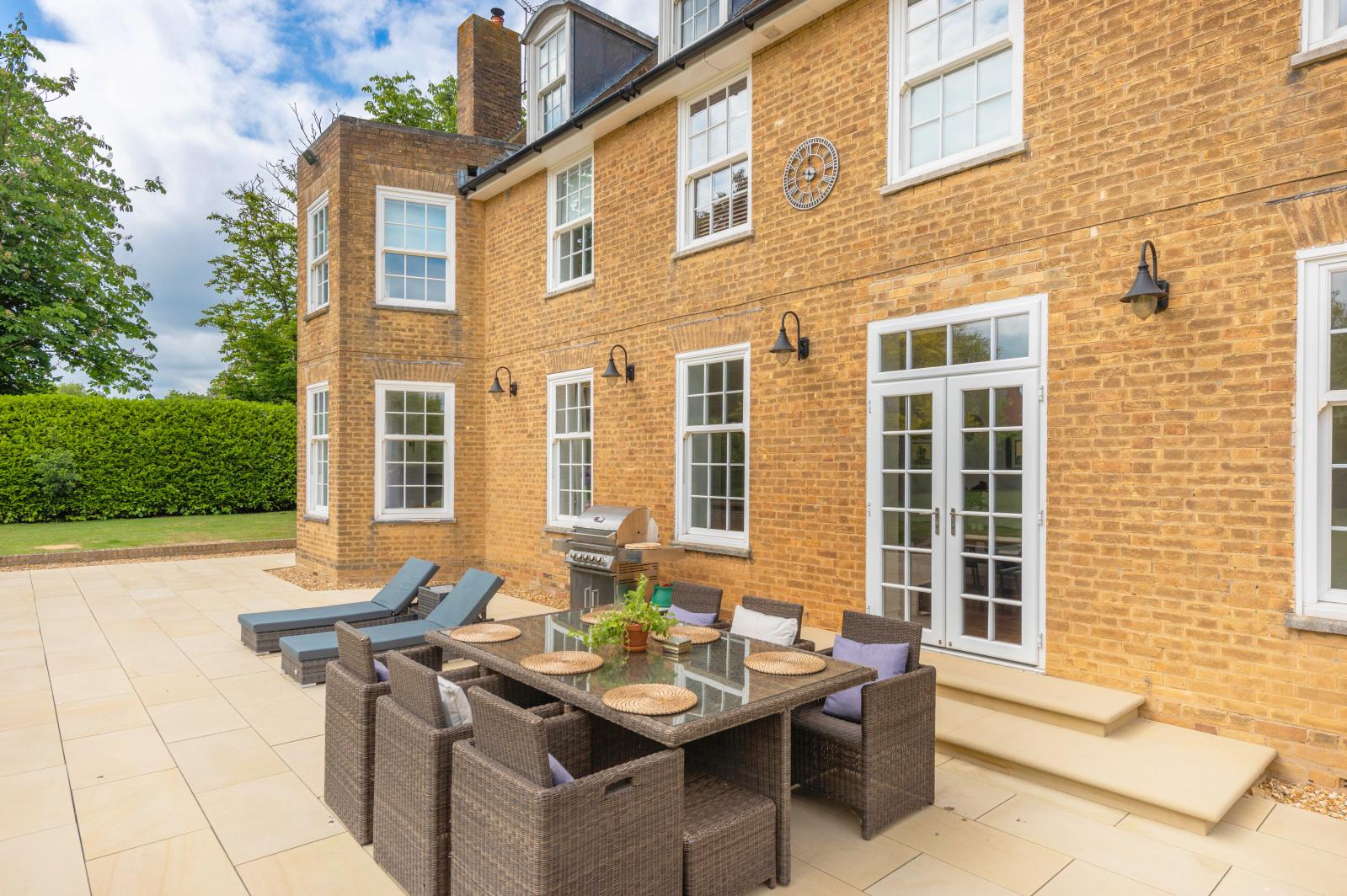 "The garden is a sun trap that enjoys sunlight all day long. It's low maintenance, yet beautifully designed, with mature trees, a lovely patio, and two distinct entertaining areas. One is a decked space ideal for lounging with sofas, and the other is a large patio perfect for dining and barbecues. It's also been a fantastic space for the children, offering room to play cricket, netball, and enjoy the outdoors in a safe and secluded setting."