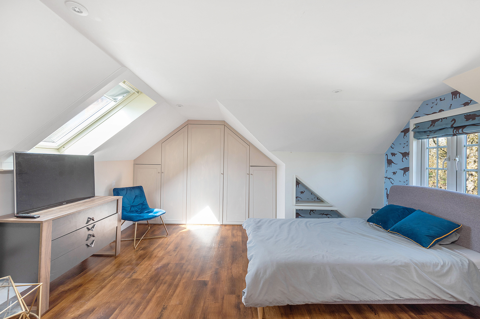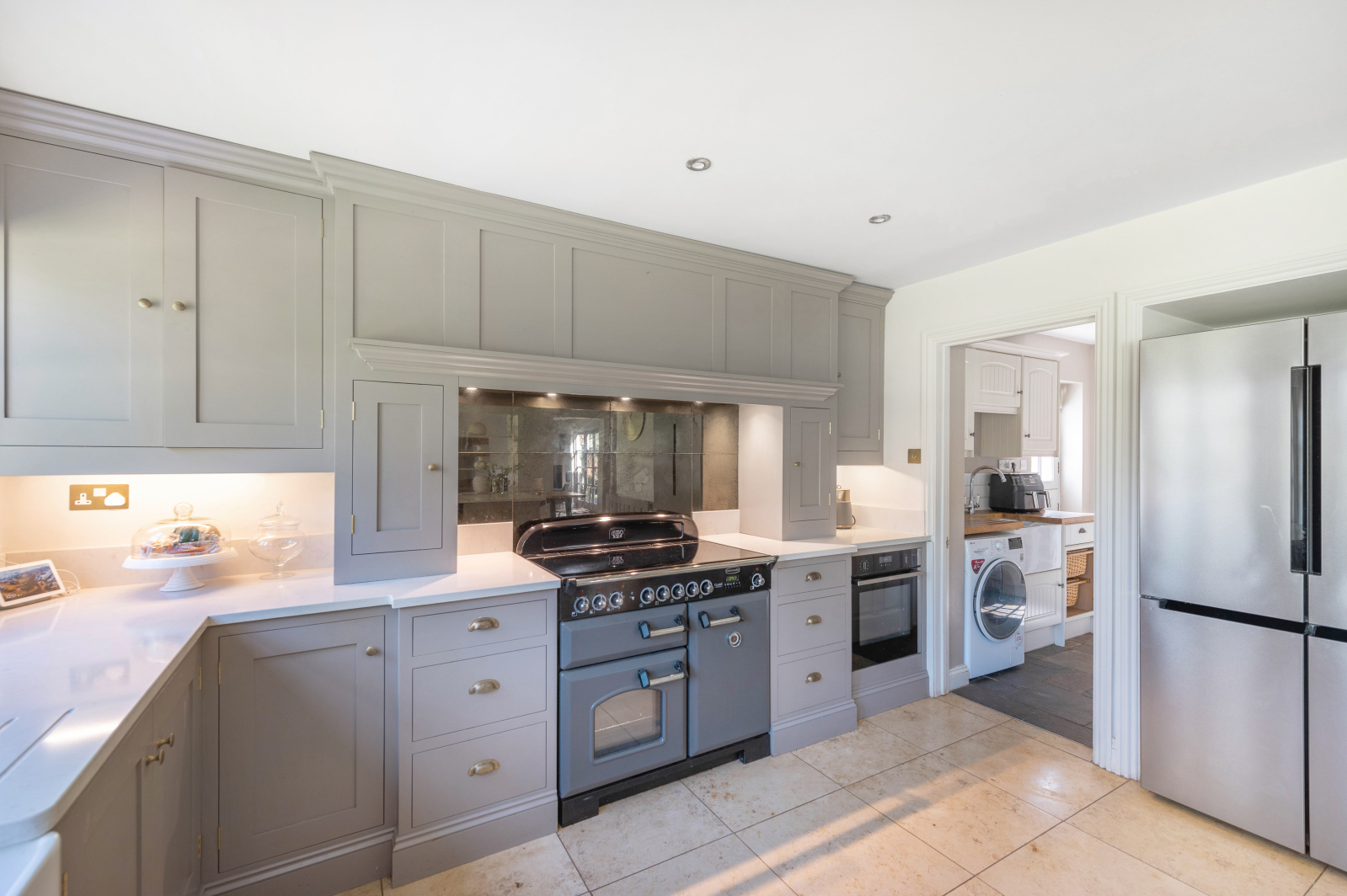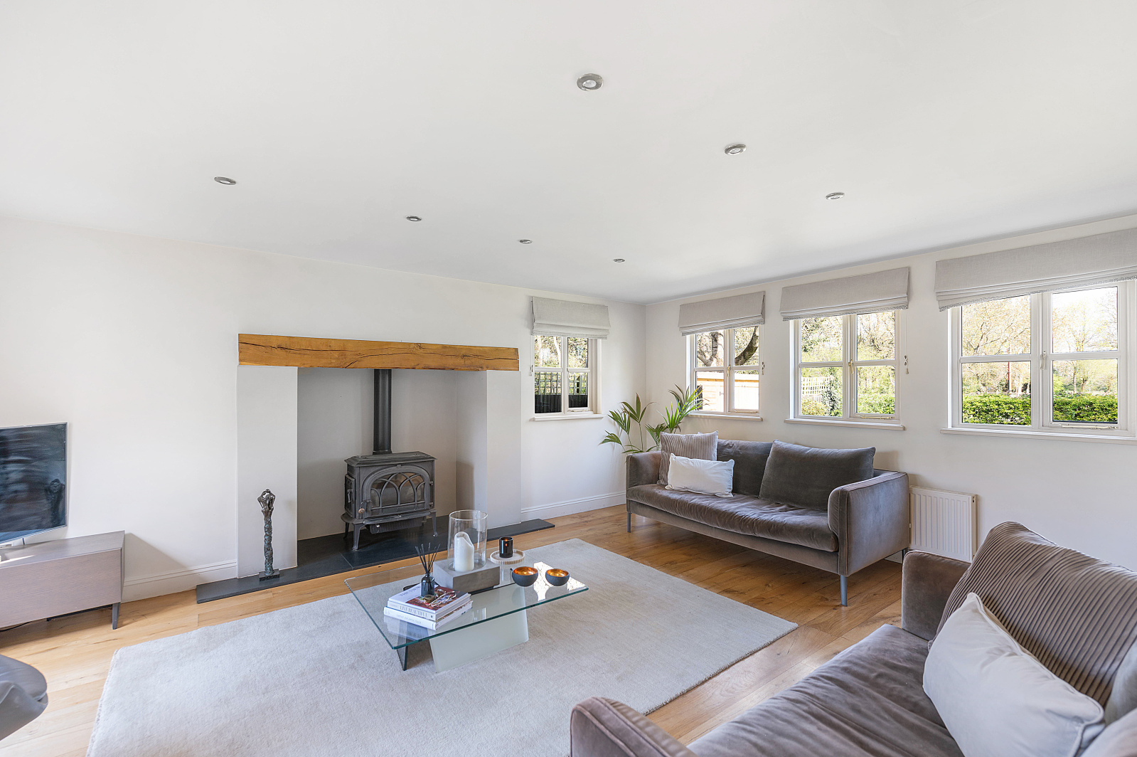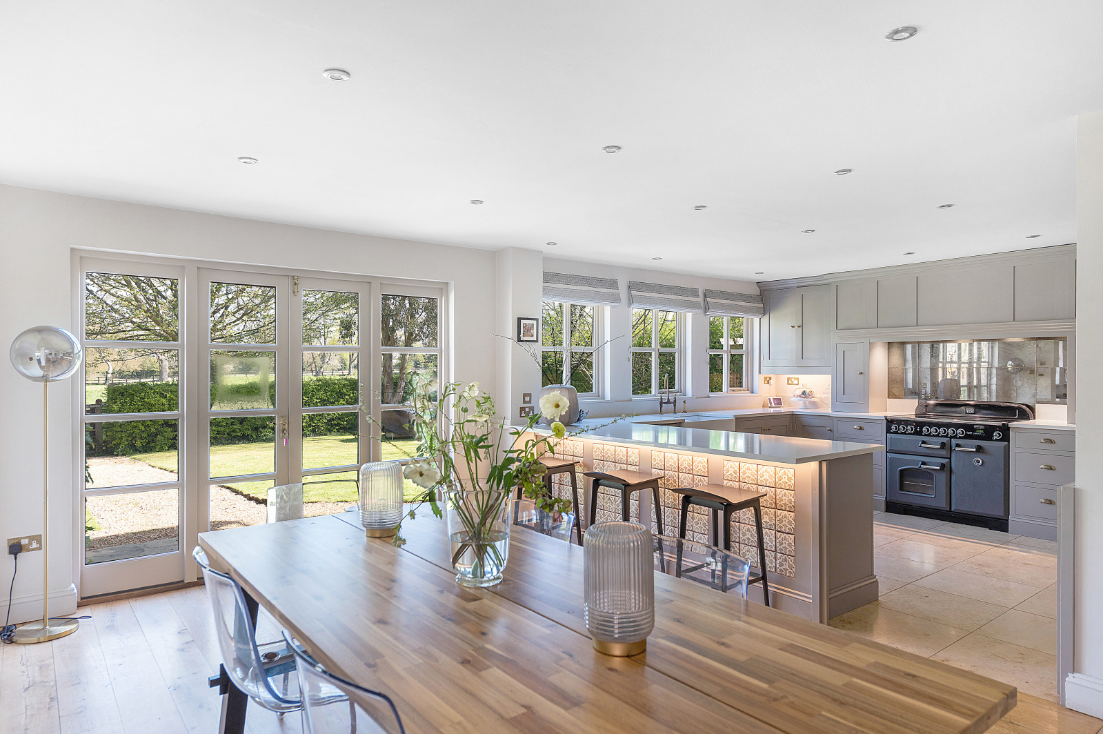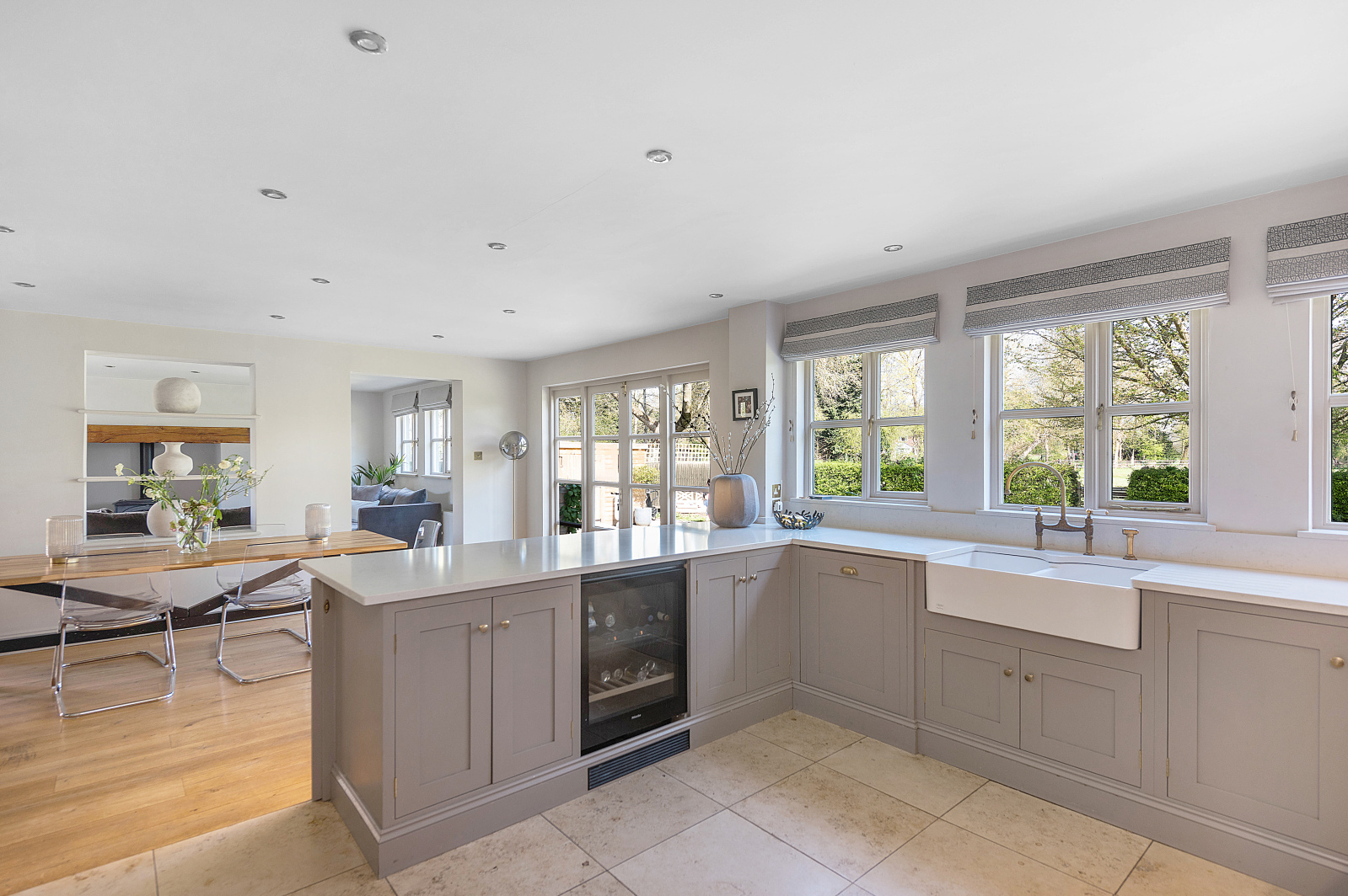 At the heart of the home, a stunning open-plan kitchen, dining, and sitting room stretches across the rear of the house, designed to bring people together. The bespoke solid wood kitchen, finished with elegant stone worktops and a breakfast bar peninsula, flows effortlessly into the dining space with French doors to the garden ideal for summer brunches or evening dinners under the stars. The sitting area, complete with a cosy wood-burning stove, opens onto a landscaped formal garden, offering a seamless indoor-outdoor lifestyle.