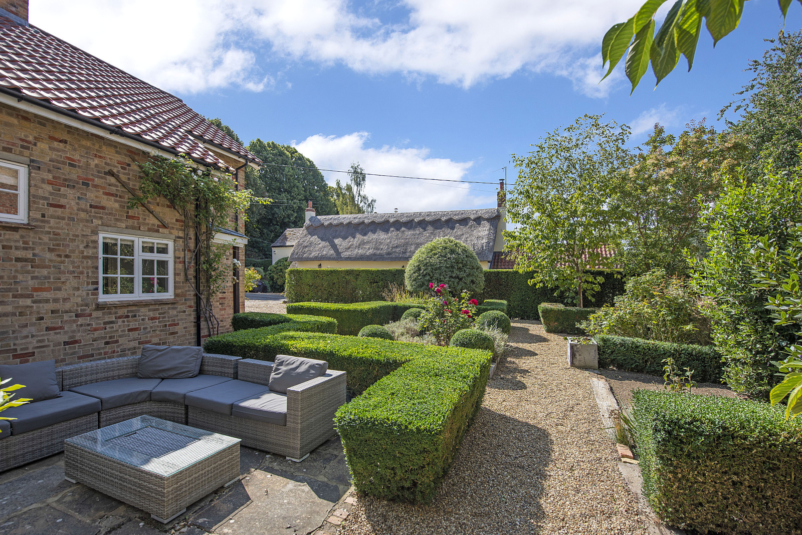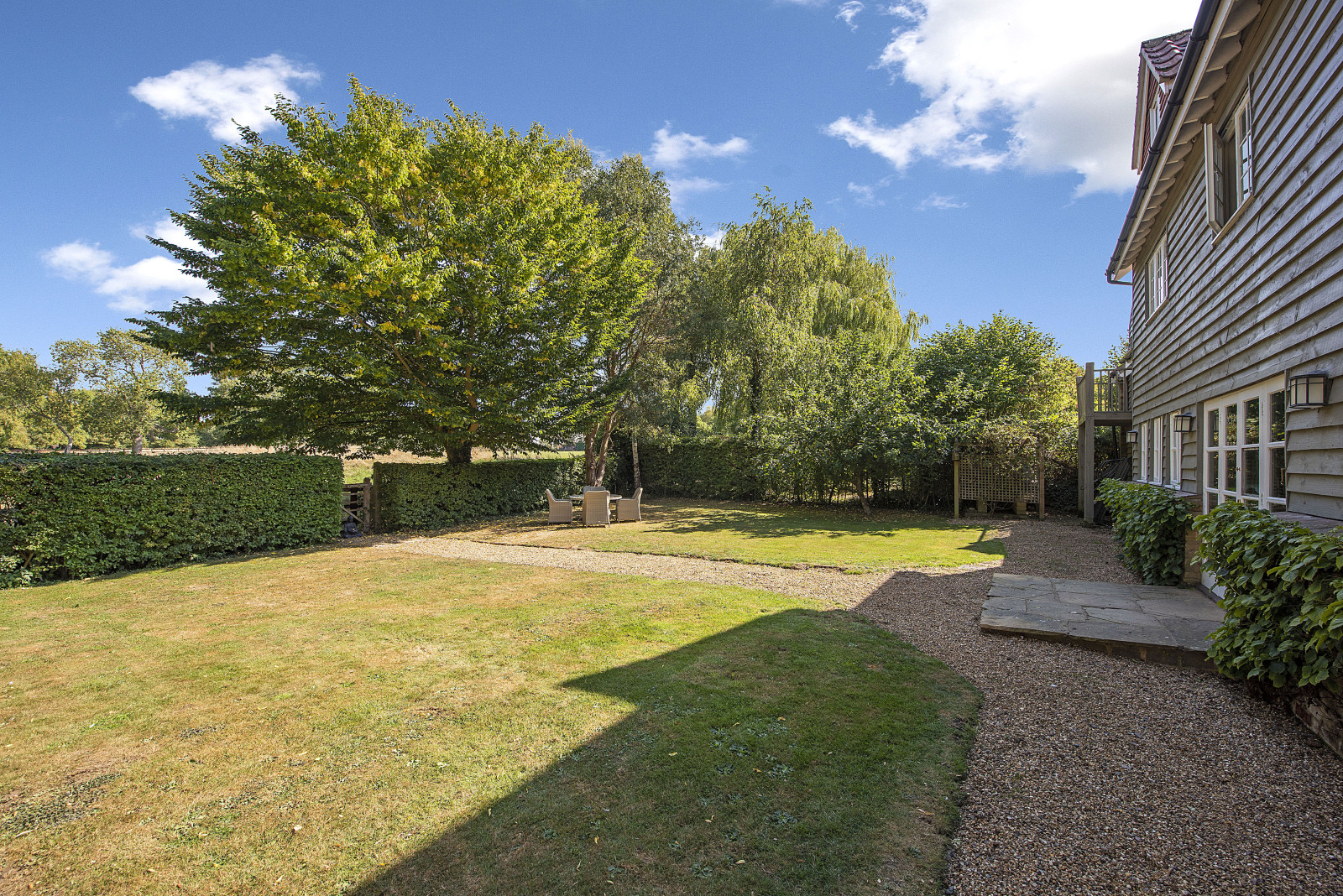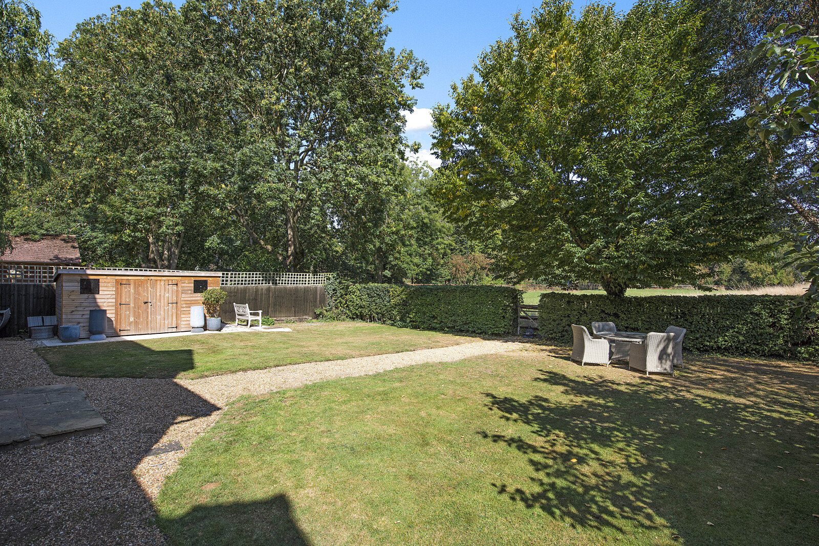Outside, a generous gravel driveway offers ample parking and leads to the garage. The front garden has been tastefully landscaped with formal hedging, creating a refined first impression. To the rear, the garden is a true haven backing onto open paddocks and mainly laid to lawn with a collection of mature specimen trees, it's a peaceful, private escape.