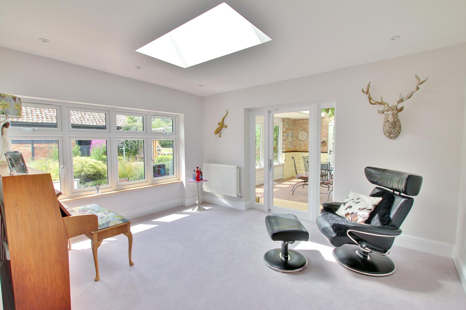 A vaulted-ceiling sitting room, bathed in natural light through bi-folding doors and Velux windows, connects to a charming music room and a spectacular orangery, creating a beautifully flowing living space with scope for multiple uses.