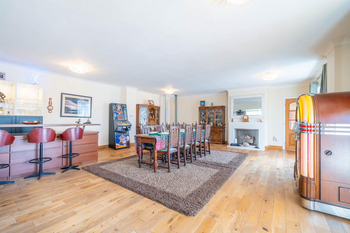 Inside, the ground floor features a spacious living room (16'6" x 18'1"), perfect for relaxation and family gatherings. The expansive dining area (25'6" x 23'8") is ideal for hosting dinner parties and celebrations, flowing into a sunroom (21'11" x 12'8") that offers picturesque garden views. The well-appointed kitchen includes a practical pantry, and a separate laundry room adds convenience. A dedicated study provides a quiet space for work, while a stylish bar area enhances entertaining options. The ground floor is completed by an entrance hall and a porch, with internal access to the garage via the sunroom.