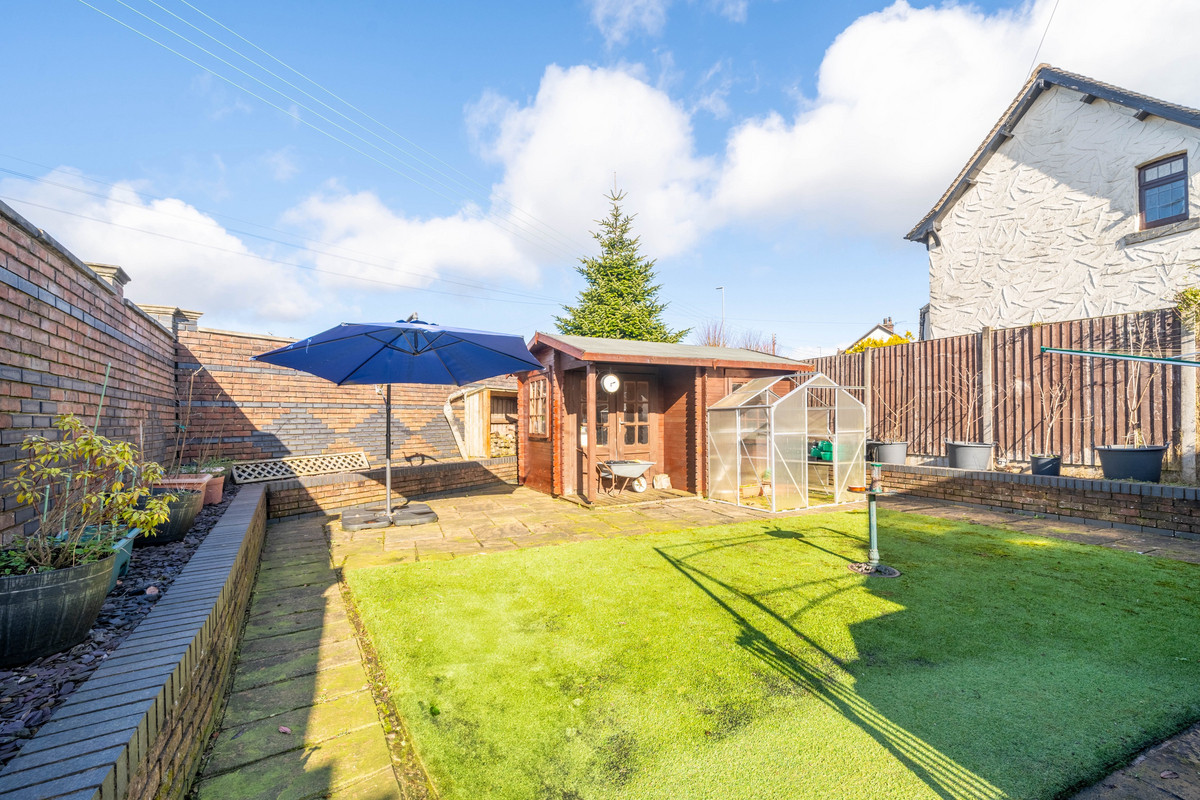 Externally, The Dainty boasts a neutral white facade with sleek black window frames and a dark grey tiled roof. A covered porch supported by pillars enhances the entrance, while privacy is ensured with a surrounding brick wall and mature hedging. The detached garage offers parking and storage, and the rear garden features artificial turf and paved areas for low-maintenance enjoyment. A brick wall with alternating red and dark grey bricks adds character, complemented by a wooden shed and greenhouse for gardening enthusiasts.