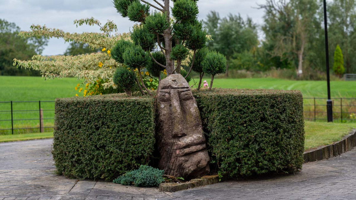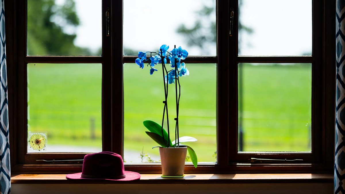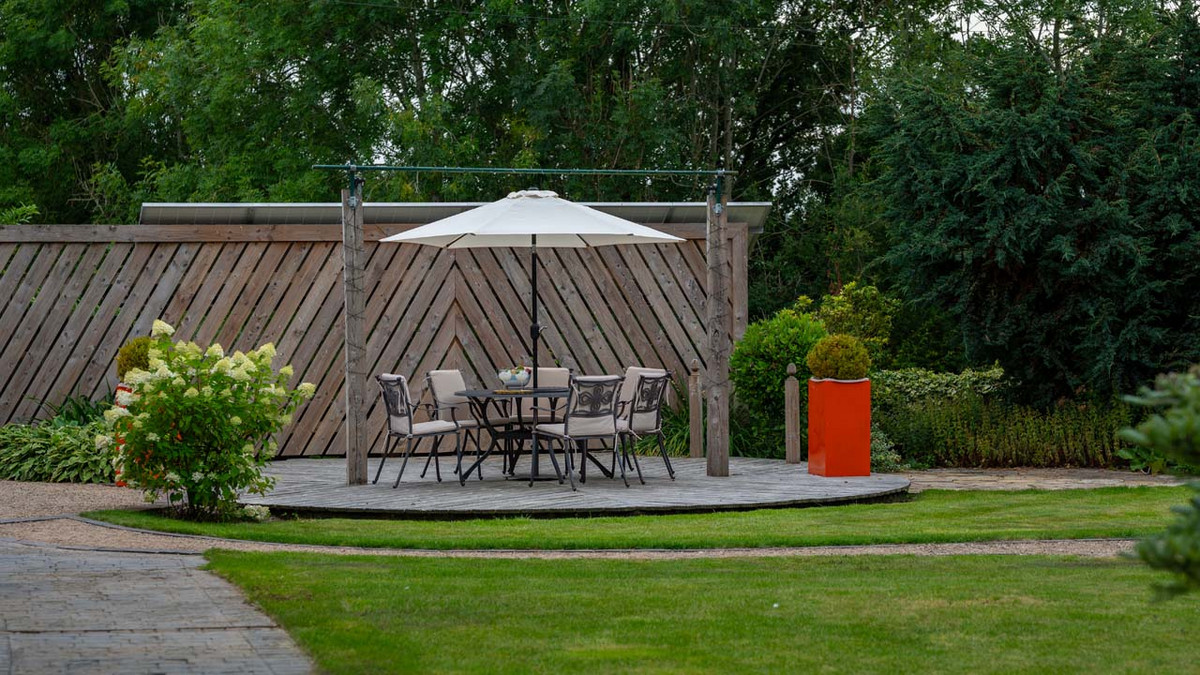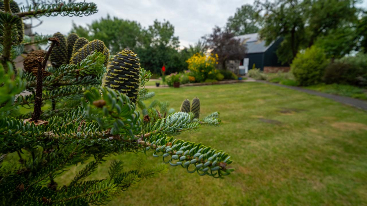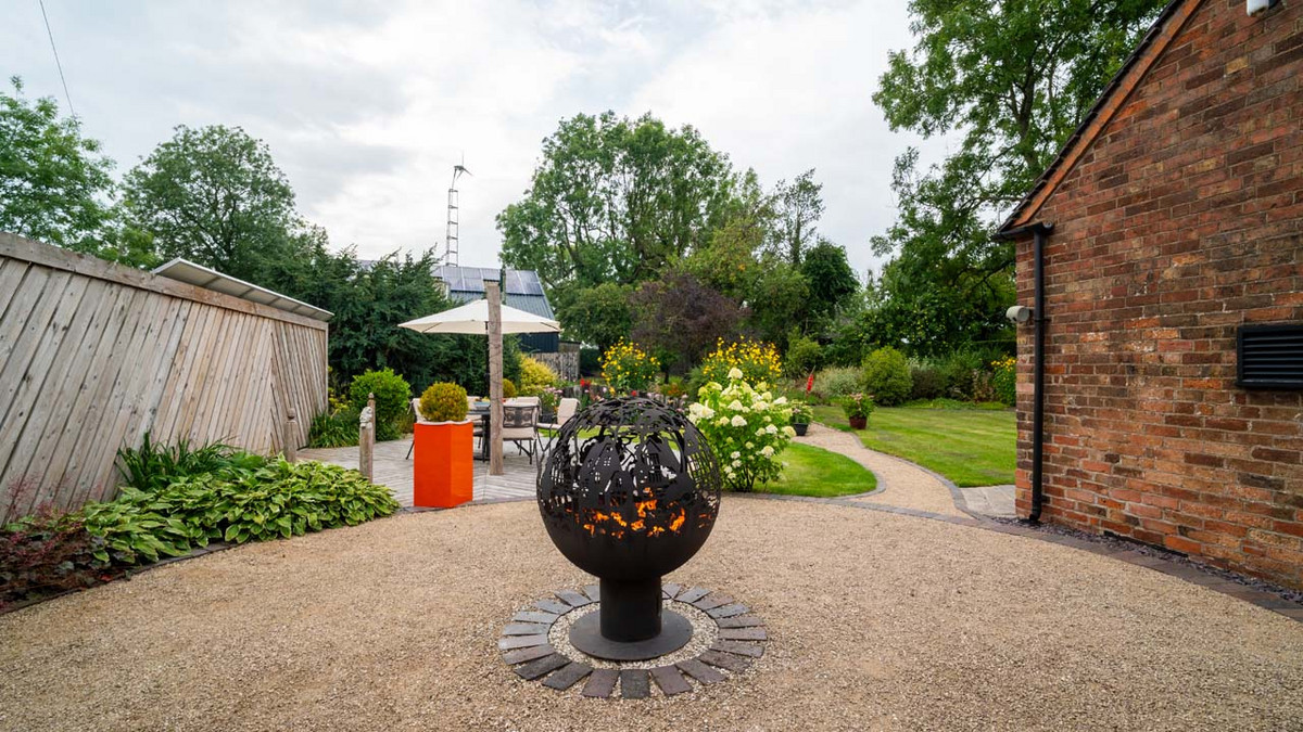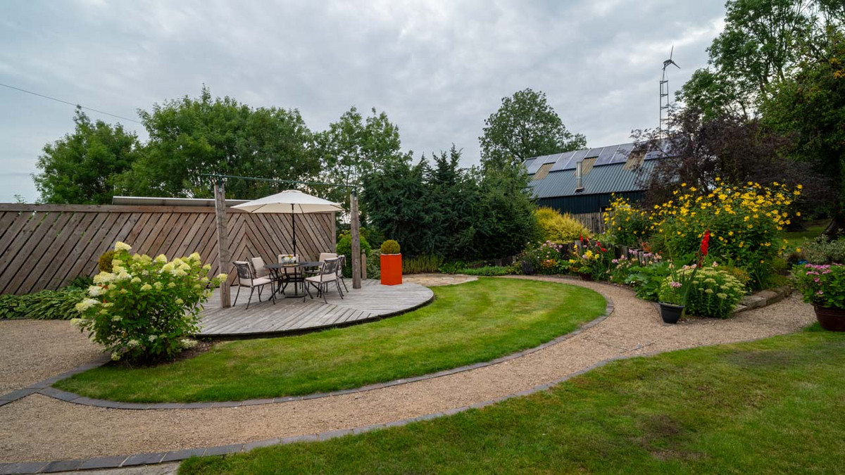 - Landscaped gardens with floral borders, mature planting, and countryside views