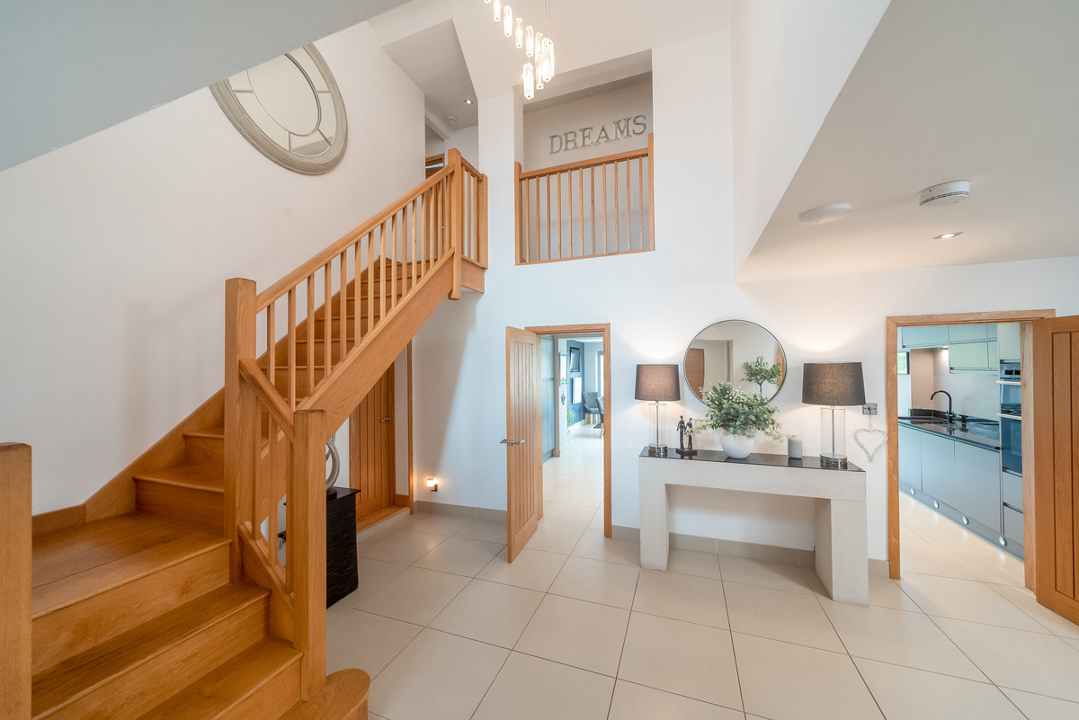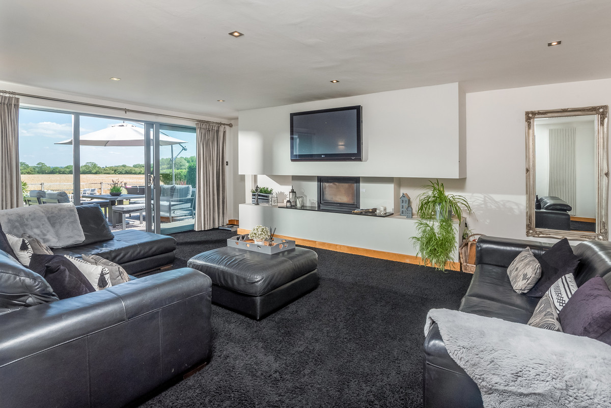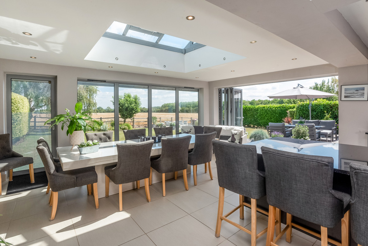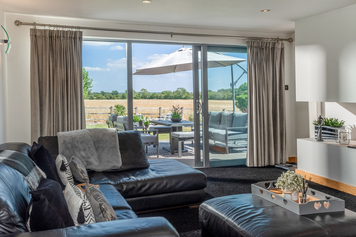The main house is modern with ample living space and stunning views of the countryside. A modern open plan kitchen has bi-folding doors opening out to the patio and entertaining area with all integrated appliances and plenty of storage. Spacious reception hall, lounge with sliding doors, study, utility room and cloakroom.