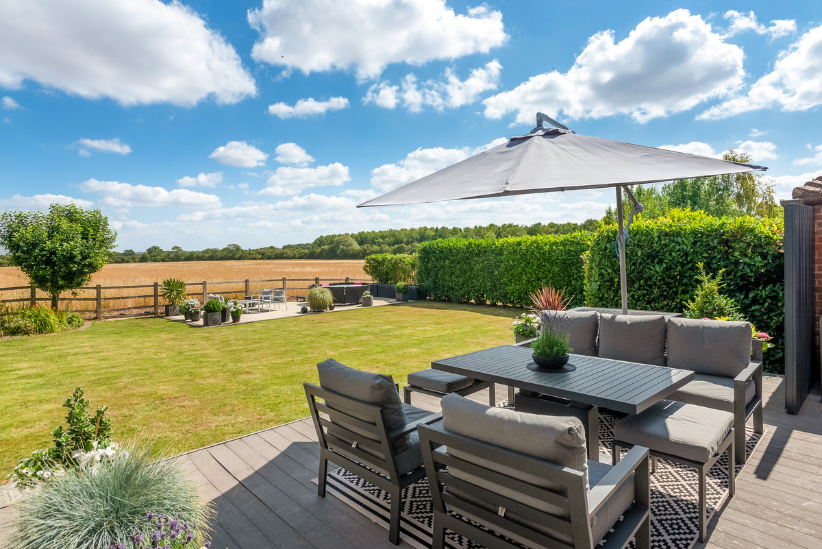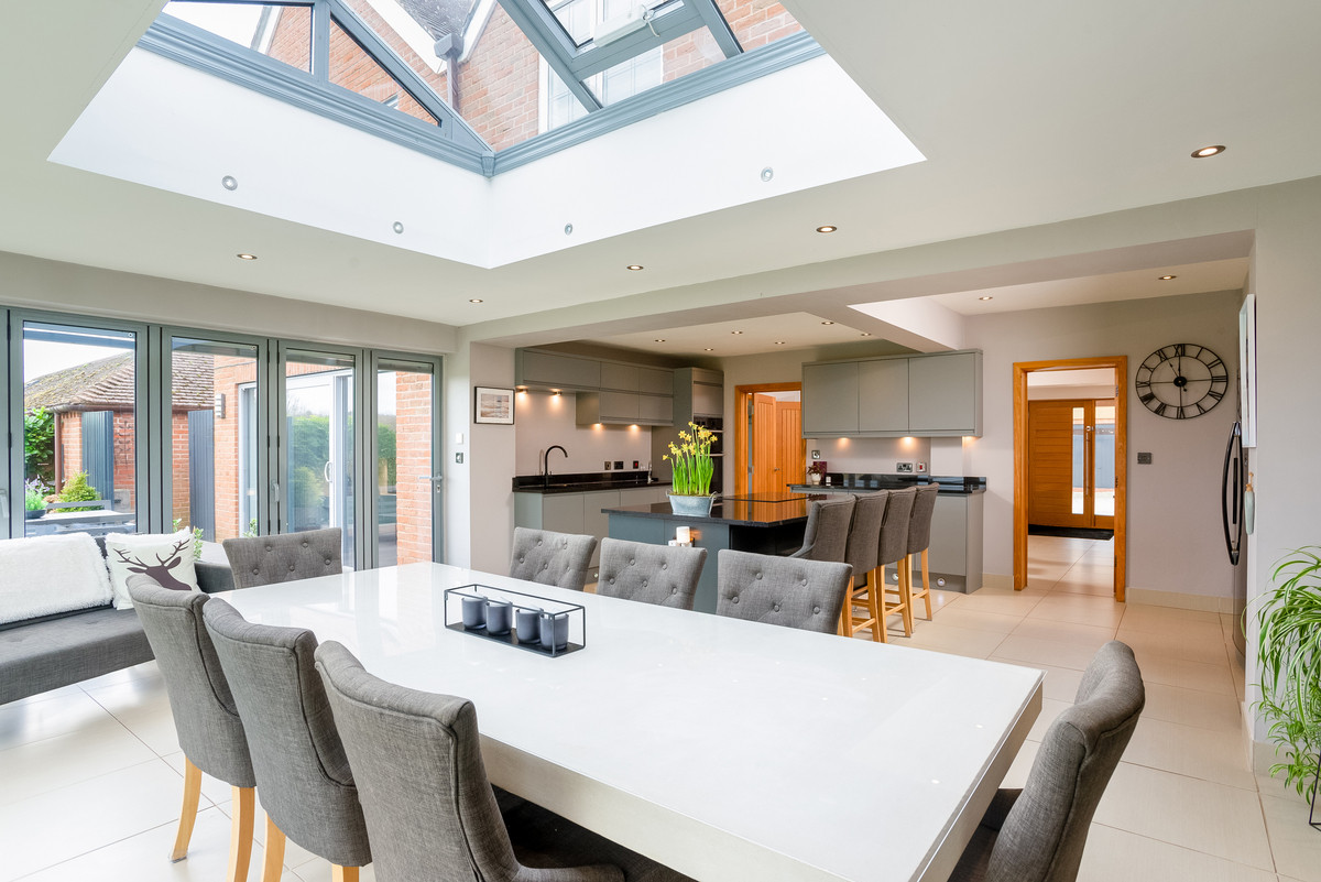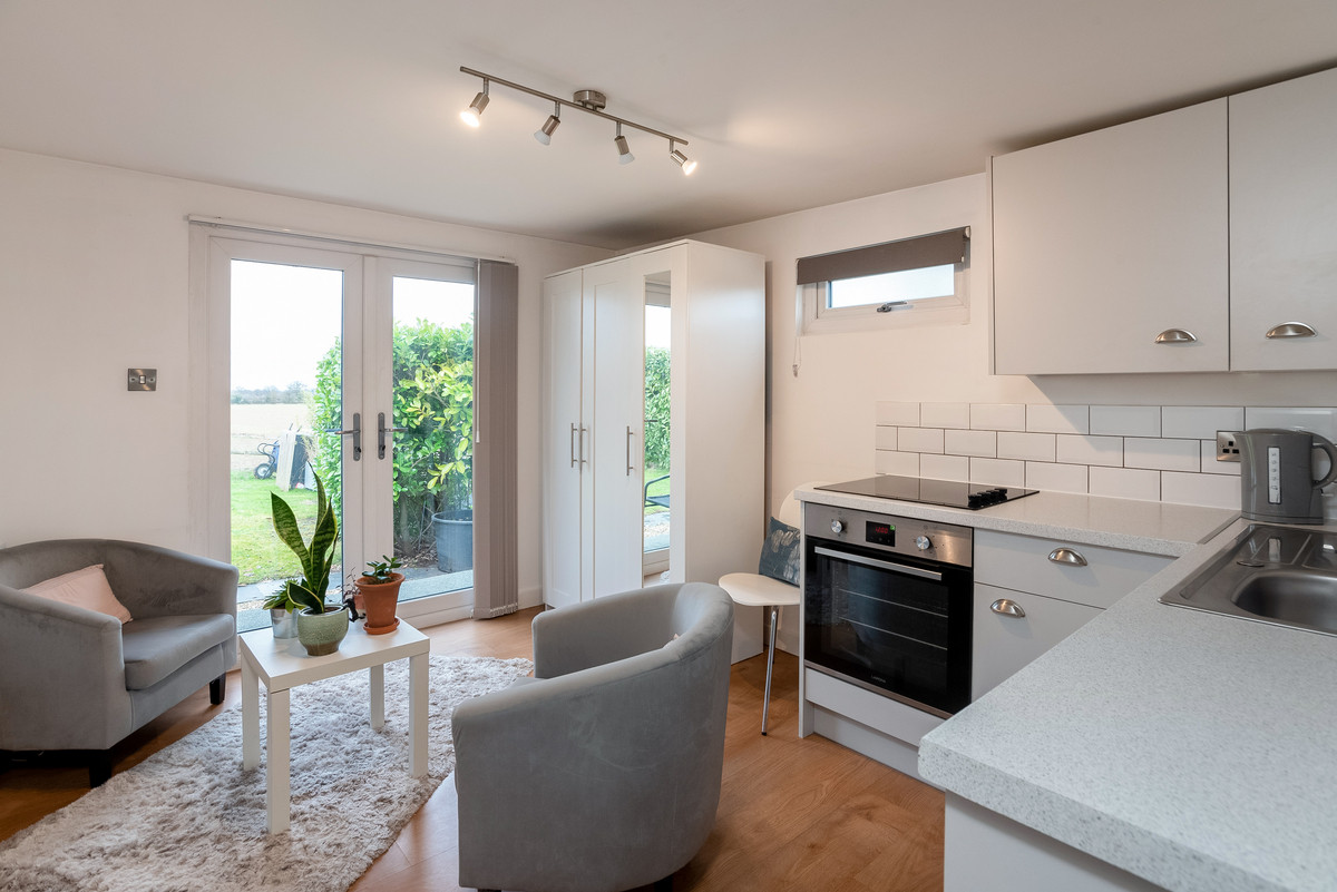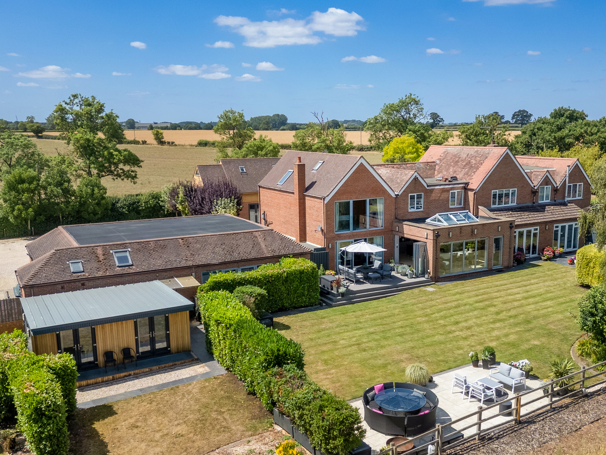 The main house is modern with ample living space and stunning views of the countryside. A modern open plan kitchen has bi-folding doors opening out to the patio and entertaining area with all integrated appliances and plenty of storage. Spacious reception hall, lounge with sliding doors, study, utility room and cloakroom.