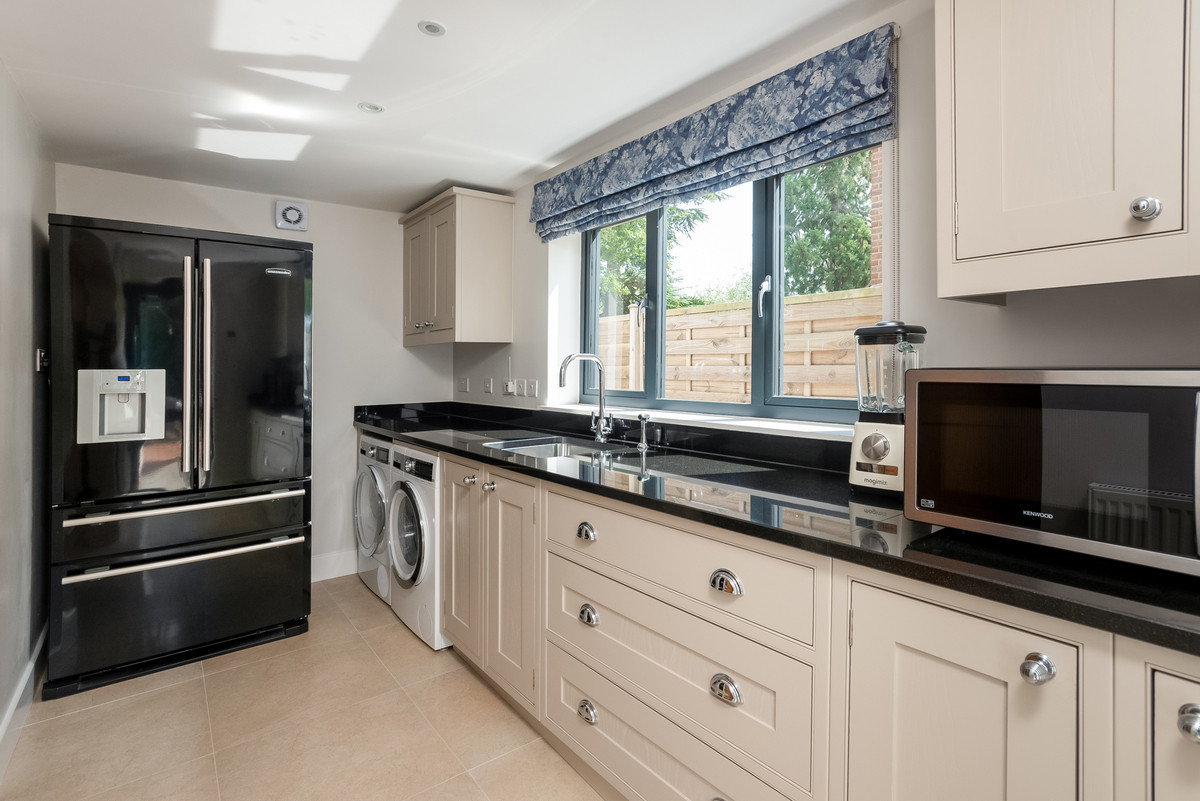 There is a separate fully-fitted utility room with washer and dryer, free-standing plumbed fridge/freezer, and doors to the garage and rear garden.