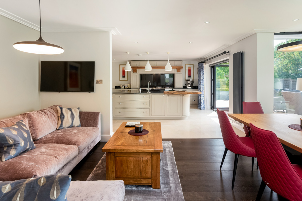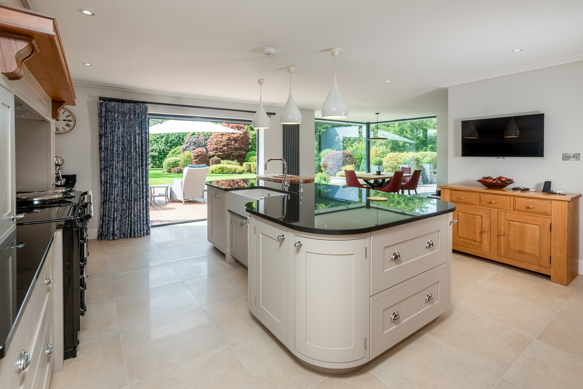 The kitchen/dining/family room has bi-folding doors to the rear garden. It is beautifully appointed with a modern electric Aga and Aga Companion, built-in fridges, dishwasher and a large centre island/breakfast bar. With a combination of tile and timber flooring, there is underfloor heating in this area.