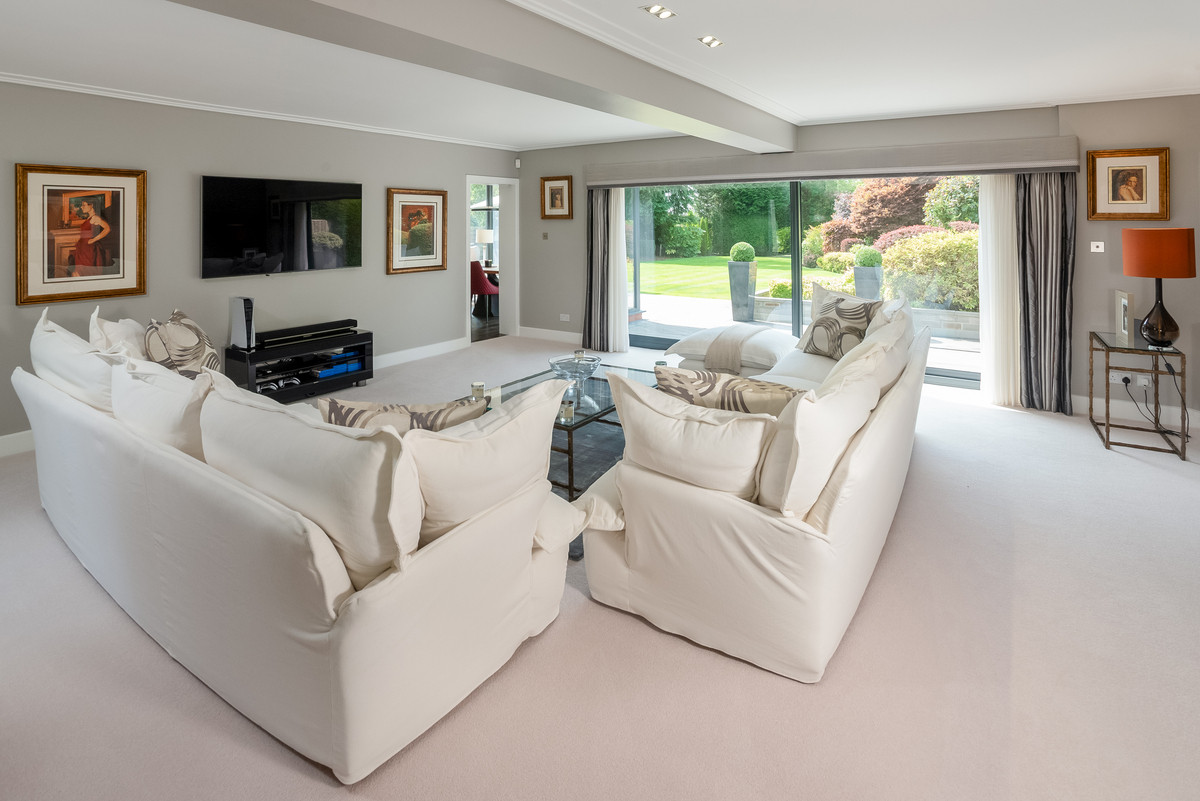 From the hallway, with timber flooring, there is a cloakroom and separate coats cupboard. The spacious sitting room has a double aspect, with large sliding doors to the rear patios.