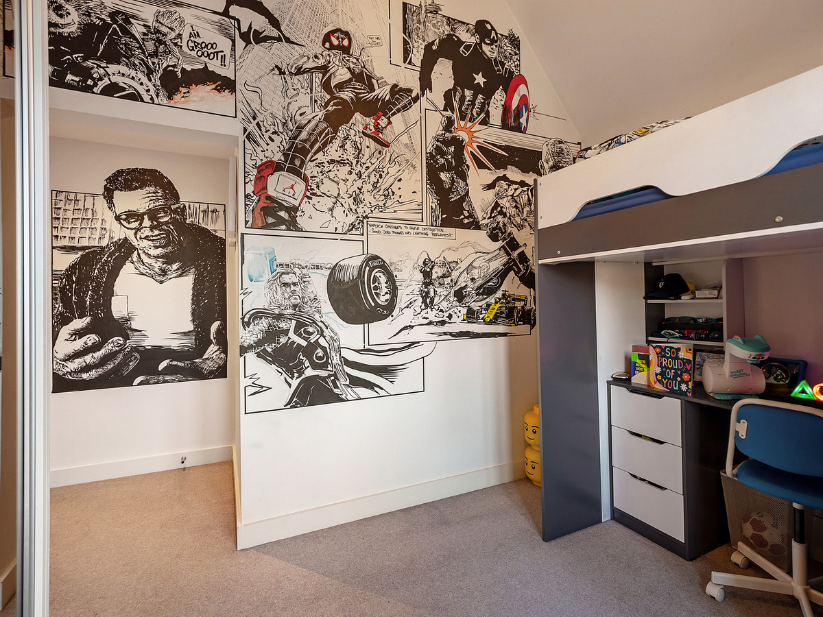 The spacious double-height entrance hall, with a galleried landing above is light and inviting. This leads into the open plan living space to the right and a family room to the rear. The beautiful open plan kitchen with its quart’s countertops, induction hob, built-in double ovens fridge-freezer, dishwasher and wine fridge, has ample storage and a large breakfast bar ideal for entertaining whilst cooking. The kitchen area flows into the dining area which benefits from a large internal picture window that floods the space with light and leads seamlessly into the living area with bifold doors out into the rear garden.