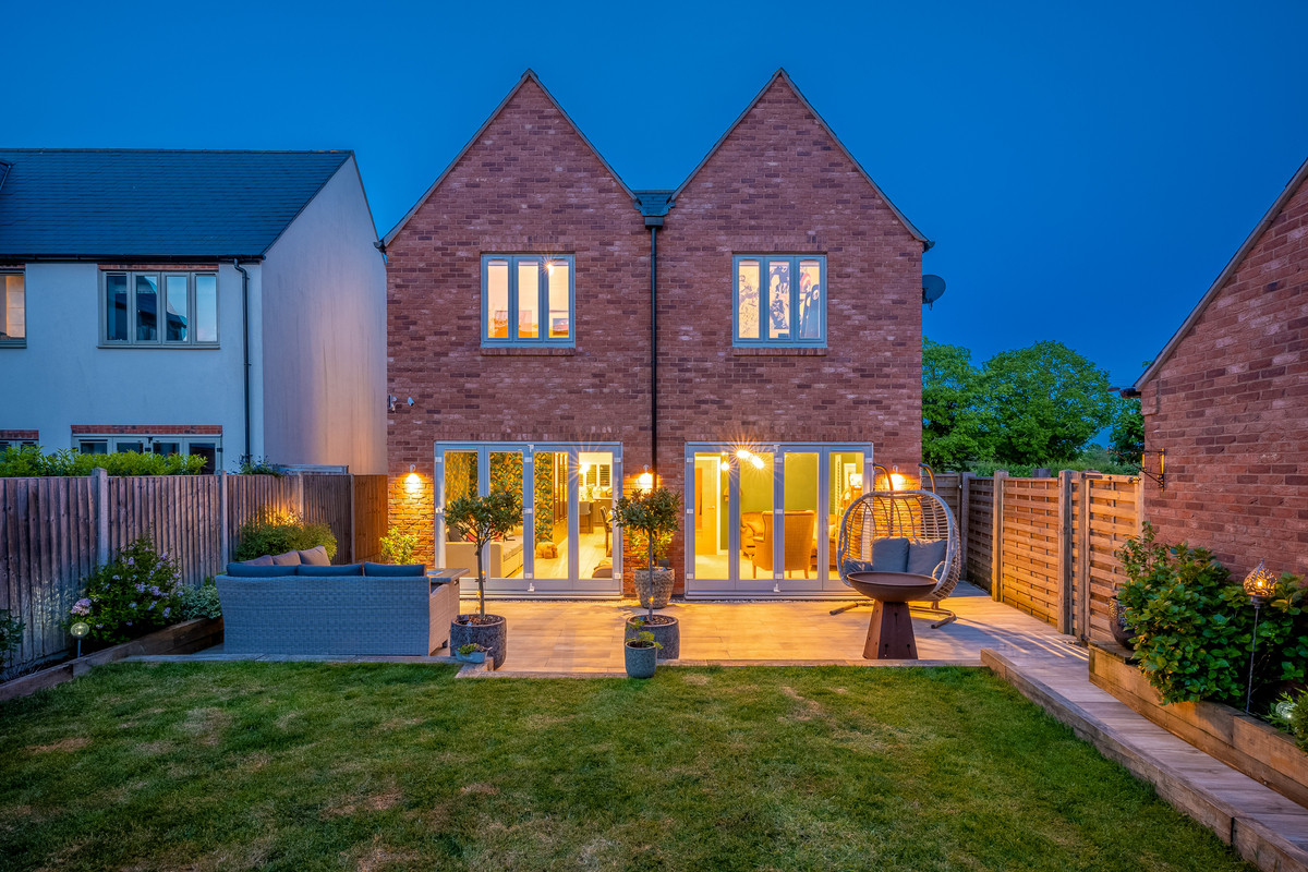The beautifully presented rear garden can be accessed from two sets of bifold doors to the rear of the property or via side access and features a large porcelain tiled patio area with mature borders, a raised lawn and access to the double garage to the side of the property.