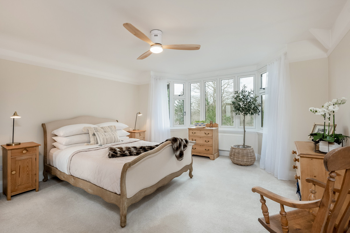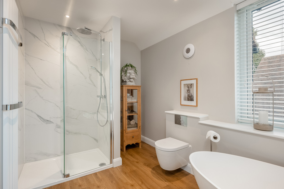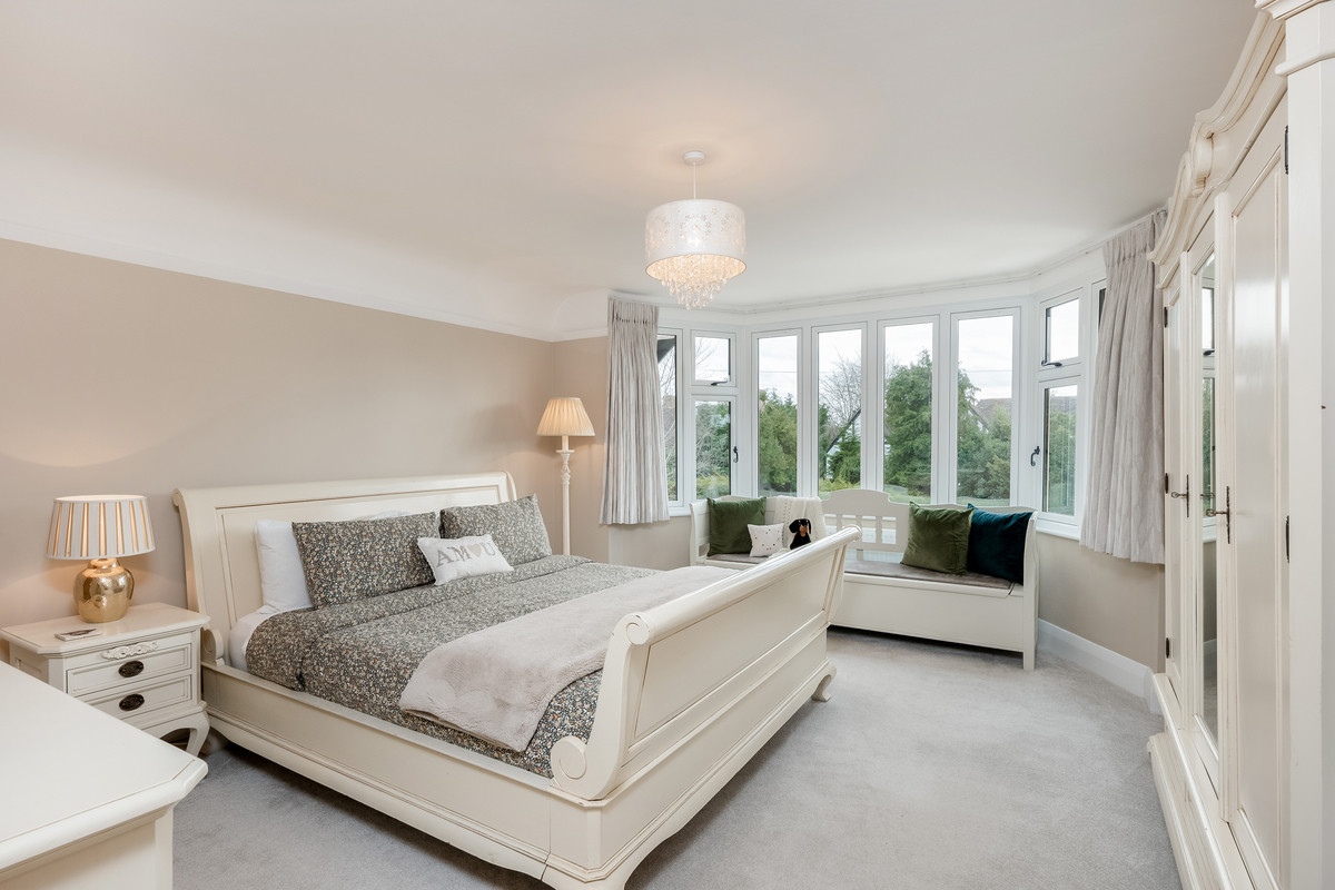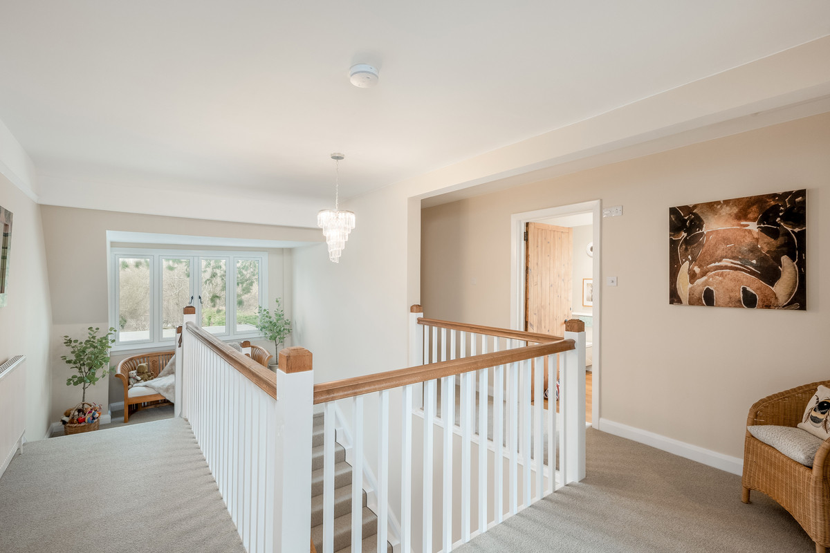 A switchback staircase with a large half landing and large picture windows, leads to the first floor. The generous sized main bedroom with bay window overlooking the river at the back of the house benefits from a spacious ensuite shower room and walk in wardrobe/storage area. Another generous sized double bedroom with bay window to the front also benefits from an ensuite shower room. Bedrooms three and four are serviced by the large family bathroom, with separate walk-in shower and freestanding bath.