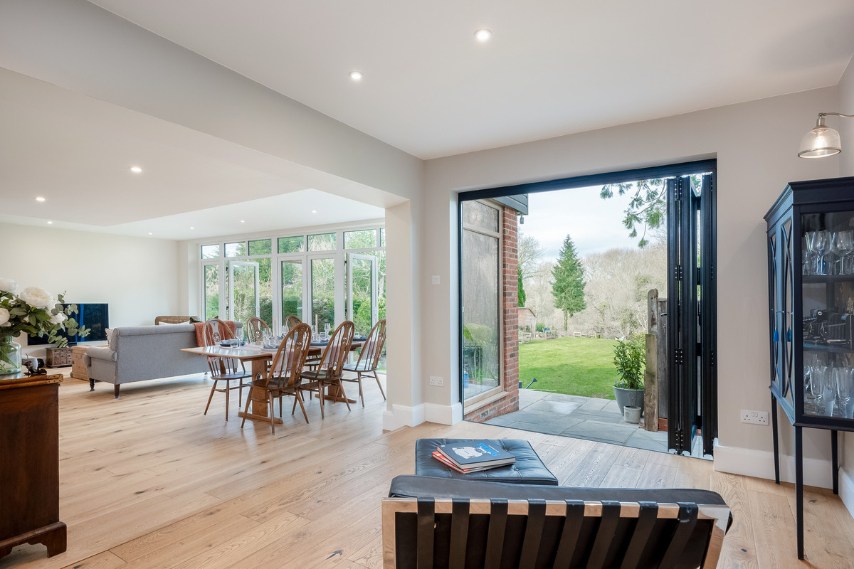 The beautiful timber front entranceway leads to a spacious and light hallway, with guest cloakroom, which flows seamlessly into the rear open plan kitchen, dining and living area with views out over the garden to the river beyond.