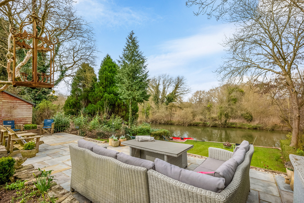 The rear garden can be accessed from a side gate at the front or through the open plan kitchen, living and dining area which lead to a patio area with steps down into the generous sized garden. The garden is mainly laid to lawn with mature tree and shrub borders. A large patio at the rear of the garden enjoys views over the river and countryside beyond and steps lead down to a mooring point on the river.