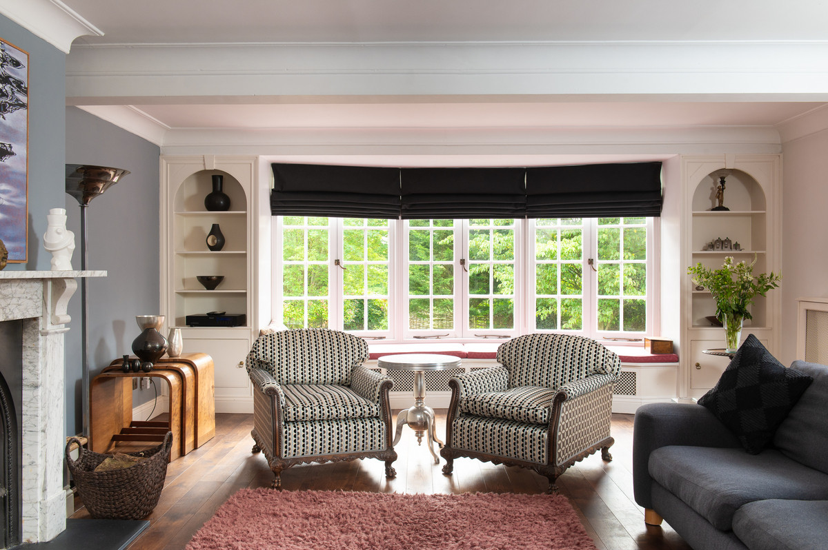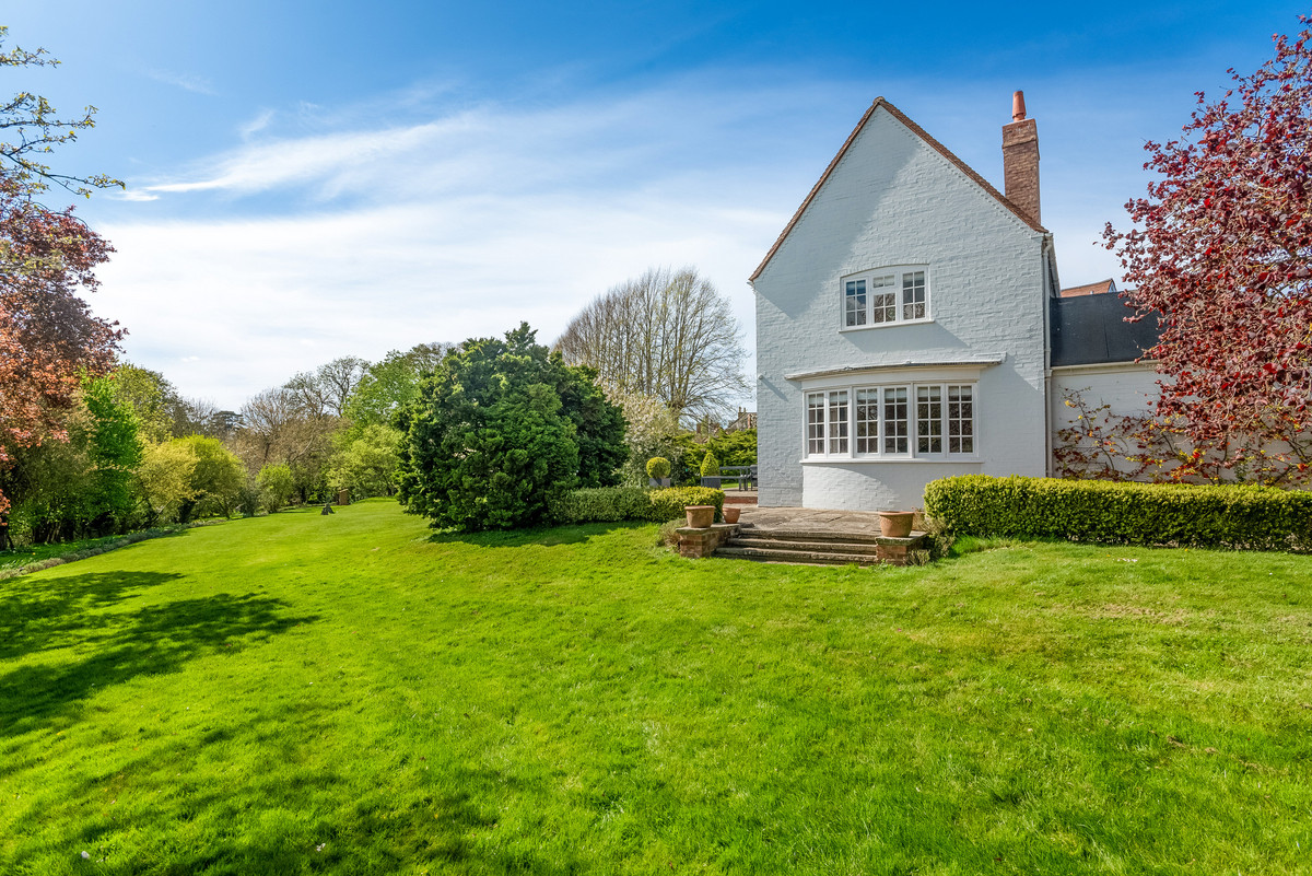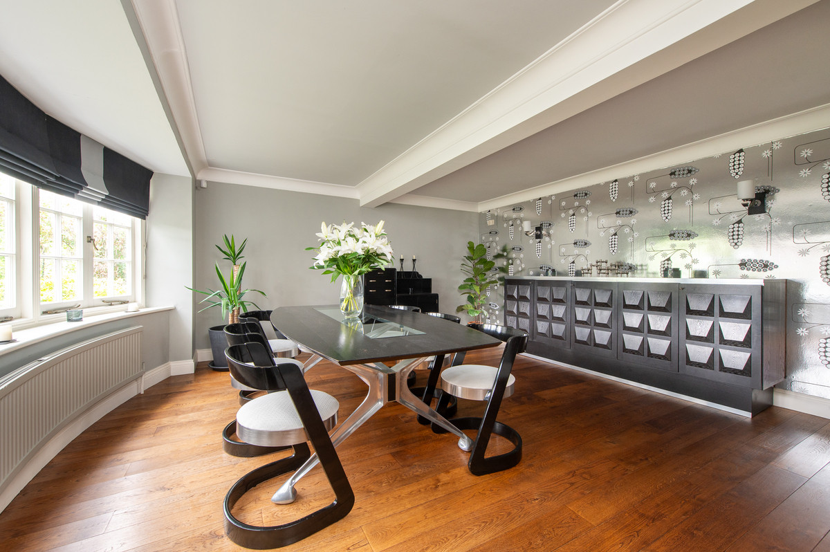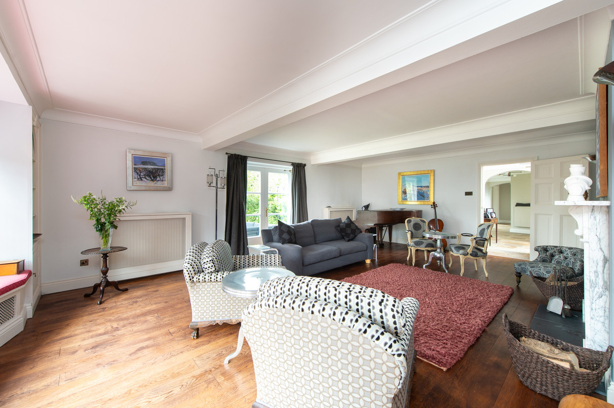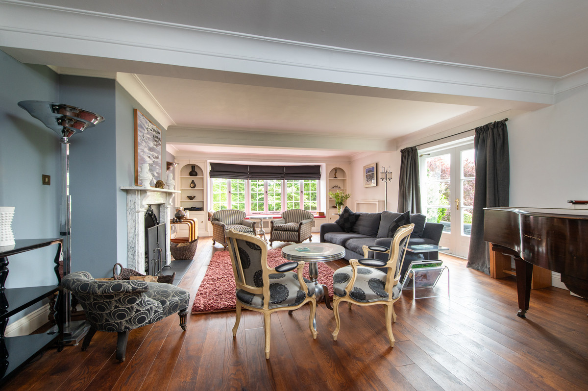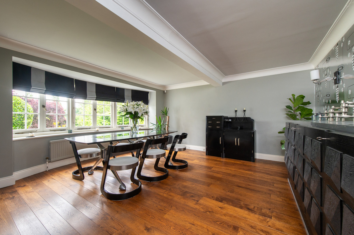 A lovely drawing room has a bow window to the end and French doors to the garden with super views. There is a beautiful fireplace and timber flooring. The dinning room, also overlooking the gardens, with large bow window and timber floor.