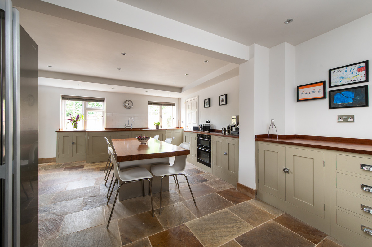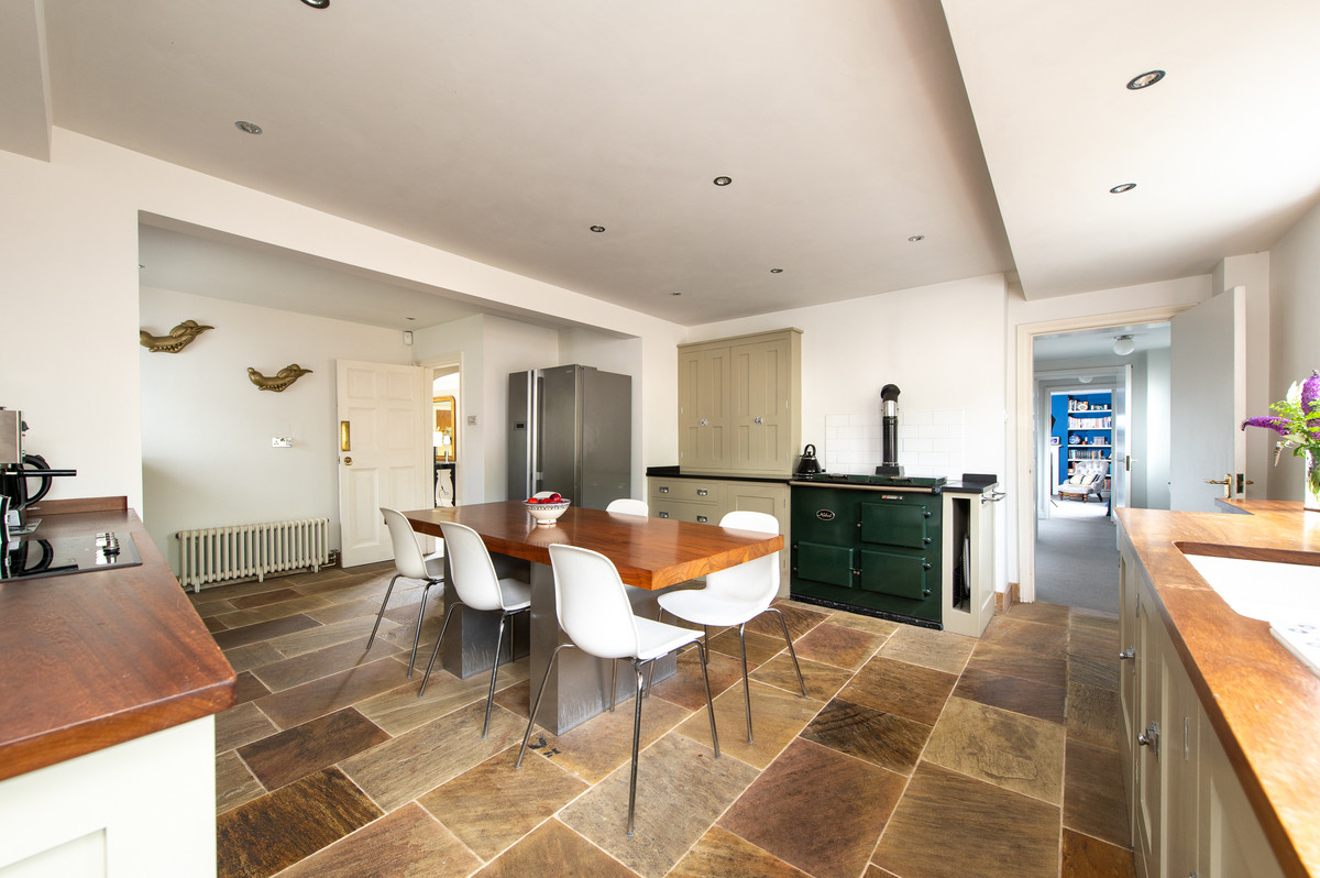 The kitchen, with stone flooring, has handmade units, Nobel Range Cooker and separate fitted ovens and hob. There is a large walk-in pantry, two useful storerooms and a utility room.