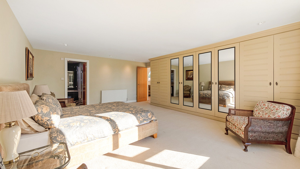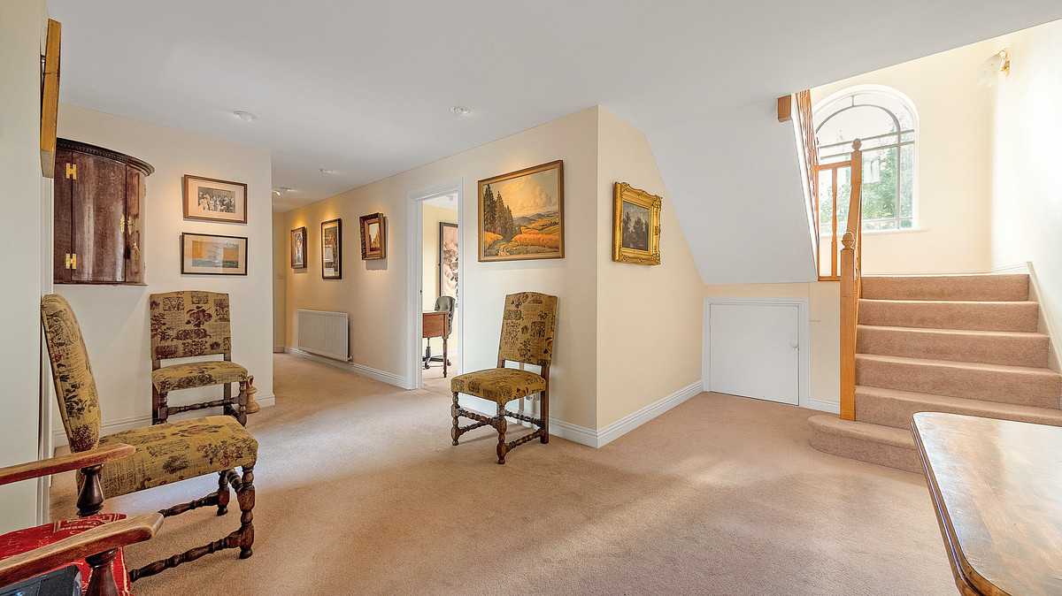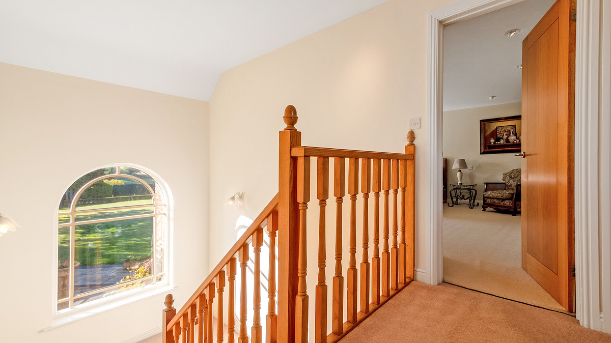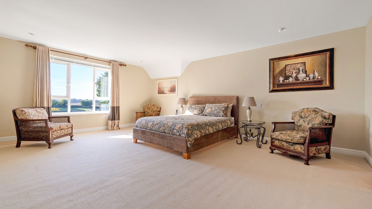 A wide L shaped staircase with a Venetian-style half-landing window rises to a generous landing/sitting area with walk-in airing cupboard and store cupboard. The spacious principal bedroom suite benefits from a wall of built in wardrobes, a generous ensuite and spectacular views out over open countryside.