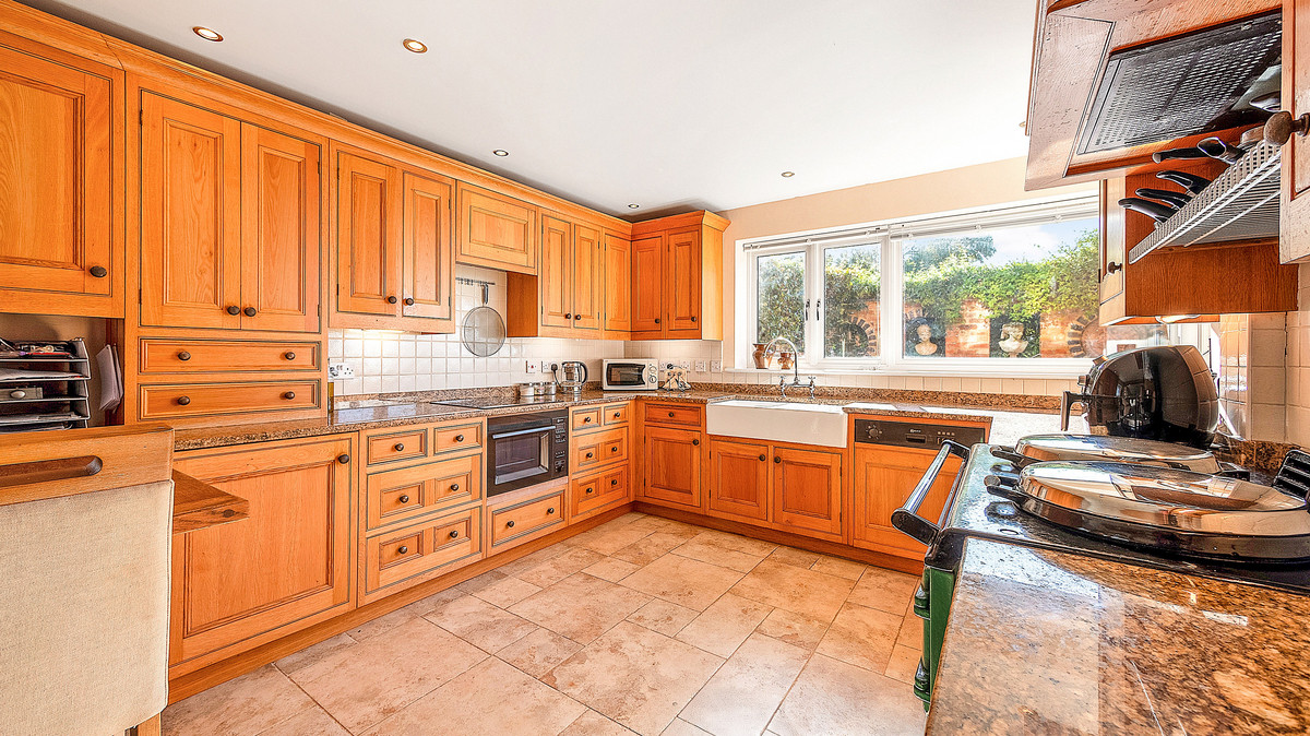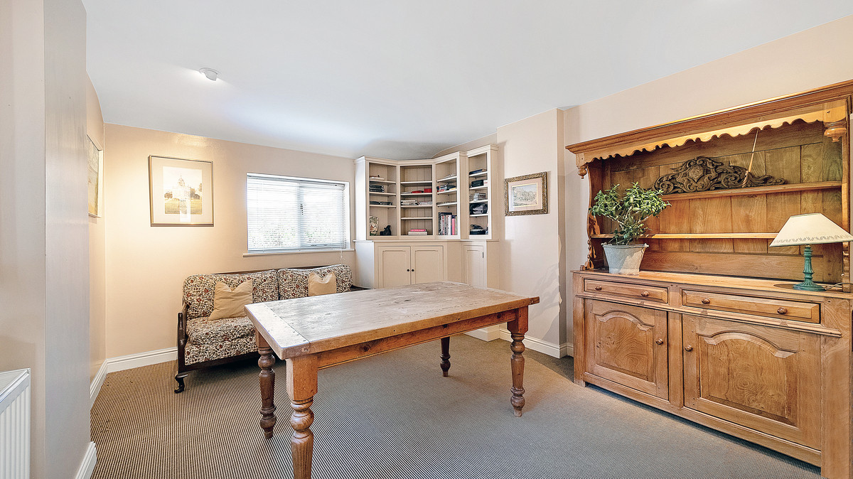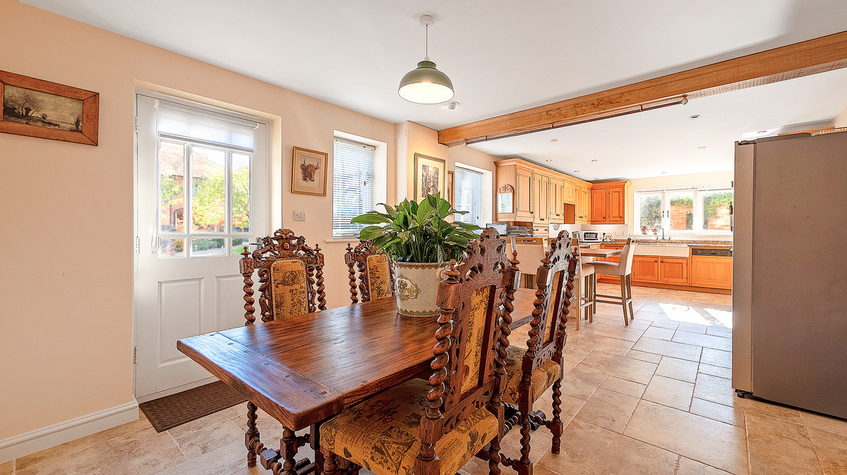 The large open plan kitchen/breakfast room benefits from both a two-oven oil-fired Aga and an integrated electric cooker and hob, as well as a breakfast bar and space for an American style fridge freezer. A large corner window in the kitchen provides views out to the garden and beyond and the breakfast area benefits from additional windows and a door out to the side of the house.
