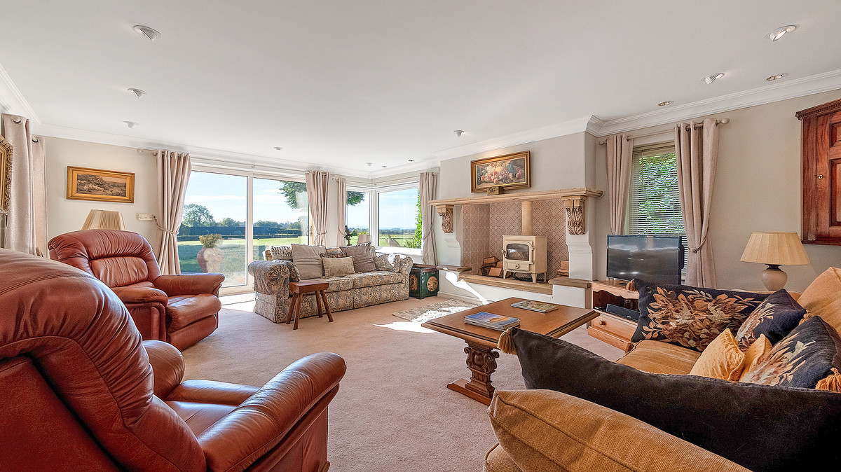 An enclosed entrance porch leads to the generous reception hall which gives access to a large drawing room, with spectacular views over the land from dual aspect windows and patio doors leading out to the patio and garden beyond. A beautiful large fireplace with wood burner, tiled interior and ornate wooden mantel is also focal point of the room.