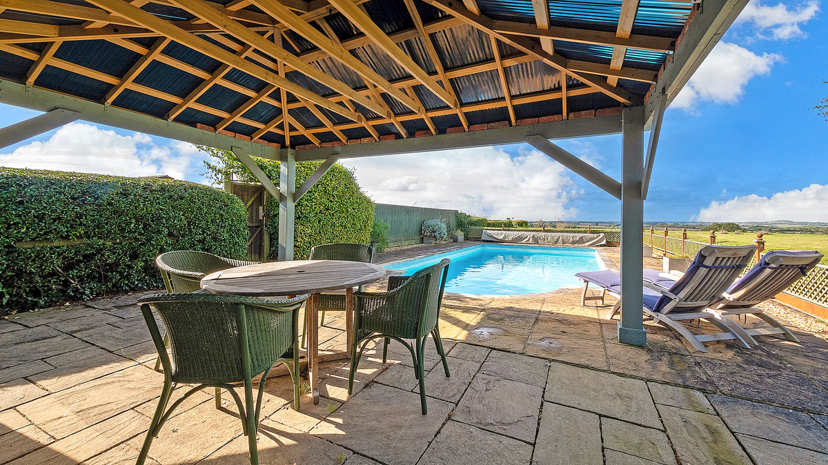 Approached by a gravel drive there is space for more than 6 cars with a separate parking area also available for the annexe. The large decoratively paved patio on the South elevation provides a sun-trap and for stunning al-fresco dining opportunities. With its exceptional views this then leads out onto the lawned area which in turn leads to a outdoor heated swimming pool and pool house.