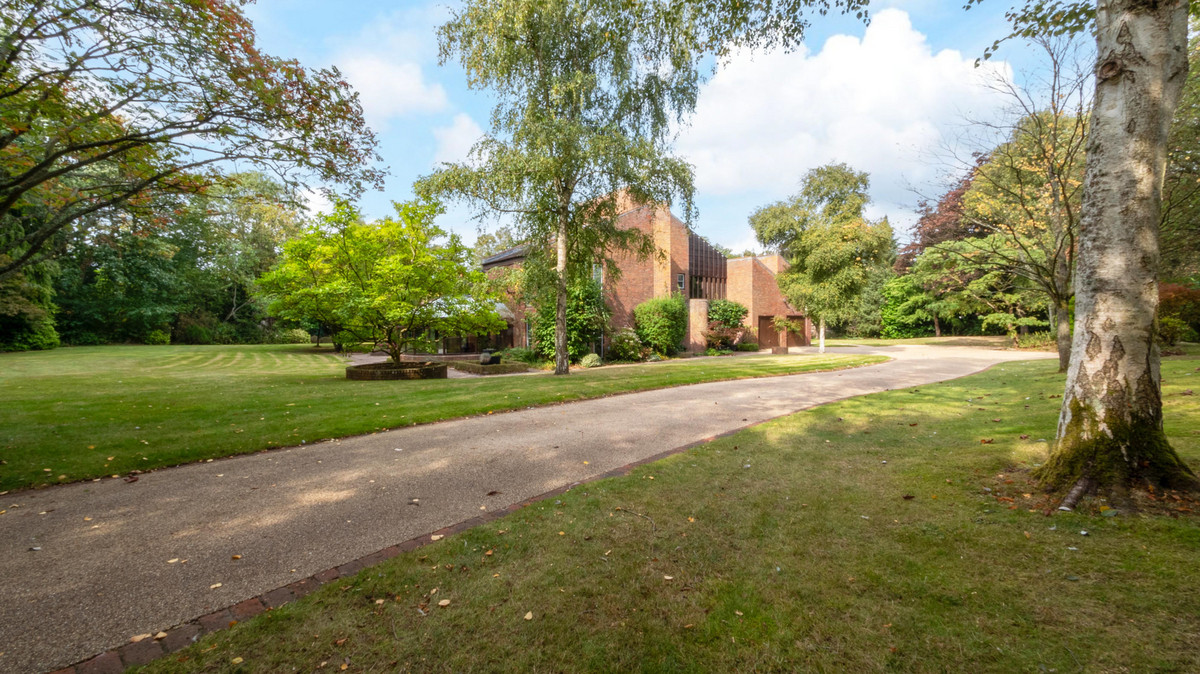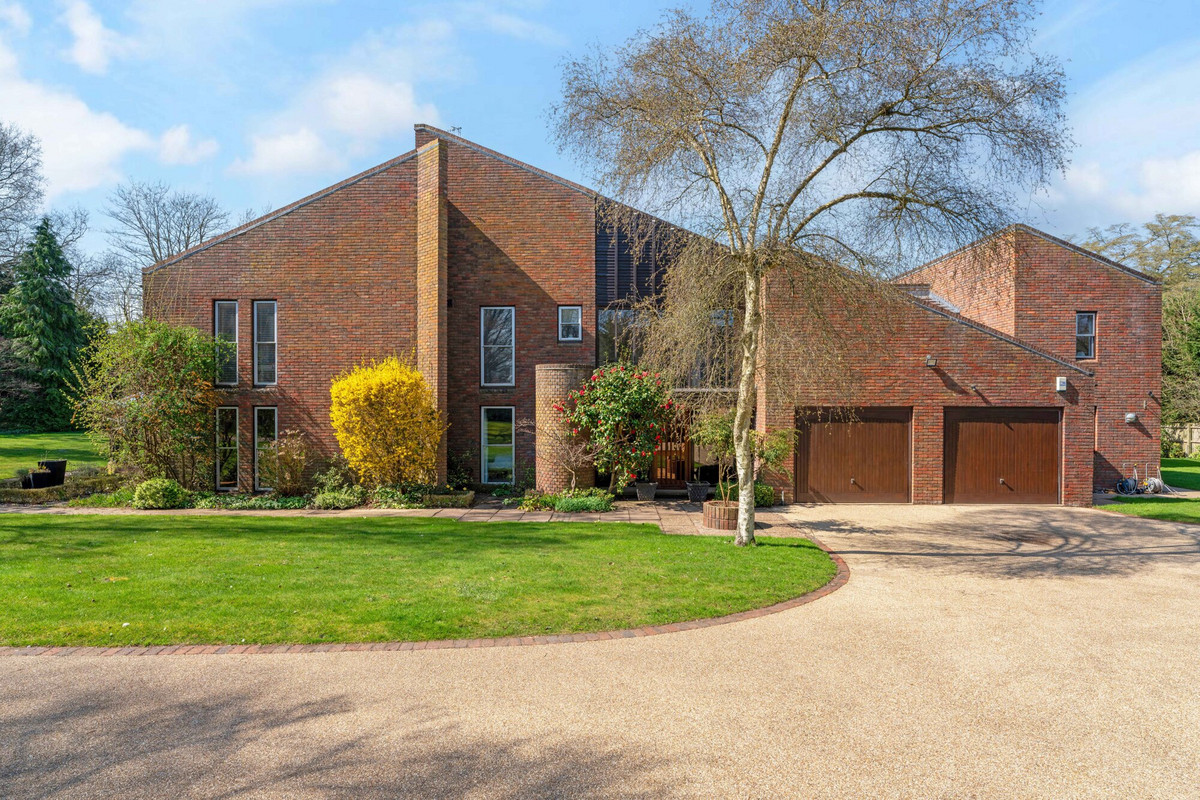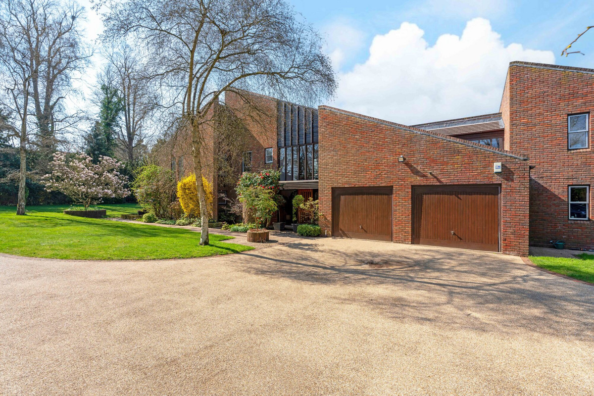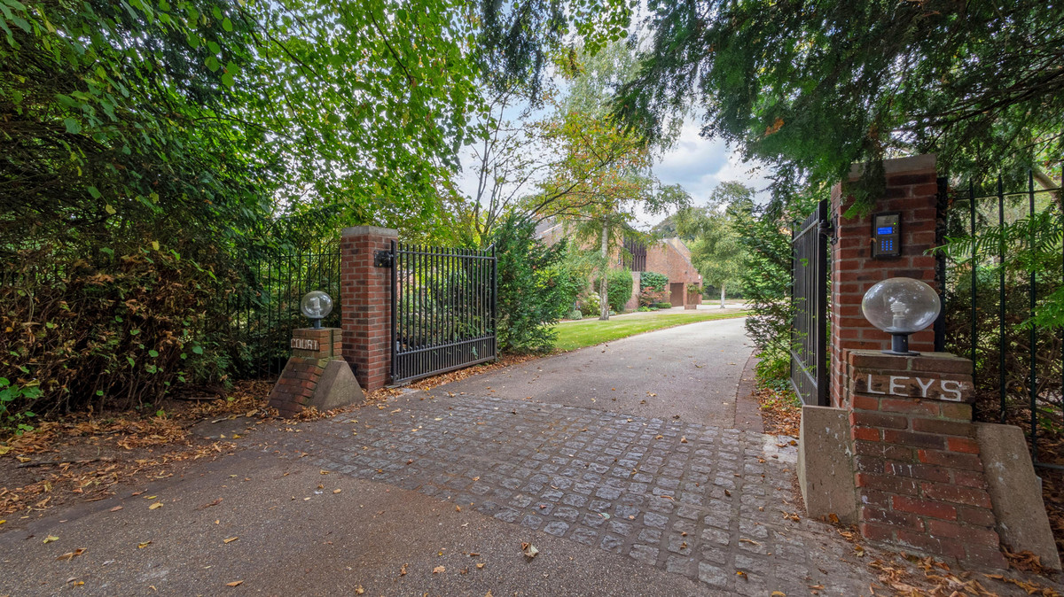 Gates open to a sweeping drive with ample parking in front of the double garage.