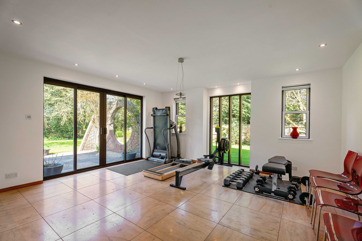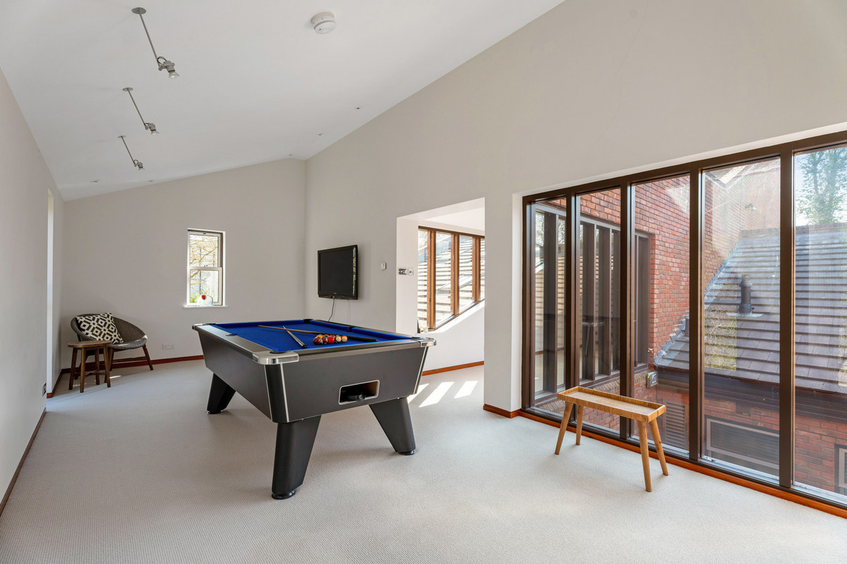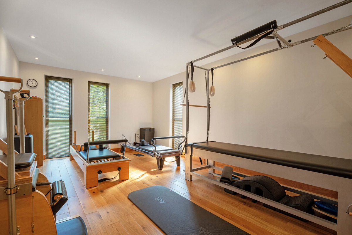 In the east wing is a ground floor bedroom, bathroom and sixth bedroom, currently set up as a Pilates studio. The conservatory adjoins.