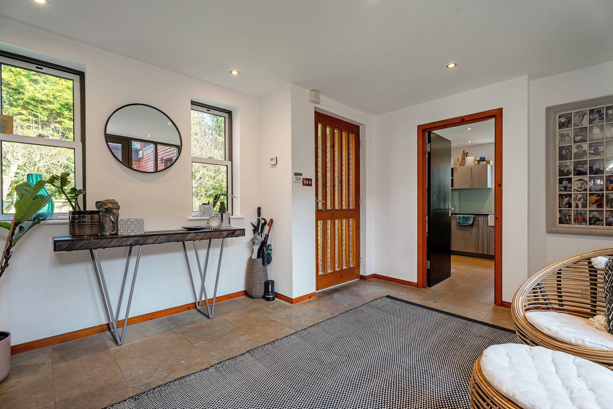 From the entrance hall with vaulted ceiling and glass wall you can access all the main living accommodation surrounding the central courtyard.