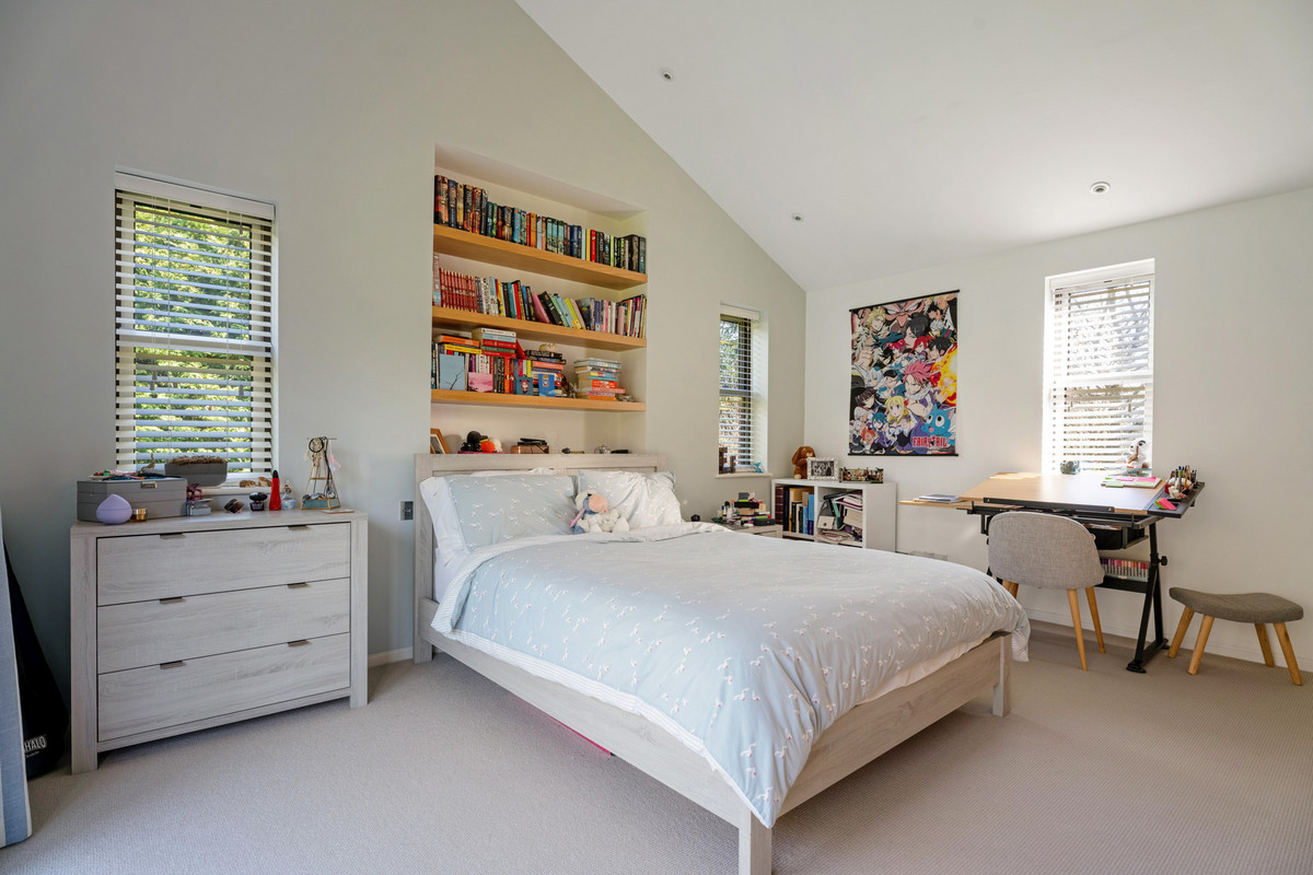 The expansive drawing room has an open fireplace, doors to the garden and a double height ceiling. Next door is the study/office.