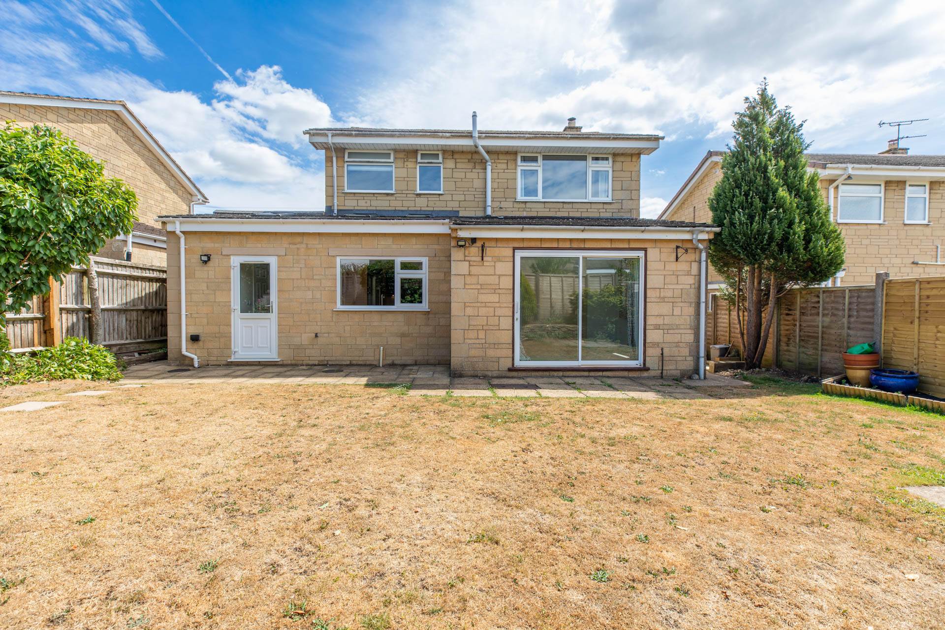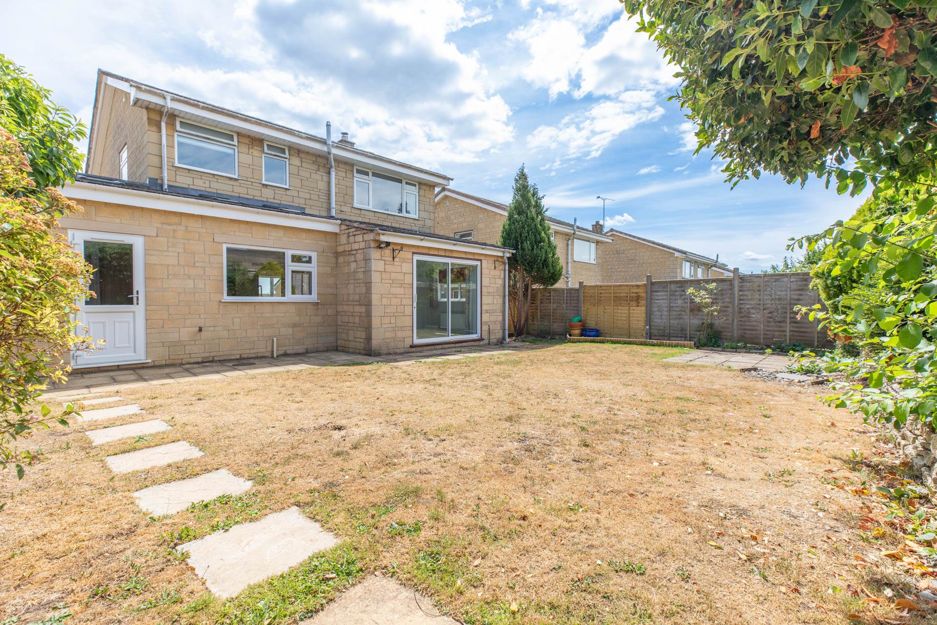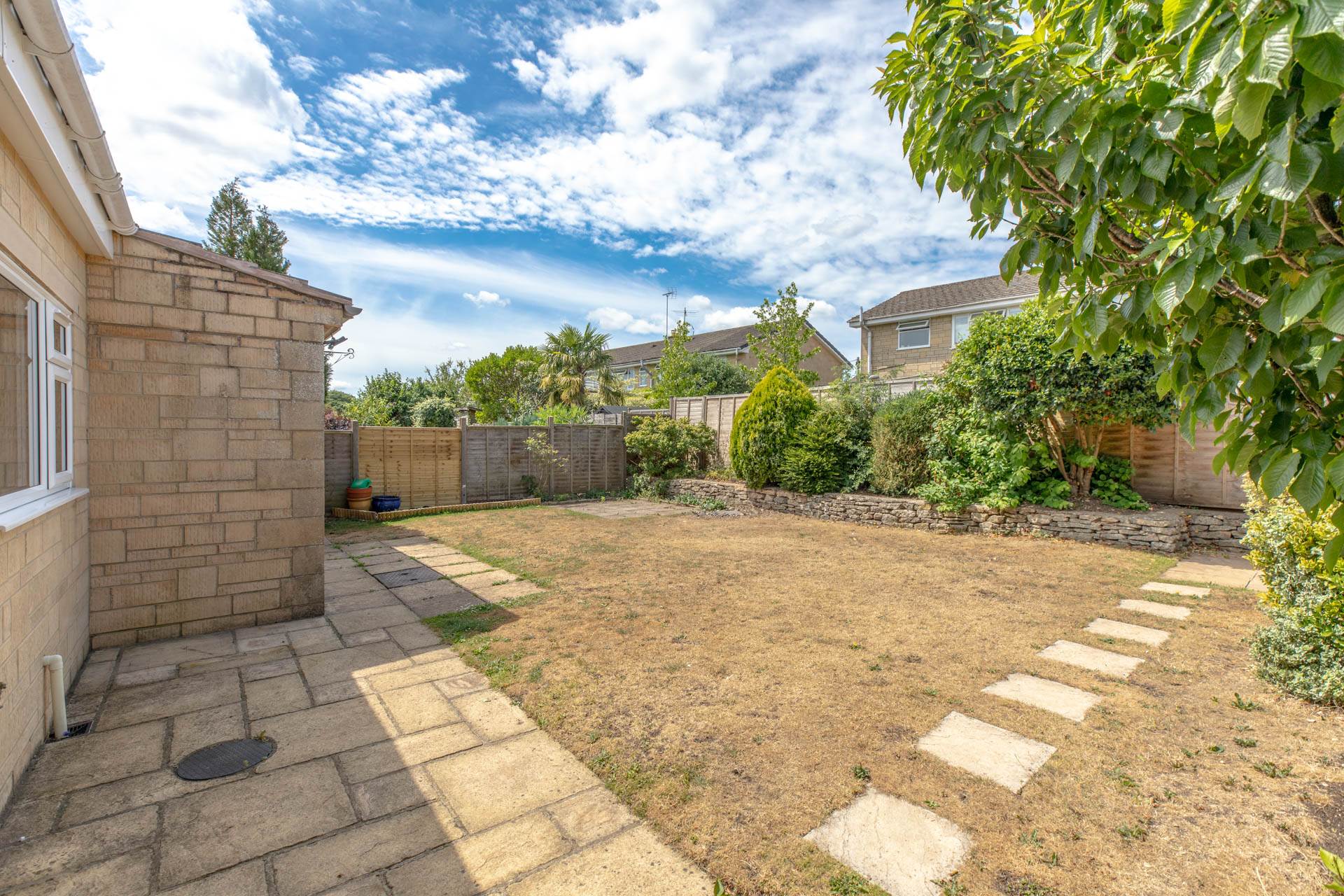 The rear garden is primarily laid to lawn and features mature planting, young trees, and raised Cotswold stone borders. A paved patio area and security lighting create an inviting space for both entertaining and peaceful reflection, all within a secure and private setting.